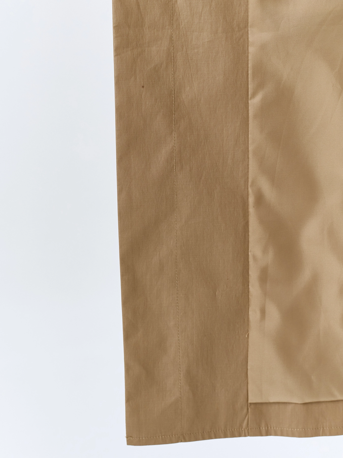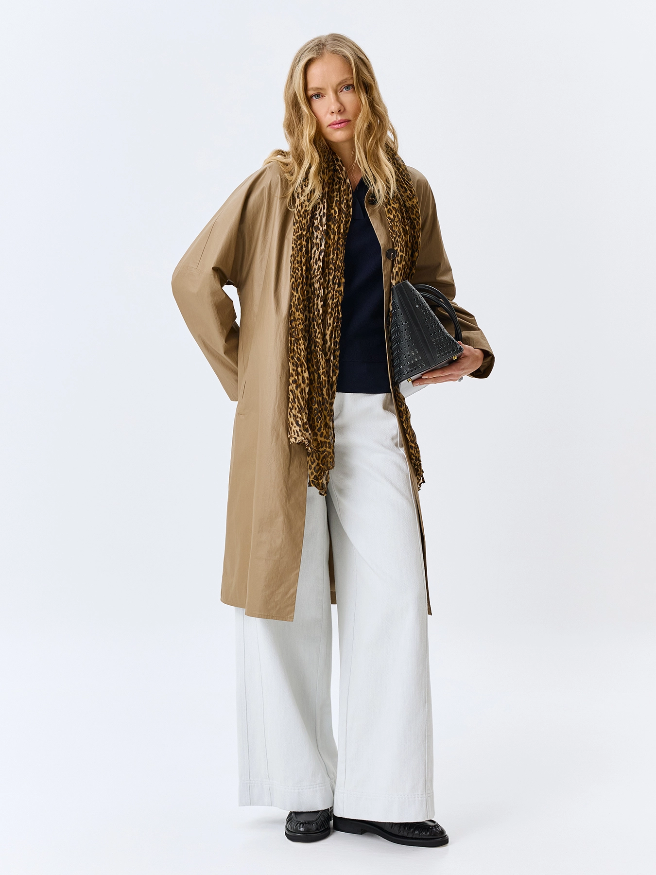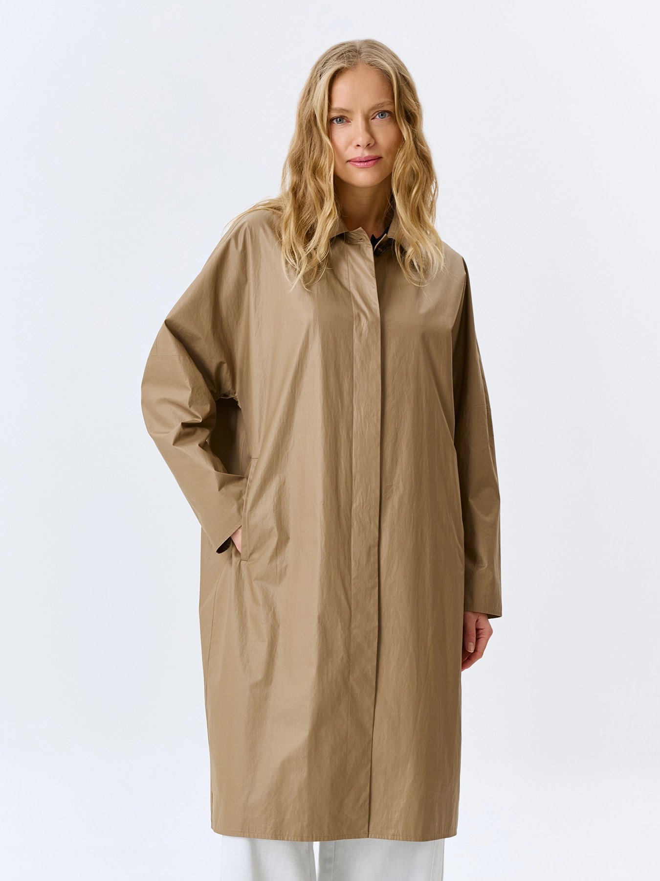Минималистичный плащ из 100% хлопка с напылением. Свободный силуэт. Отложной воротник. Длинные свободные цельнокроенные рукава. Боковые карманы с листочками. Застежка на пуговицы, скрытые планкой. Дополнен акцентной шлицей по спинке.