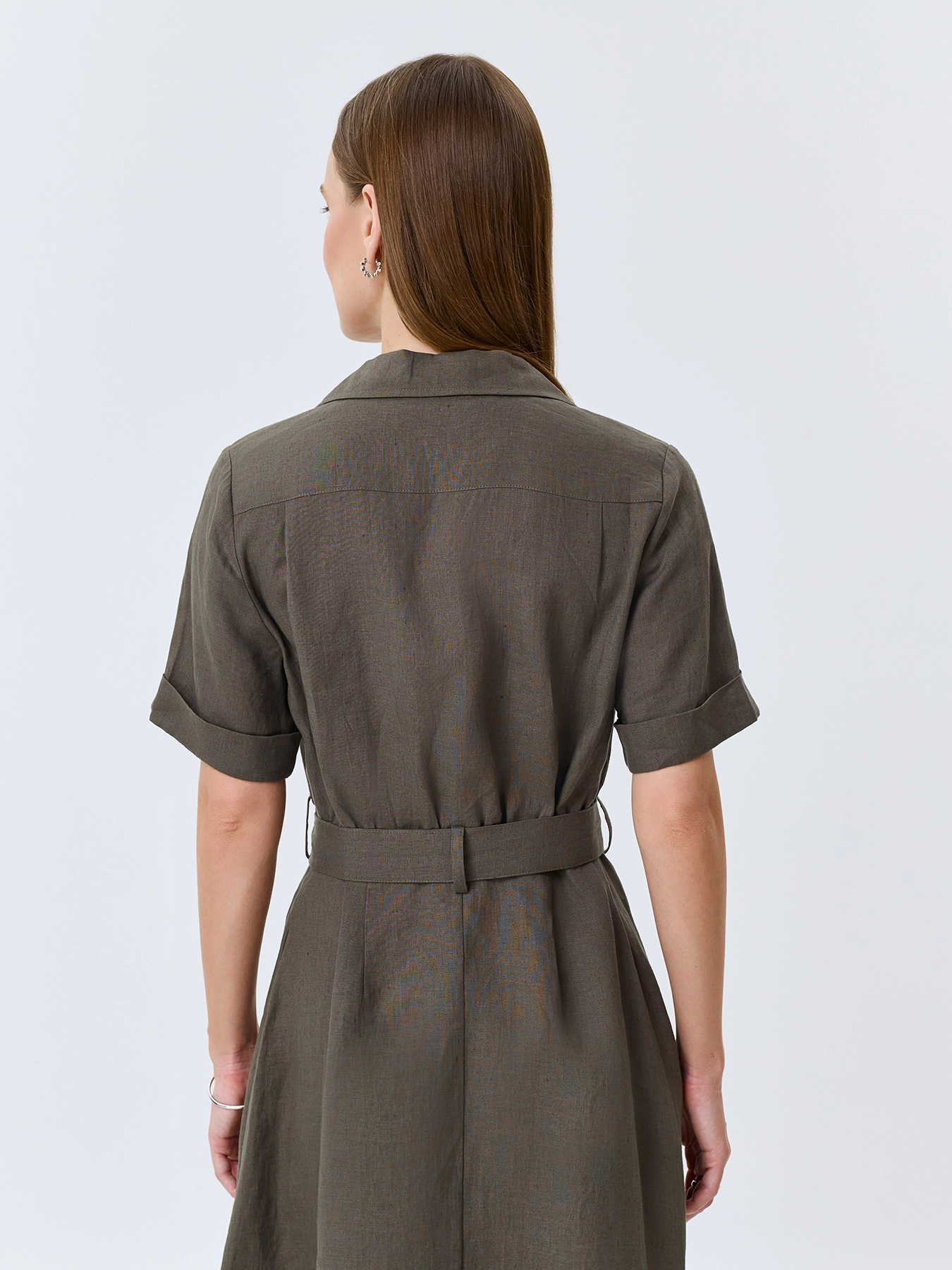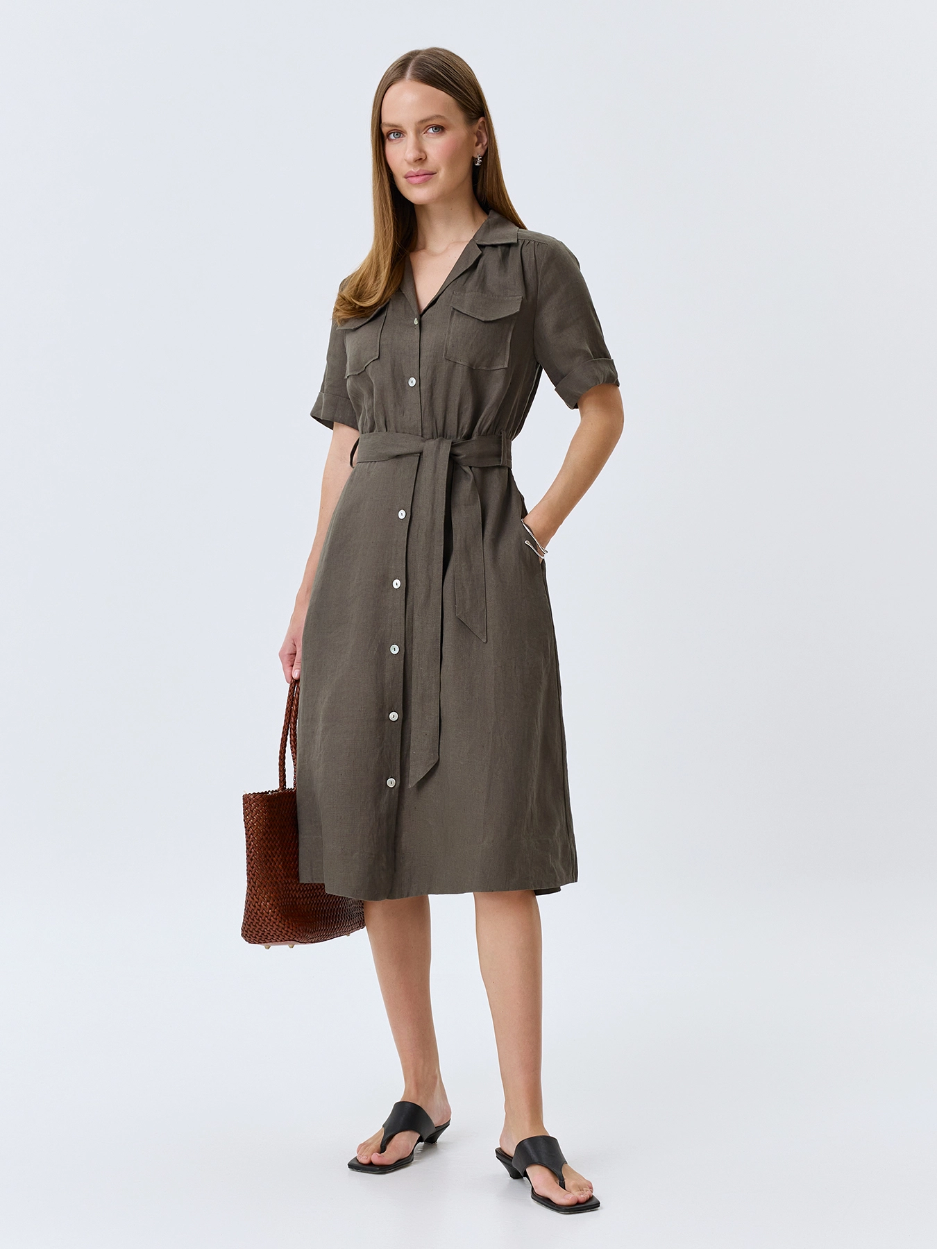Платье-рубашка в колониальном стиле из 100% льна. Длина миди. Приталенный силуэт дополнен поясом. Классический английский воротник. Застежка на пуговицы. Укороченные широкие втачные рукава с манжетами по низу. Боковые карманы в швах. Накладные нагрудные карманы с клапанами.