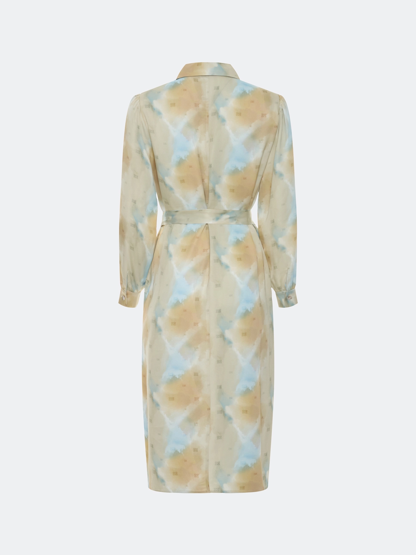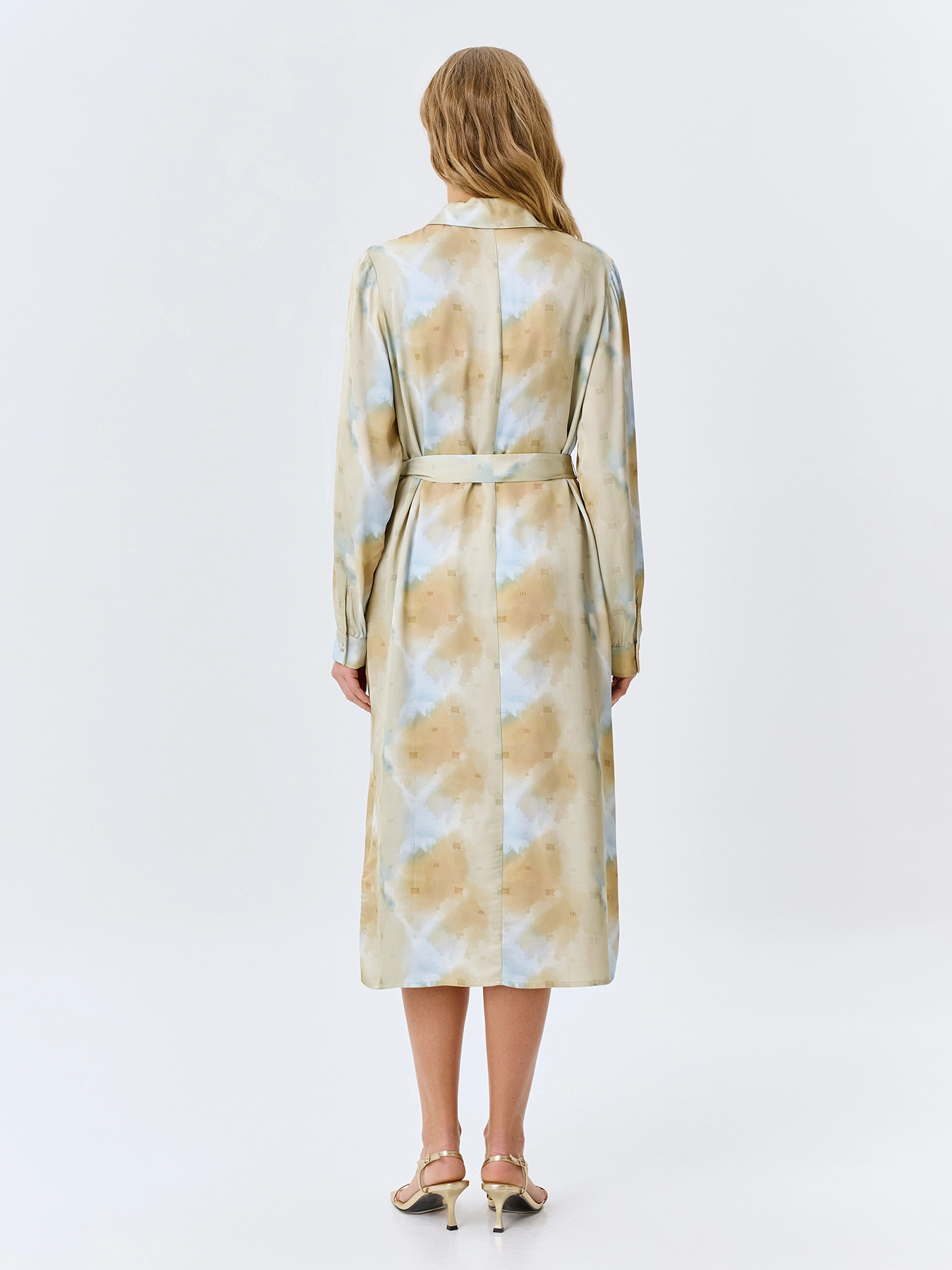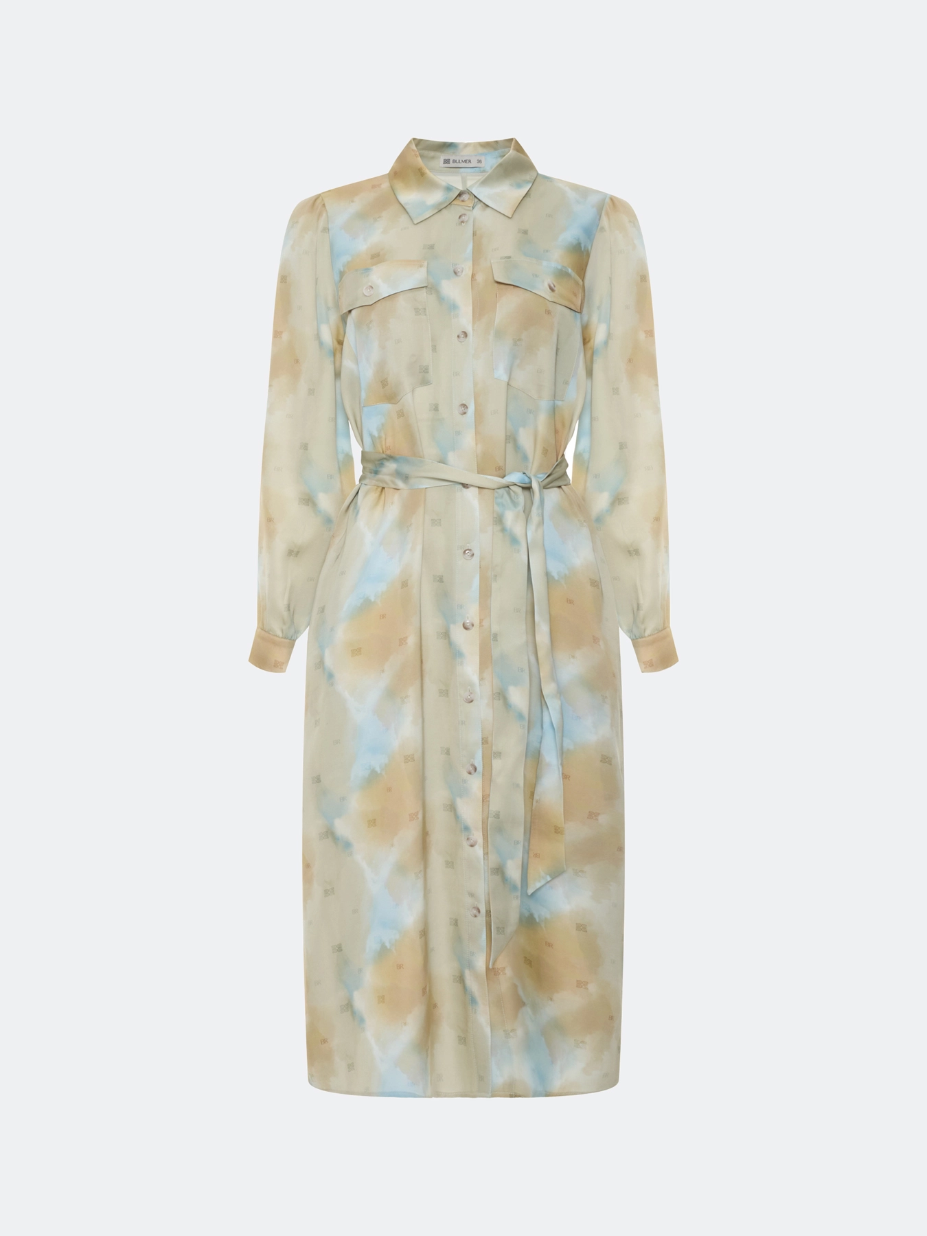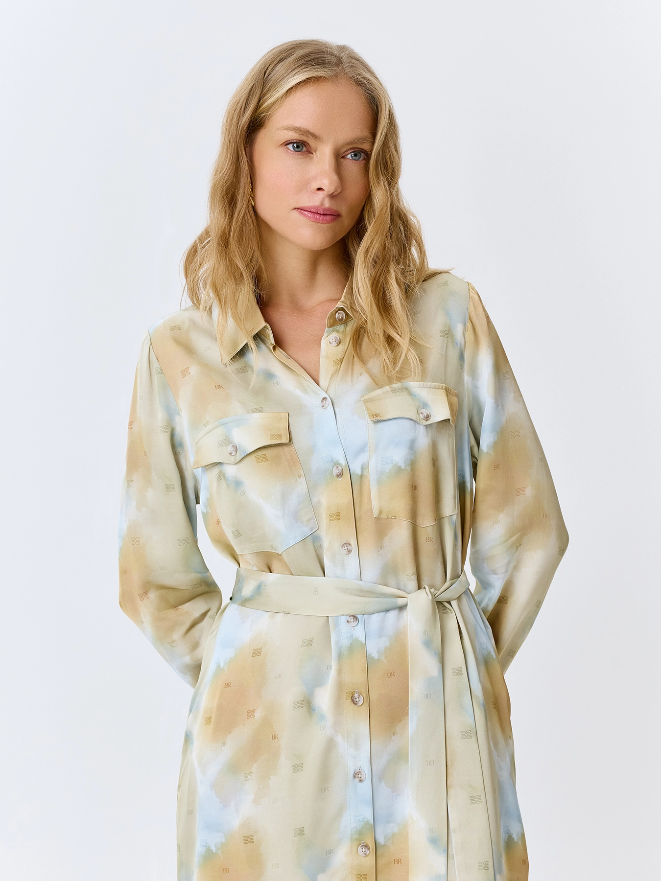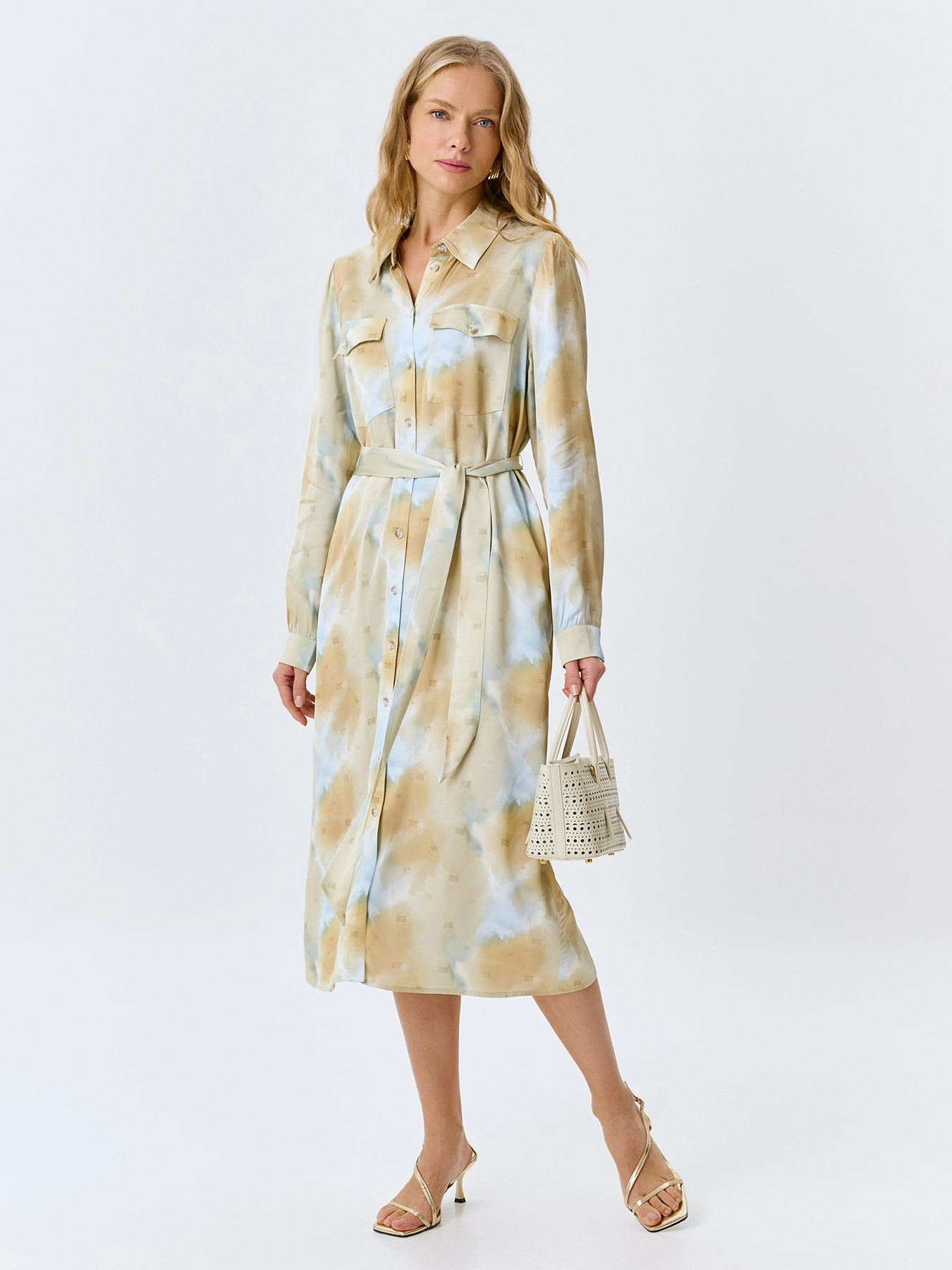 Платье-рубашка с абстрактным принтом из 100% вискозы. Длина миди. Прямой силуэт можно приталить текстильным поясом. Отложной воротник. Застежка на пуговицы. Накладные нагрудные карманы с клапанами на пуговицах. Боковые карманы в швах.