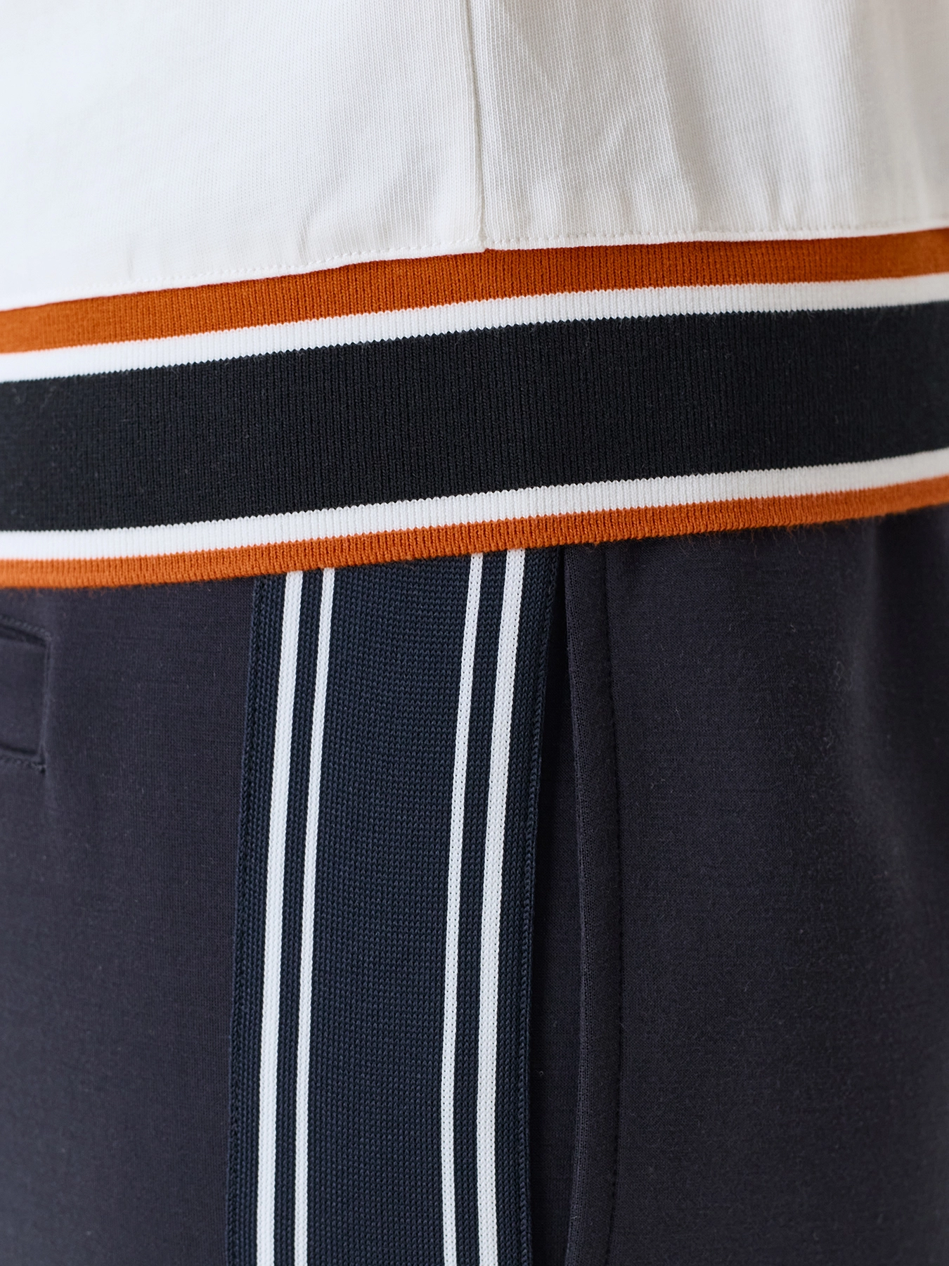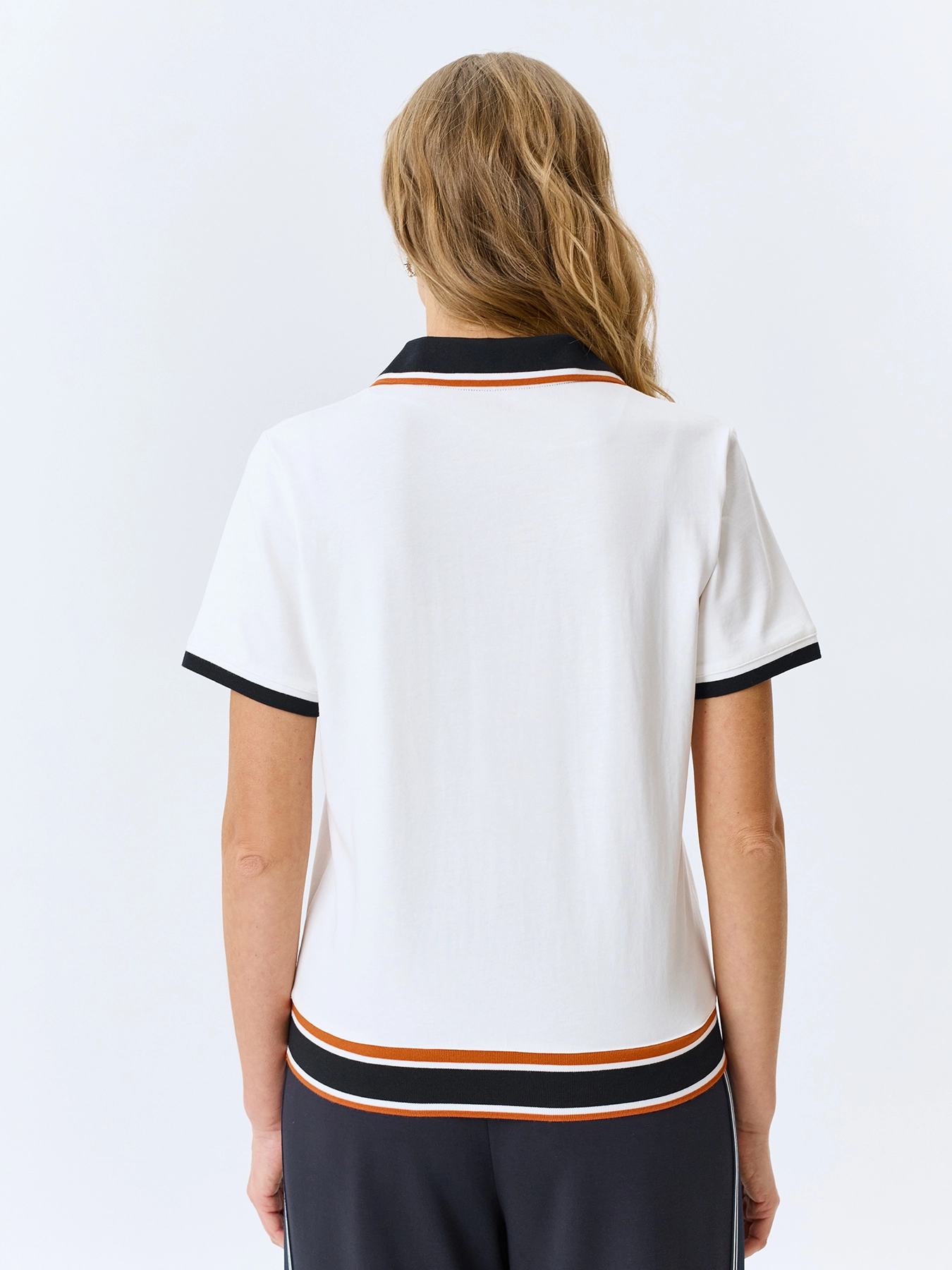 Трикотажная футболка-поло из мерсеризованного хлопка. Прямой силуэт. Отложной воротник-поло. Короткие втачные рукава. Контрастный риб по воротнику, низу рукавов и изделия. Дополнен контрастной вышивкой.