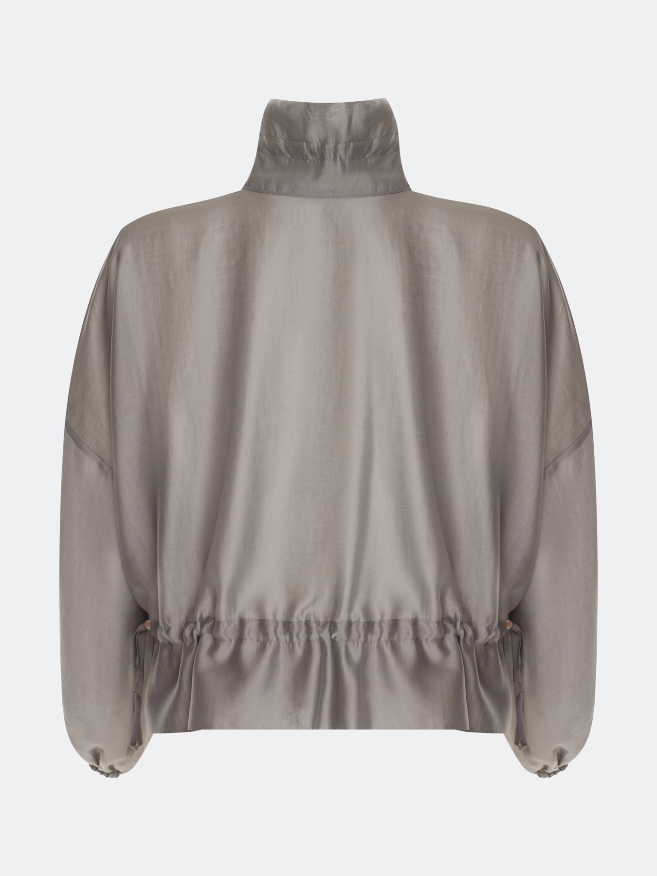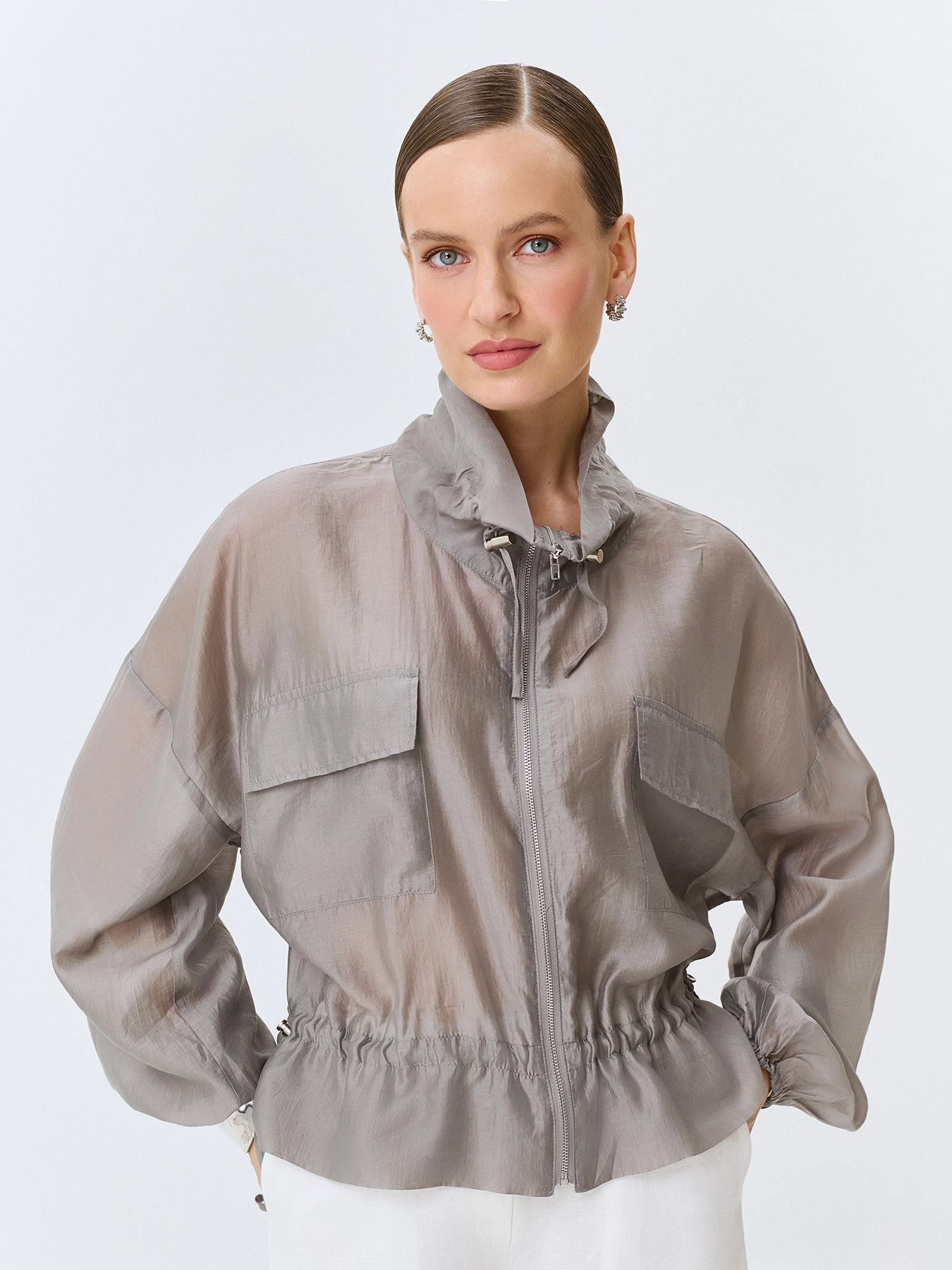 Полупрозрачный тонкий жакет из тенселя. Свободный силуэт. Высокий воротник стойка дополнен утяжниками. Застежка на молнию. Спущенная линия плеч и длинные рукава с резинкой по низу. Накладные боковые карманы с клапанами. Дополнен кулисой по низу изделия.