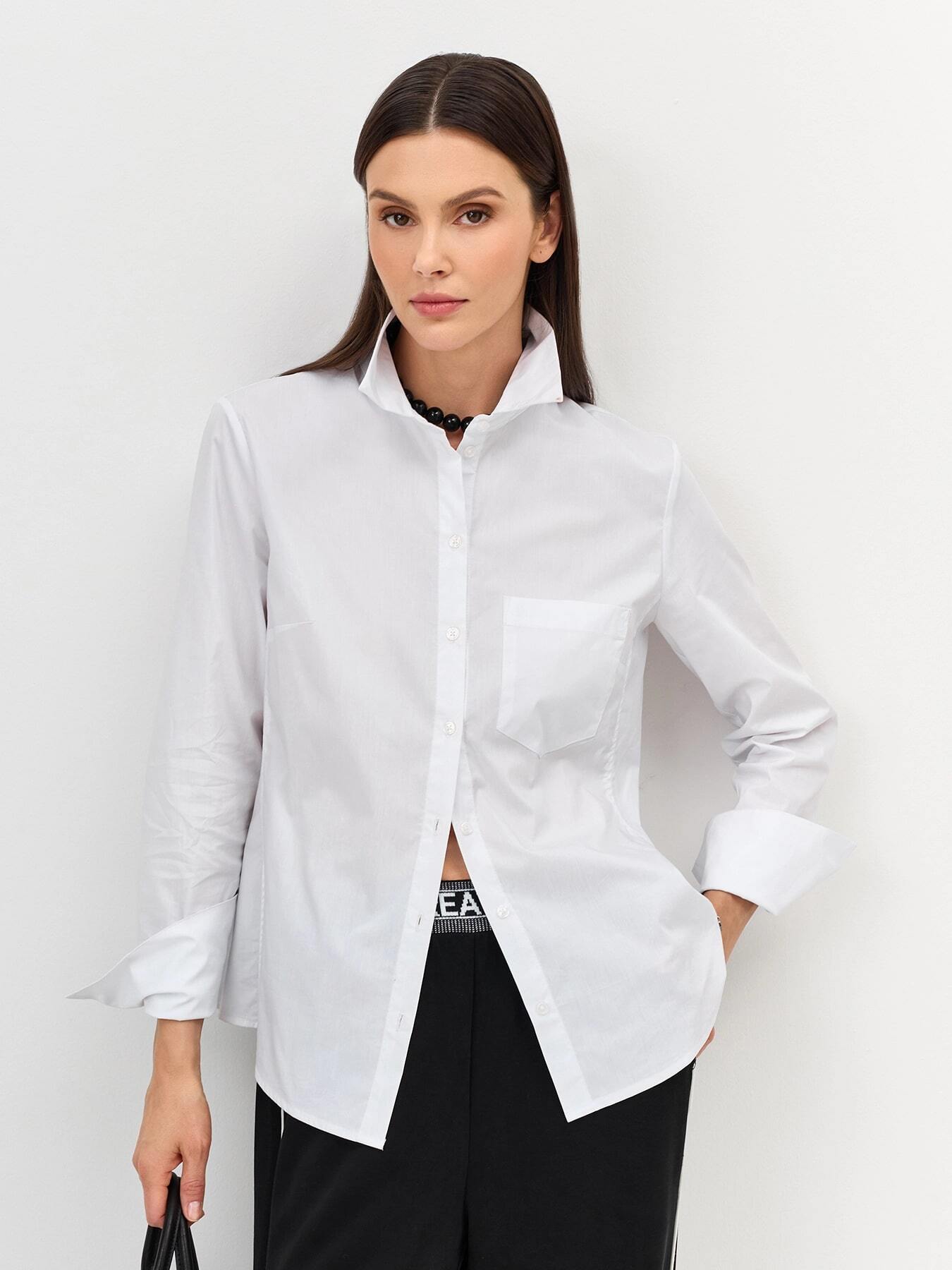 Приталенная рубашка из смесовой вискозы. Отложной воротник. Застежка на пуговицы. Втачной рукав. Широкие манжеты с декоративной пуговицей по низу. В составе спандекс.
