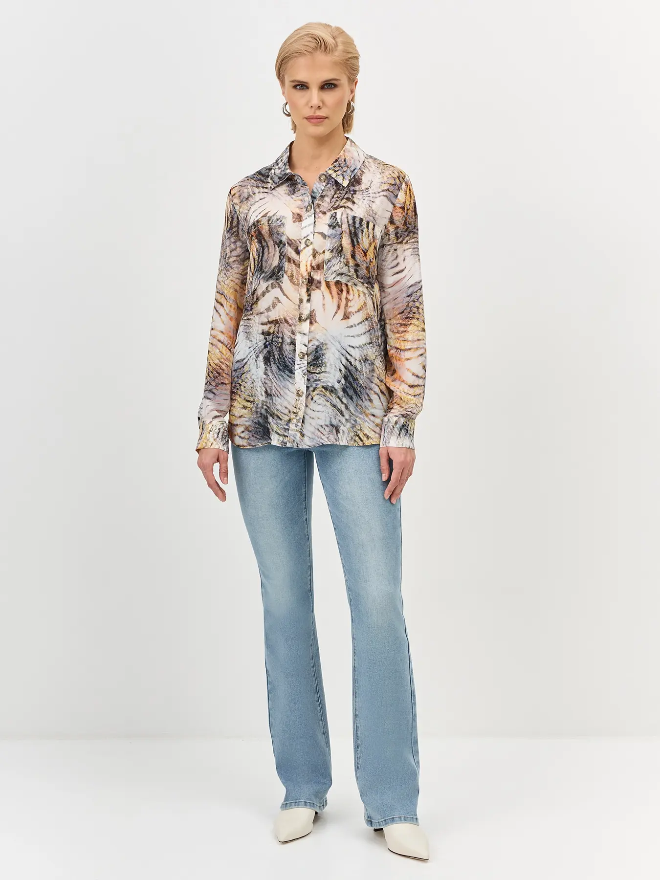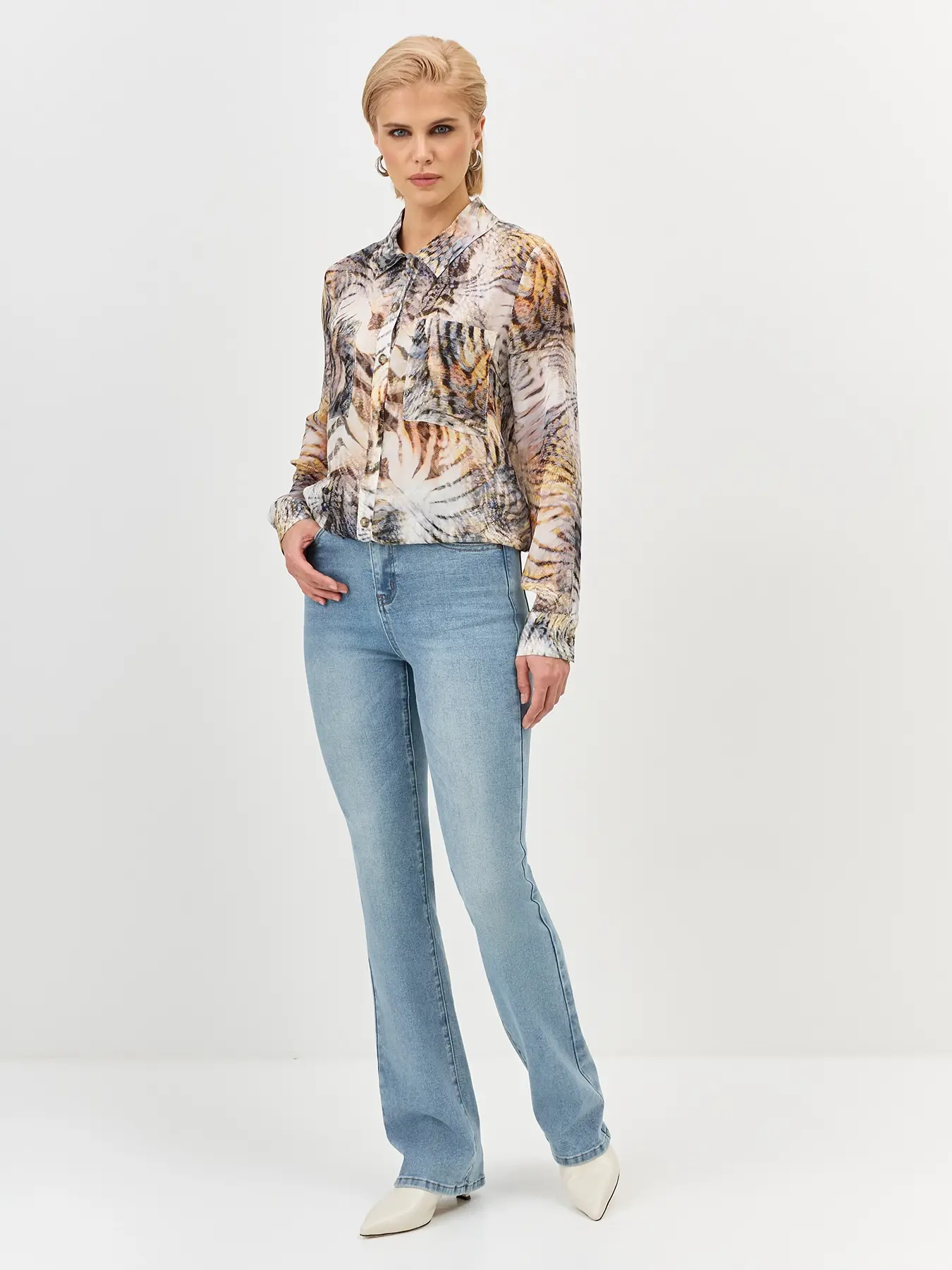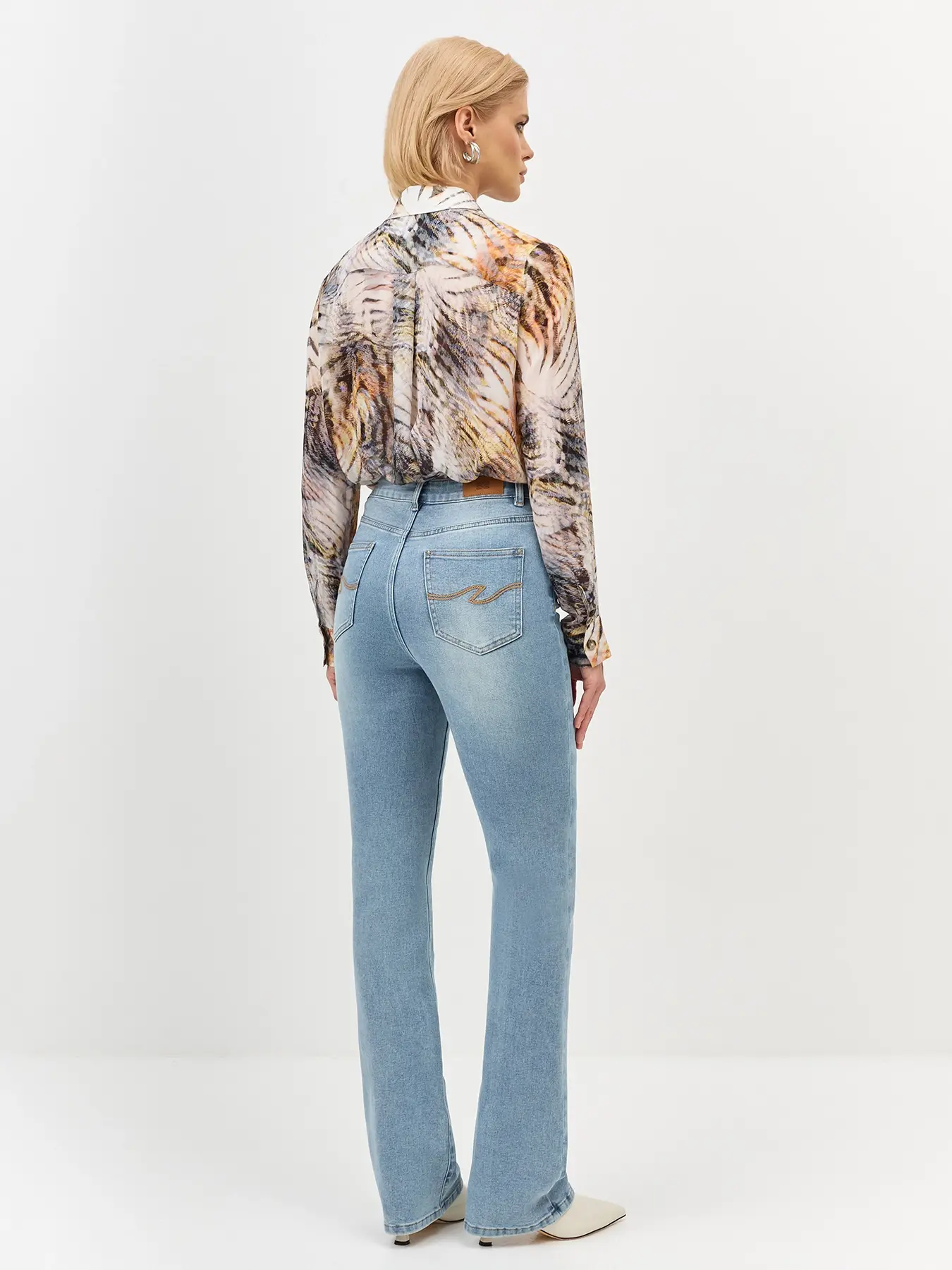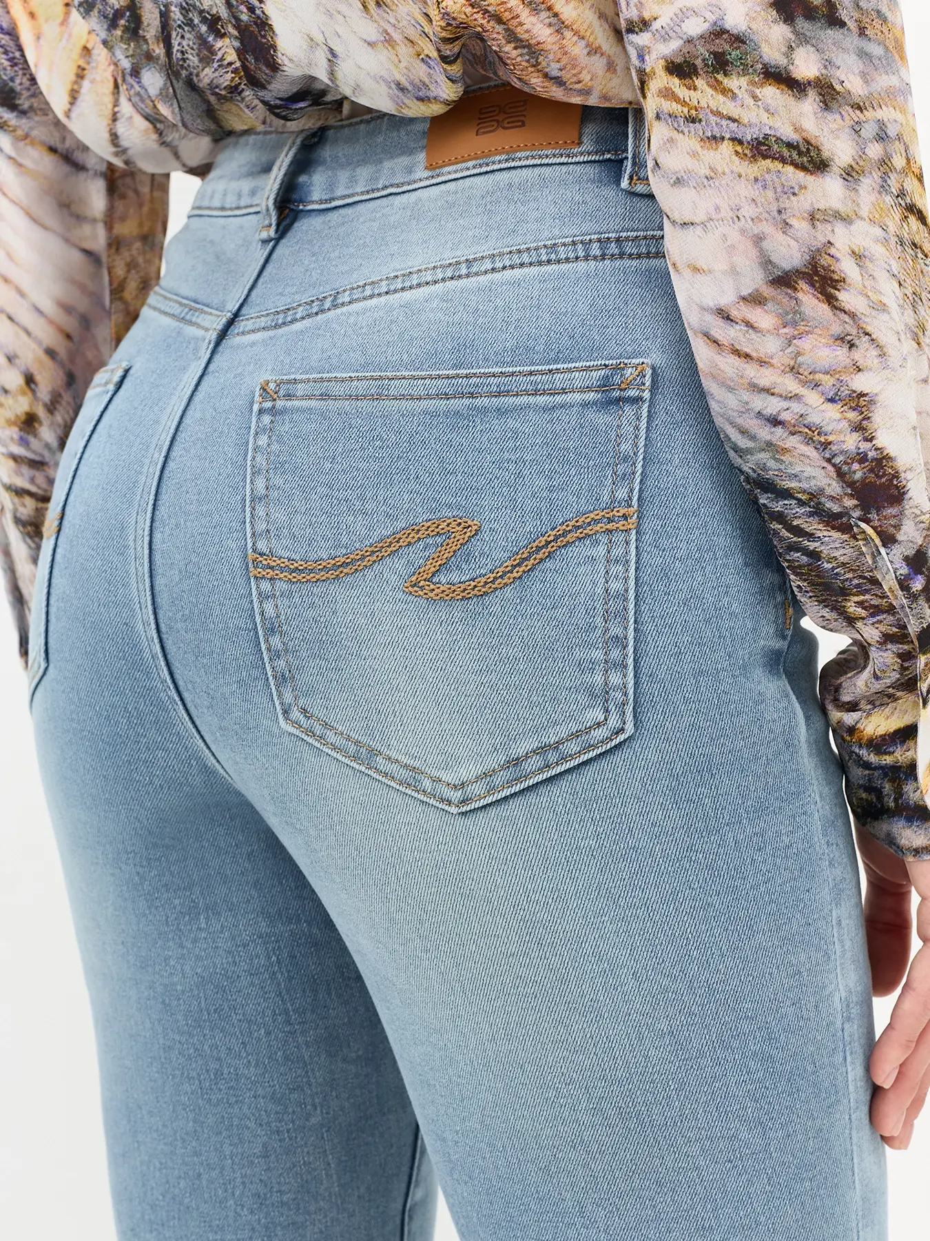 Прямые джинсы с деликатной вышивкой на задних карманах. Прямой силуэт. Застежка на молнию и металлическую пуговицу. Пять карманов. В составе спандекс.