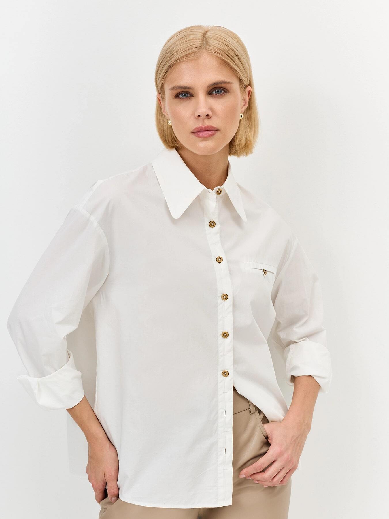Oversize рубашка из 100% хлопка. Свободный силуэт. Отложной воротник. Застежка на контрастные пуговицы, частично скрытые планкой. Спущенная линия плеч.