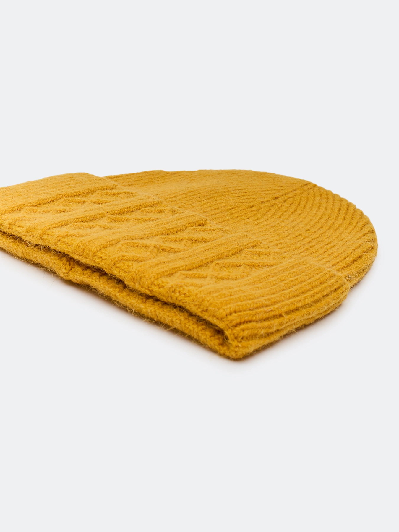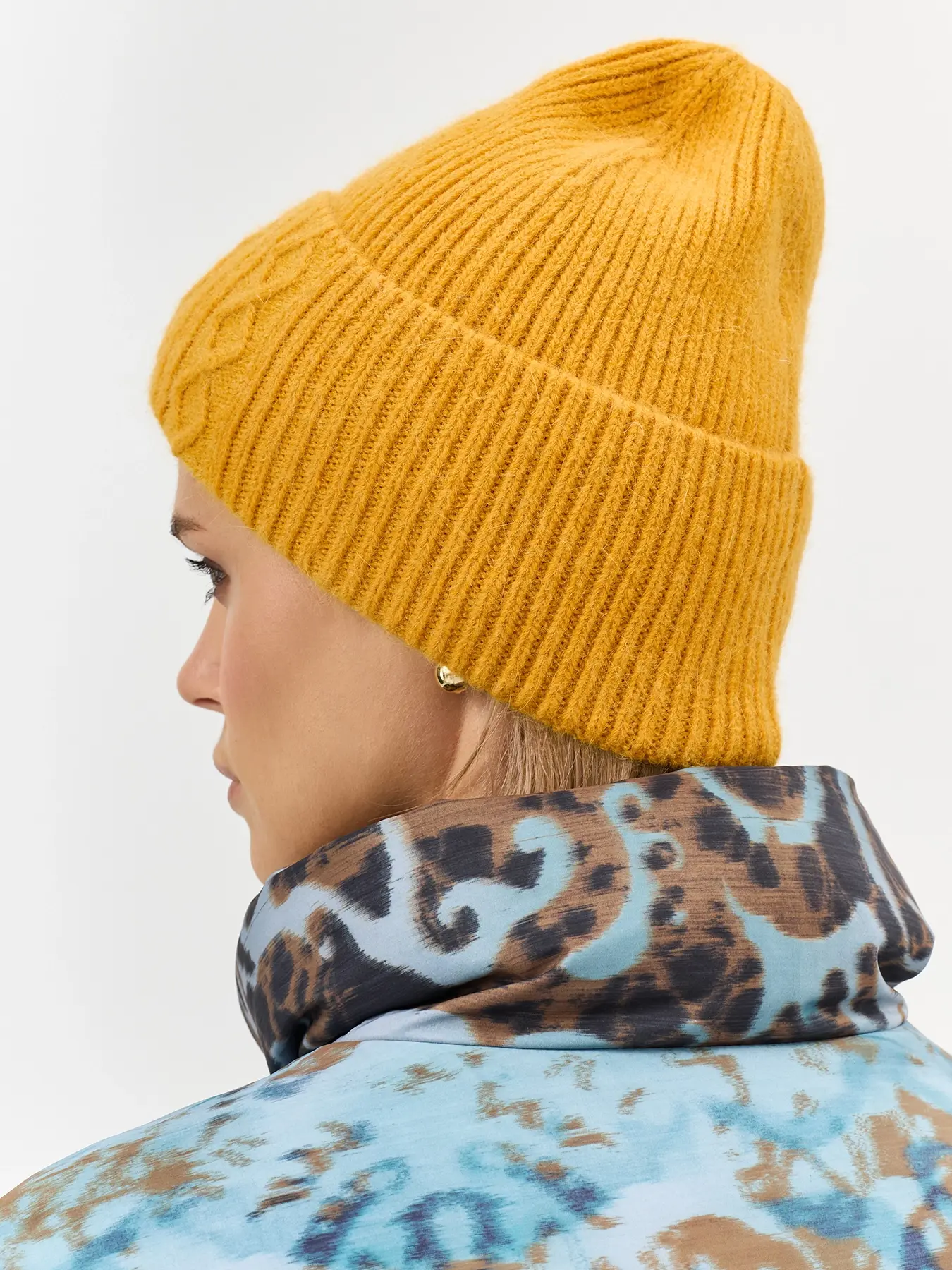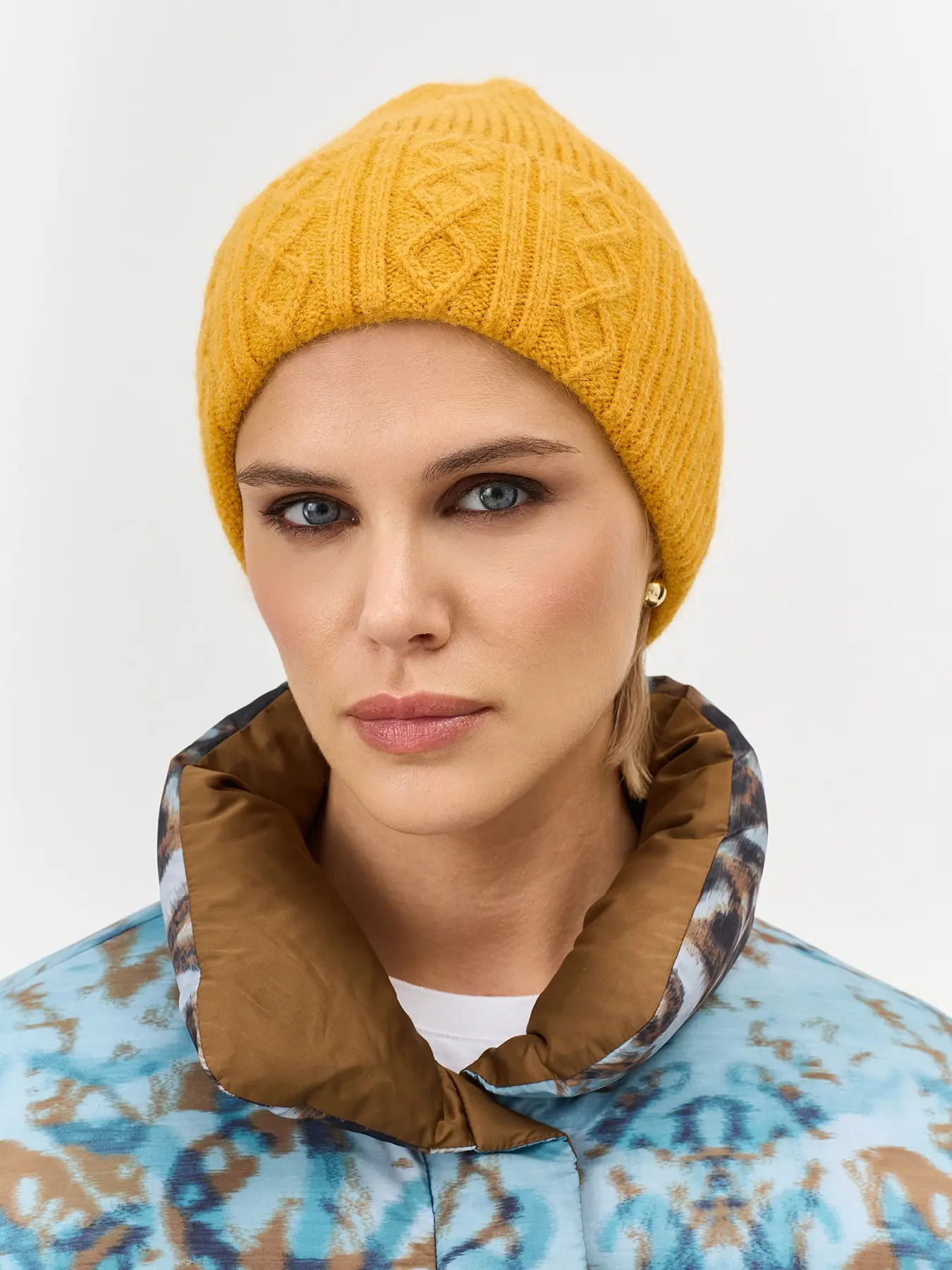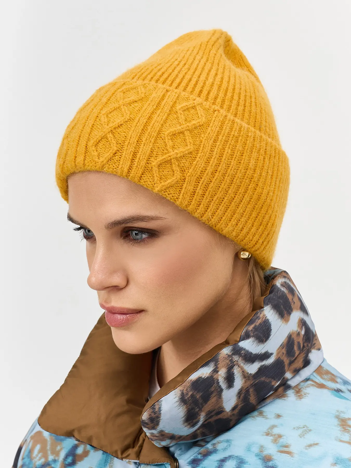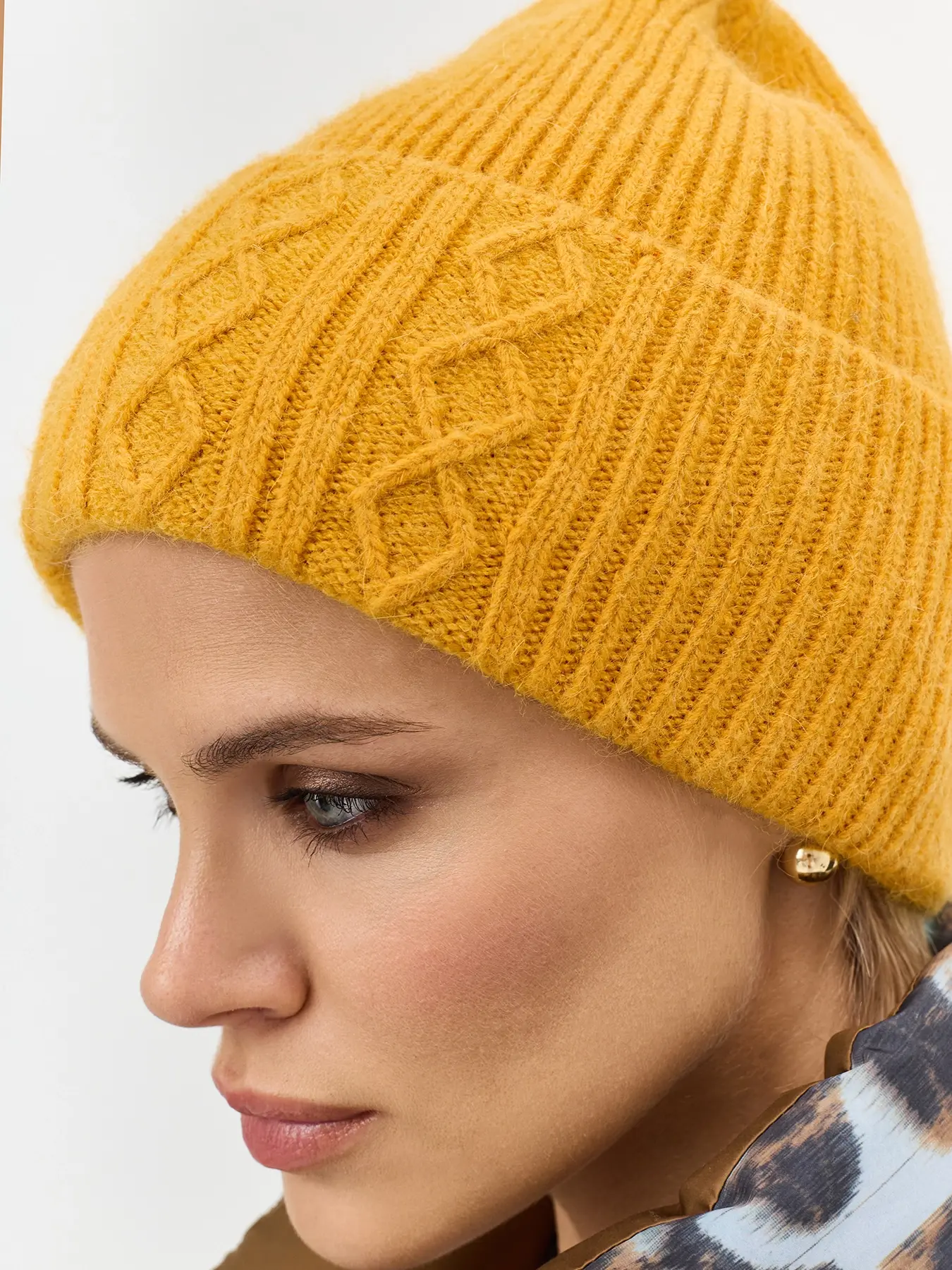 Шапка бини с декором "косы". Отделка в тонкий рубчик. Дополнена широким отворотом. В составе ангора и вискоза.