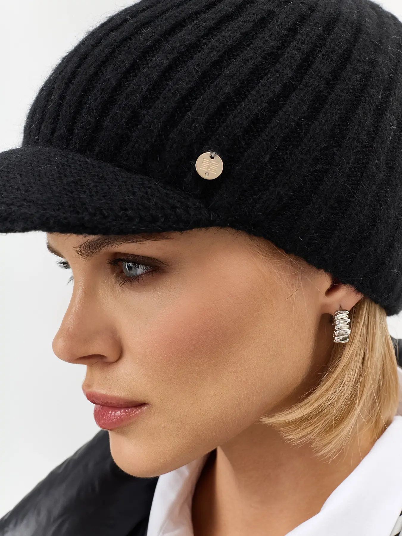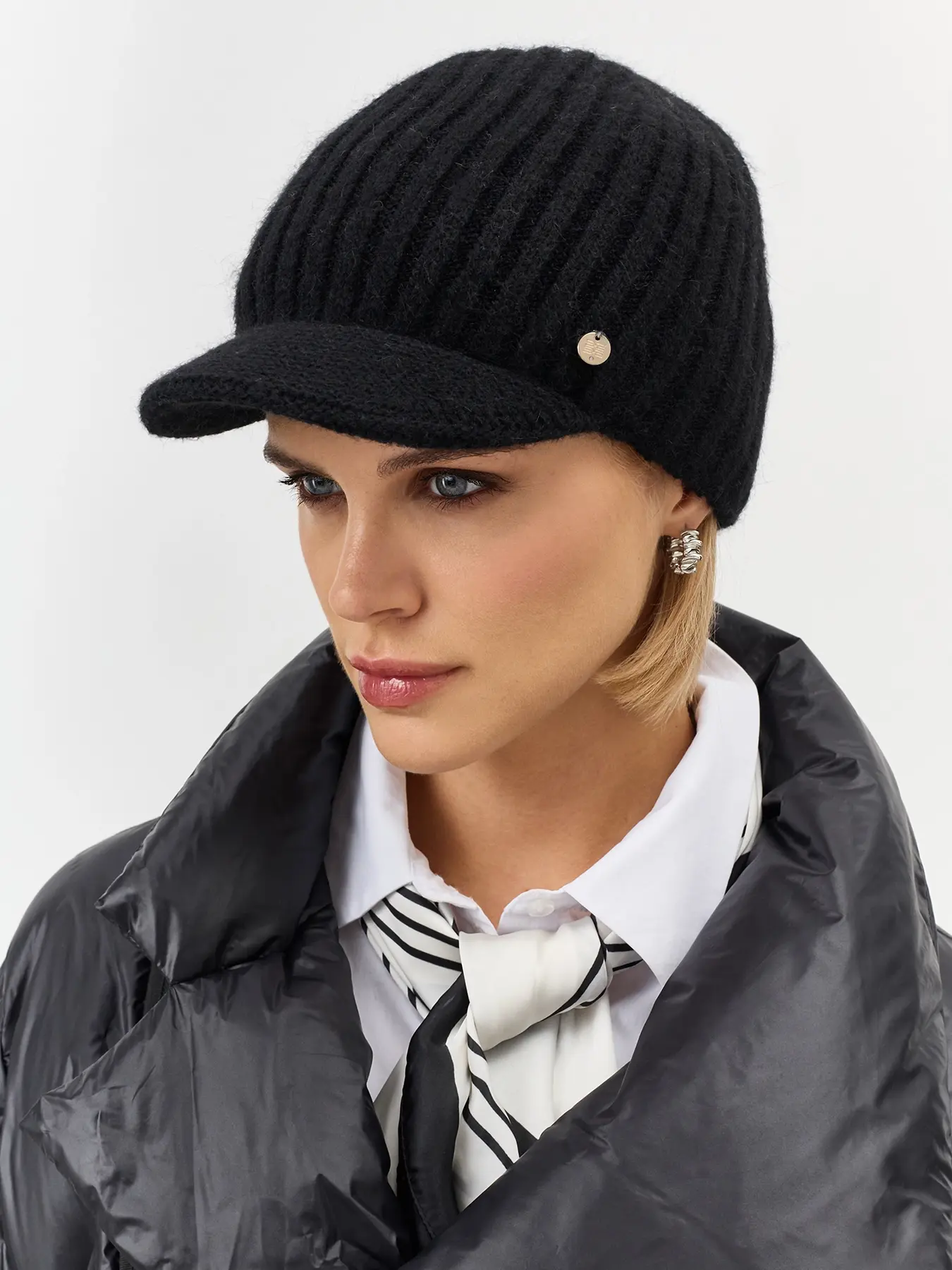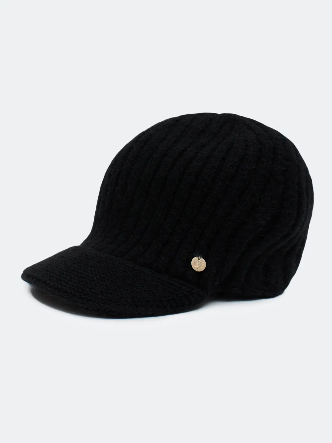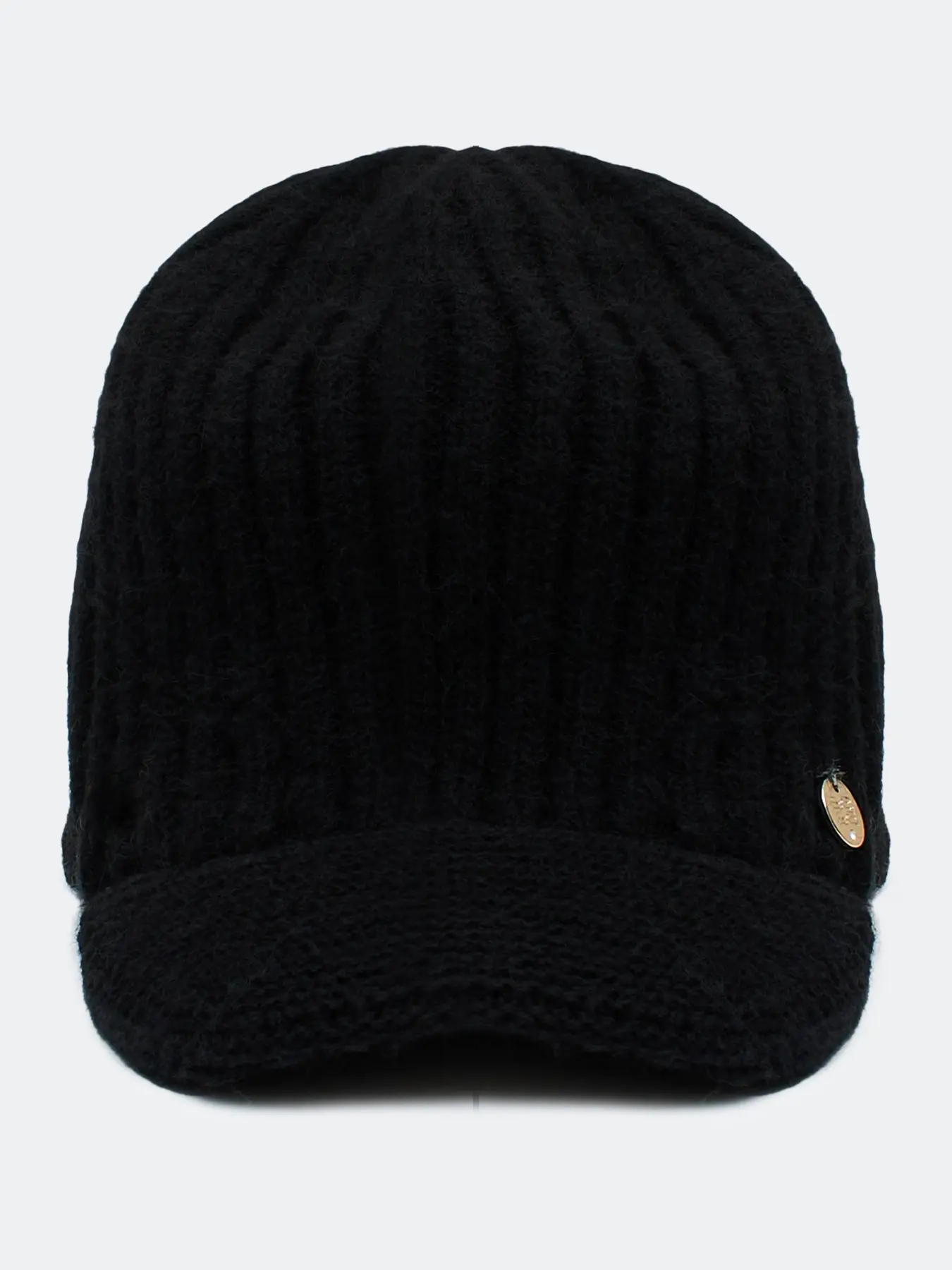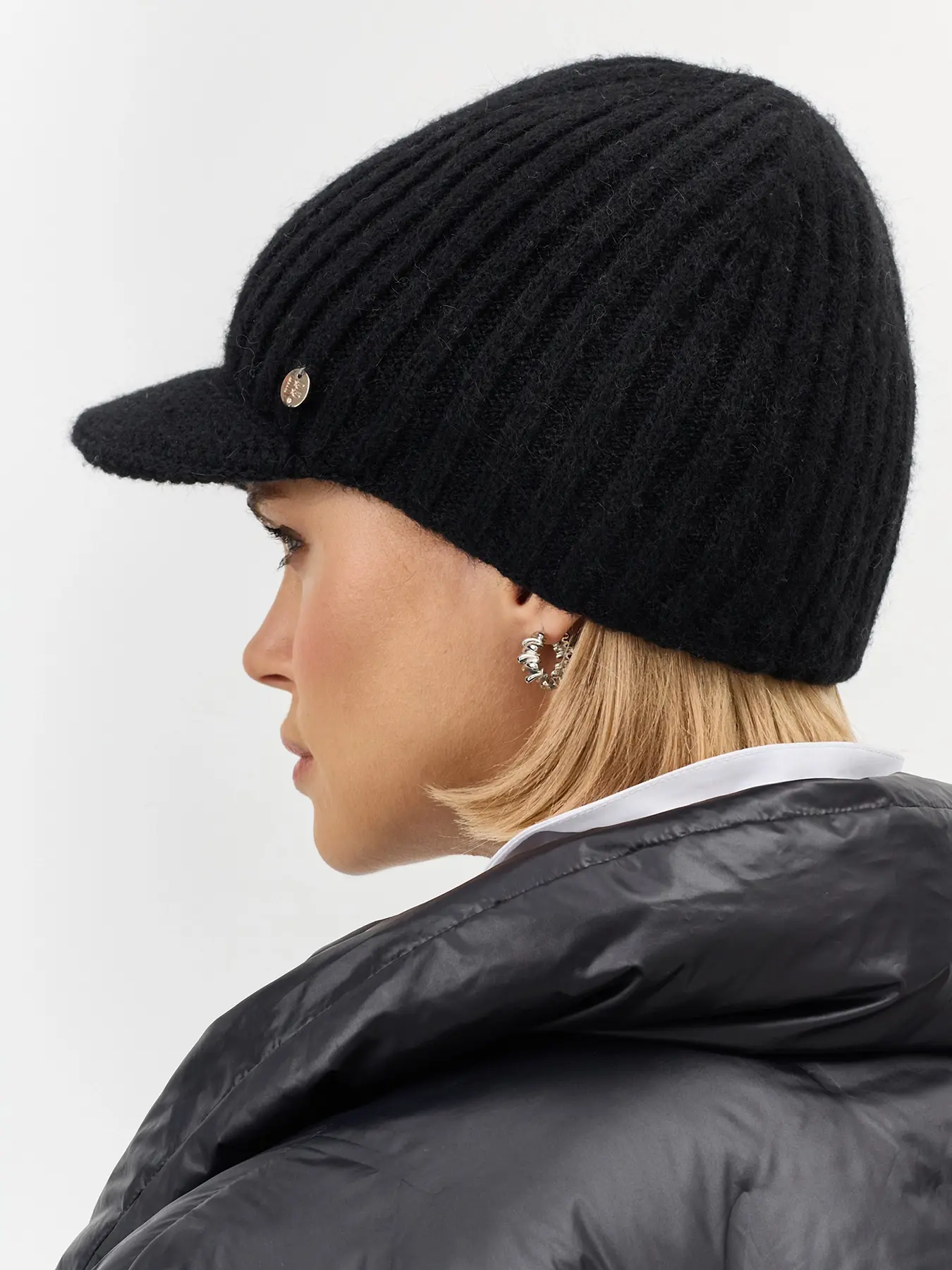 Шапка с козырьком в рубчик. Риб по внутренней стороне. Широкий изогнутый козырек. Дополнена минималистичным металлическим декором. В составе ангора.