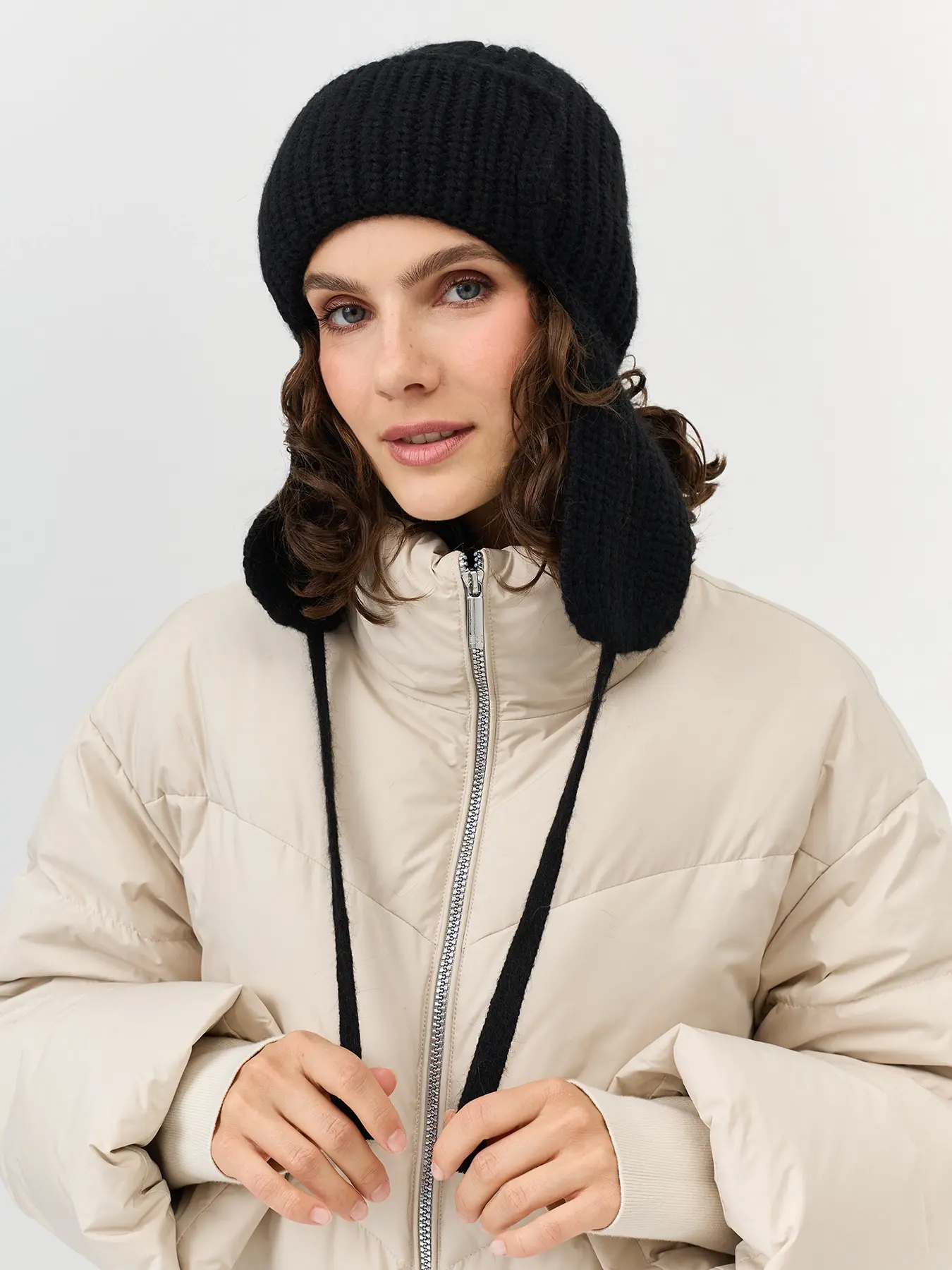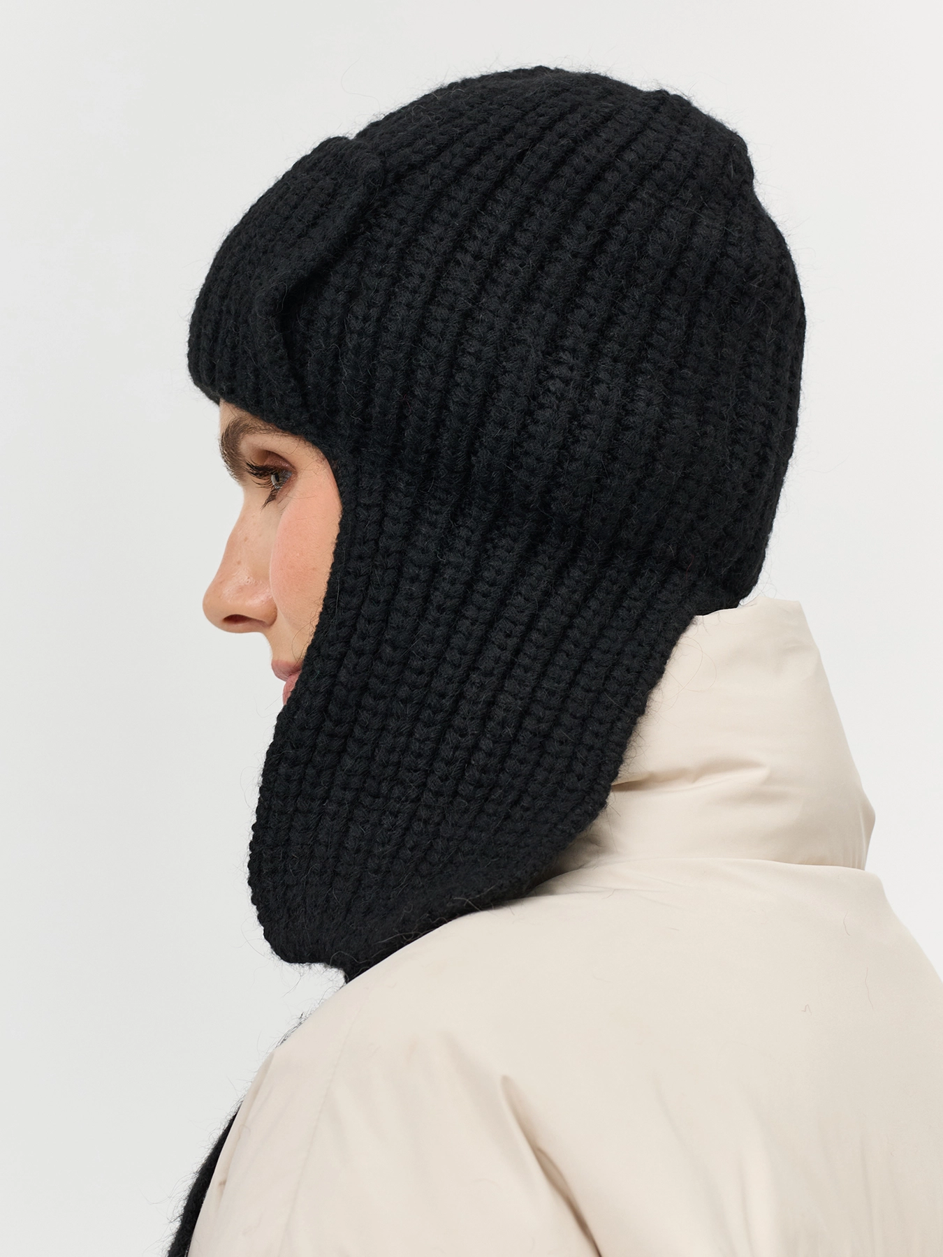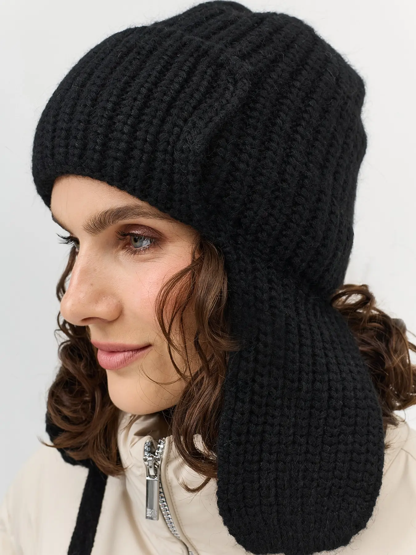 Теплая шапка-ушанка с тонкими завязками. Отделка в рубчик. Дополнена широким отворотом. В составе ангора.