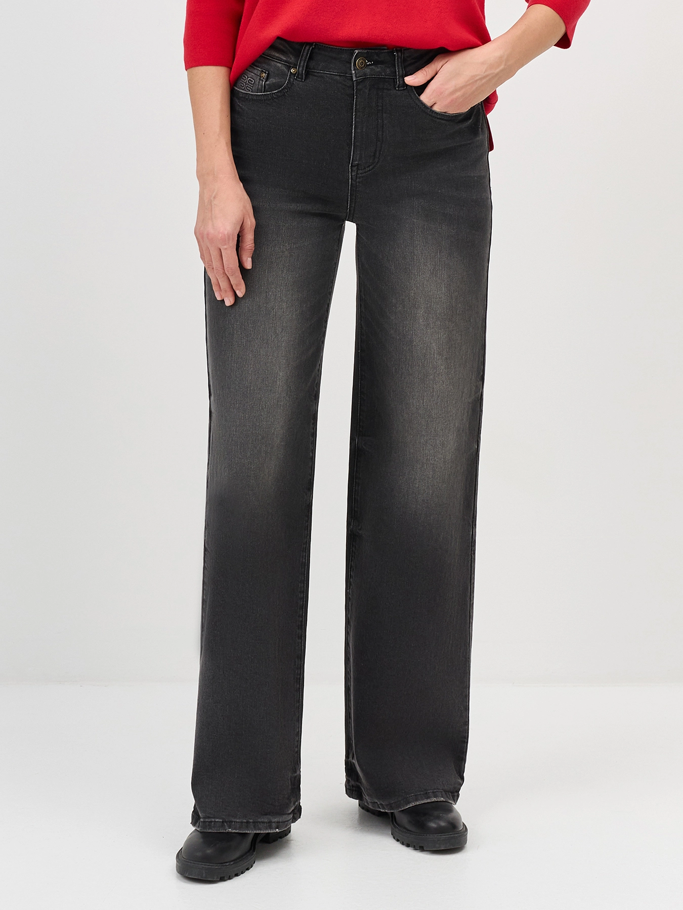 Широкие  джинсы прямого силуэта. Застежка молния и металлическая пуговица. Пять карманов. Дополнены деликатной варкой. В составе спандекс.