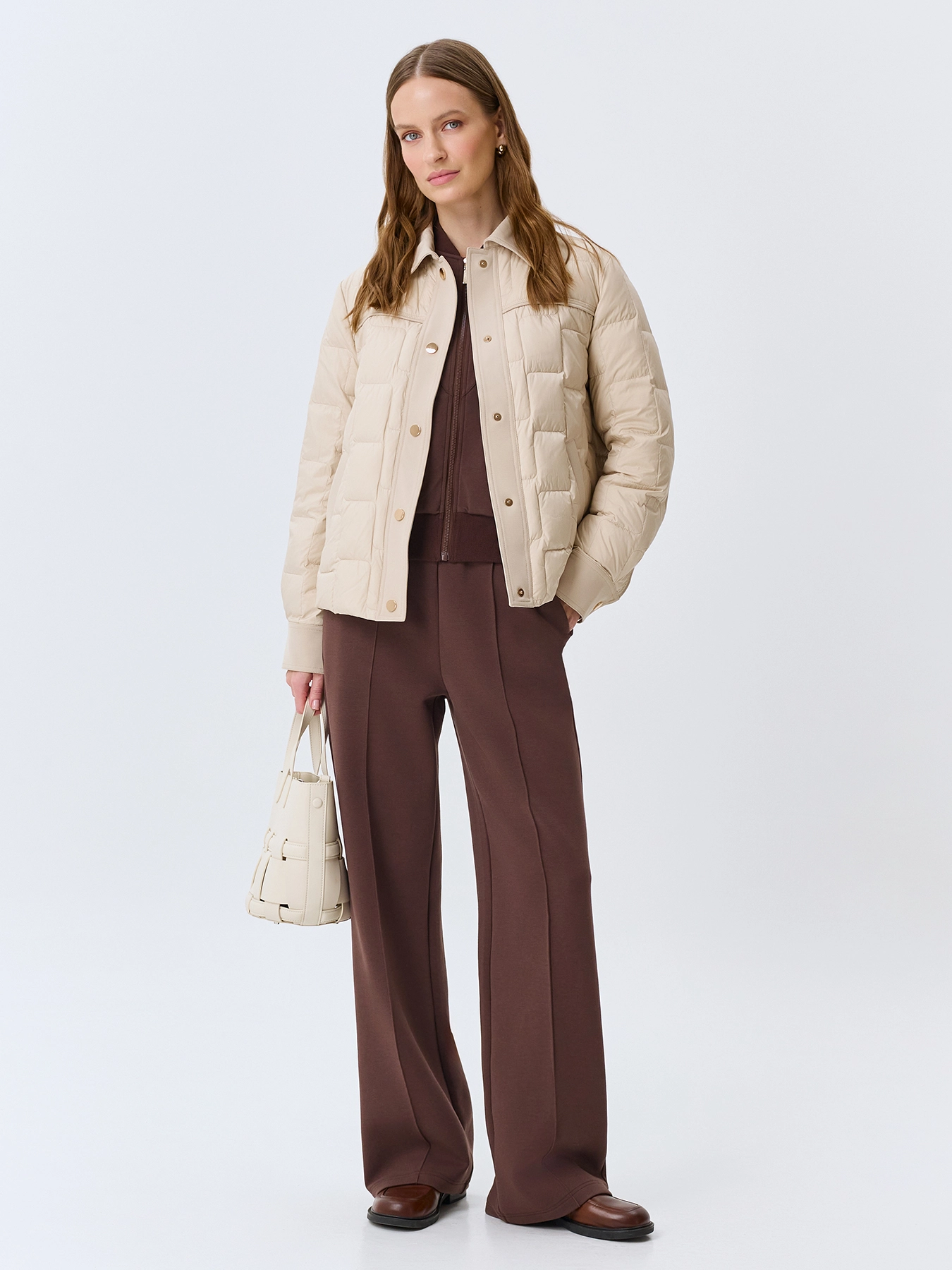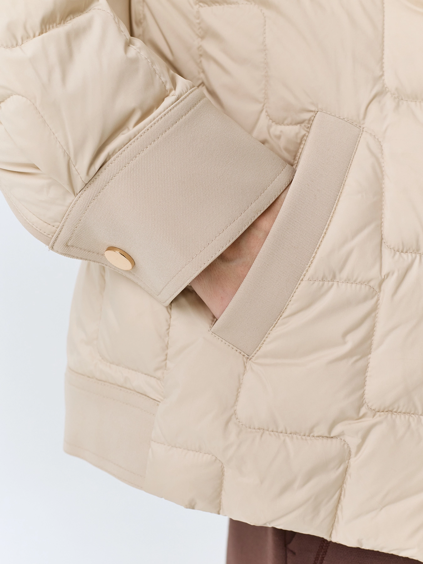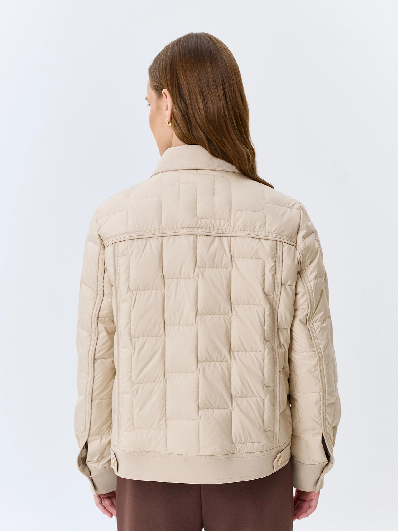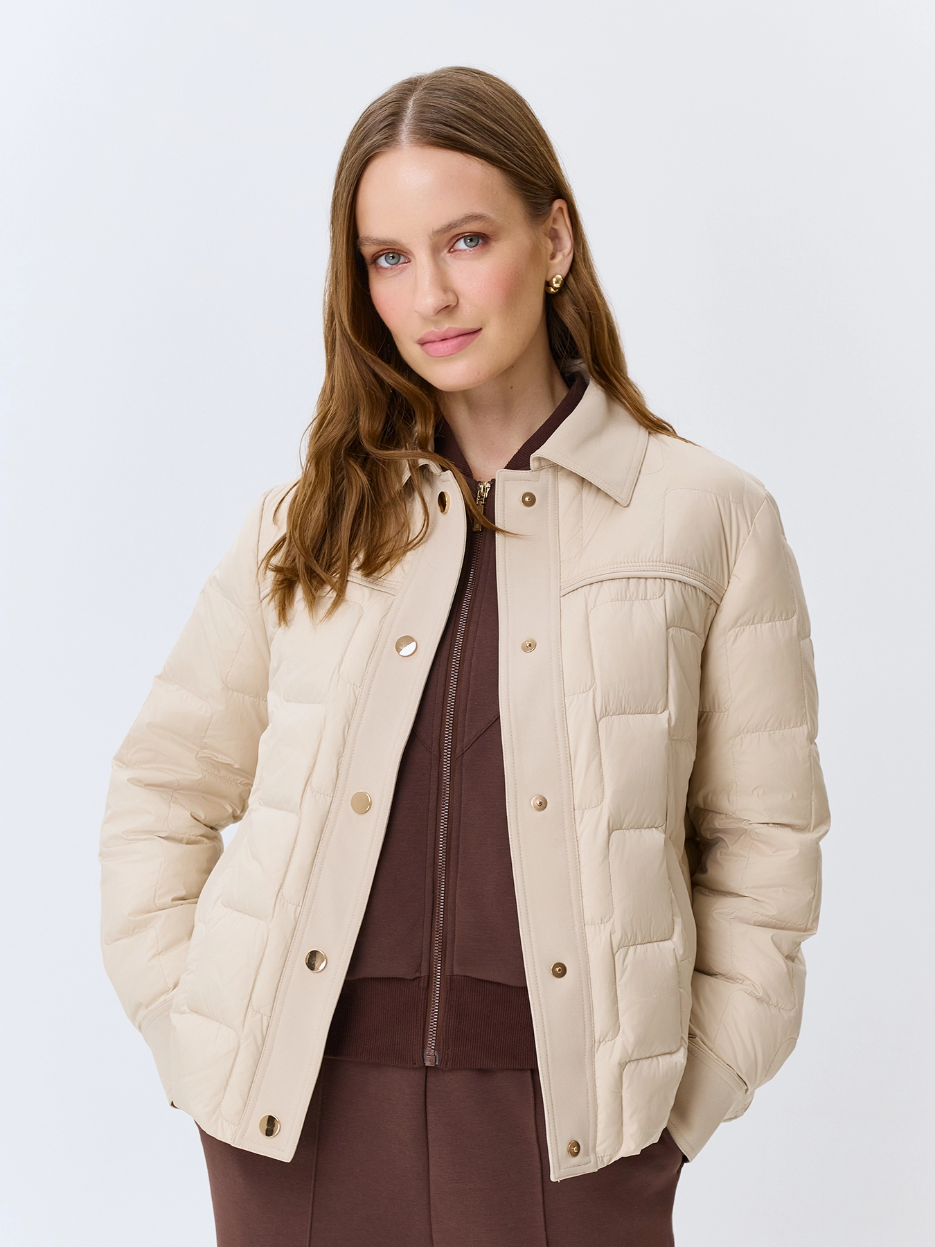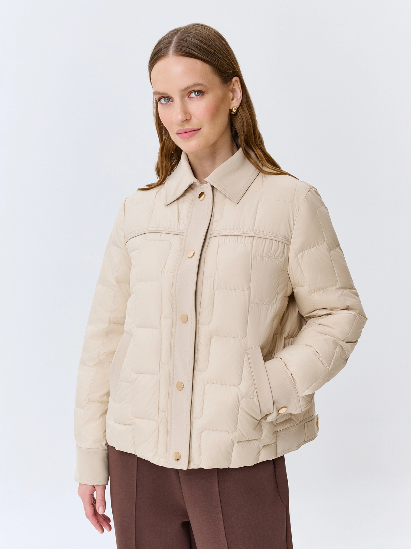 Куртка с квадратной графичной стежкой на натуральном утеплителе. Прямой силуэт. Застежка на кнопки. Отложной воротник. Боковые карманы с листочками. Воротник, планка, манжеты рукавов и отделка карманов- из гладкого плотного текстиля. Кнопки на манжетах и хлястиках по низу изделия.