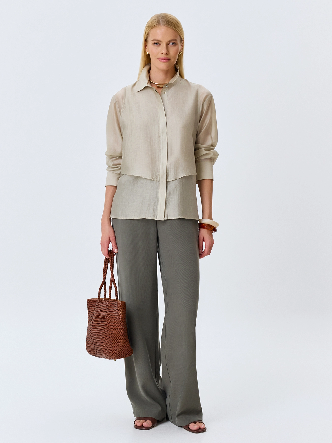 Свободные брюки из смесового района. Прямой силуэт. Резинка и кулиса по линии талии. Боковые карманы в швах.