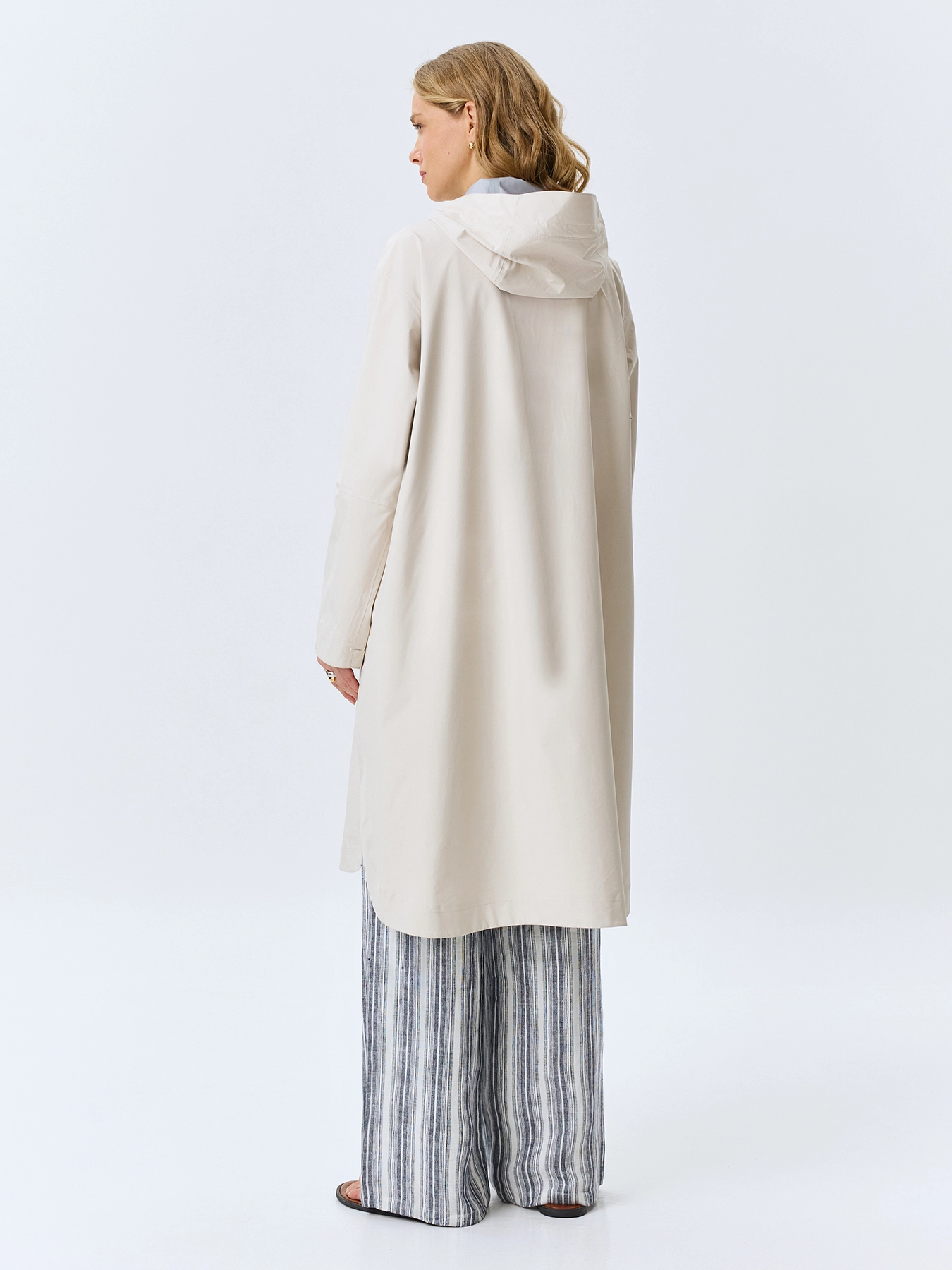 Плащ-дождевик свободного силуэта. Воротник стойка дополнен капюшоном. Застежка на молнию. Боковые карманы в швах. Накладные нагрудные карманы с клапанами и боковым входом. Длинные рукава с хлястиками с липучкой по низу. Дополнен акцентными фигурными разрезами по низу изделия. Плащ без подкладки с новой бесшовной технологией обработки.