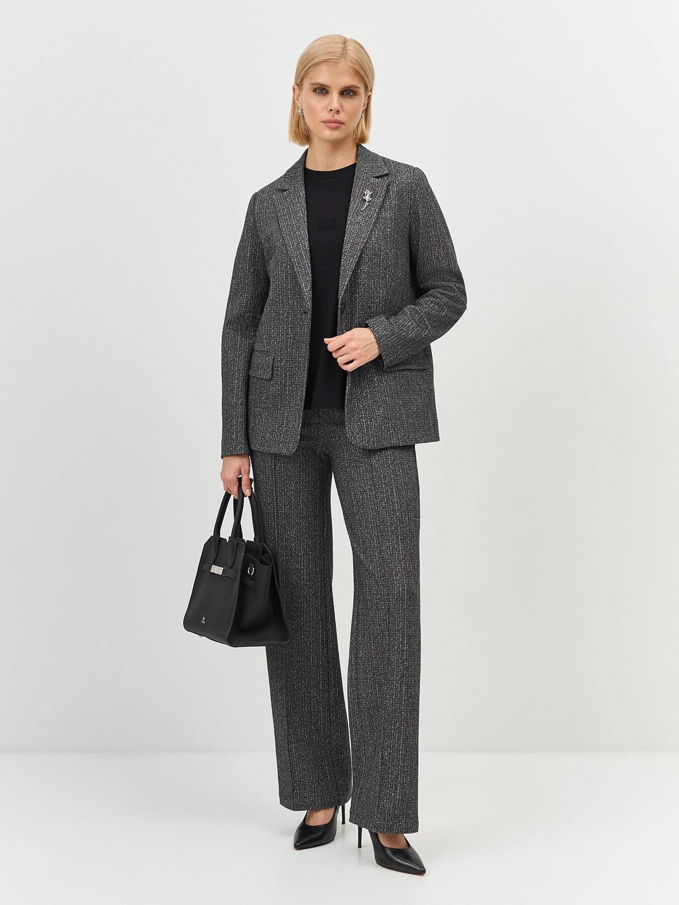 Широкие трикотажные брюки с застроченными стрелками. Свободный силуэт. Застежка на молнию и пуговицу. Резинка по линии талии сзади. Боковые карманы в швах. В составе вискоза и спандекс. Комплект с арт. 5257849.