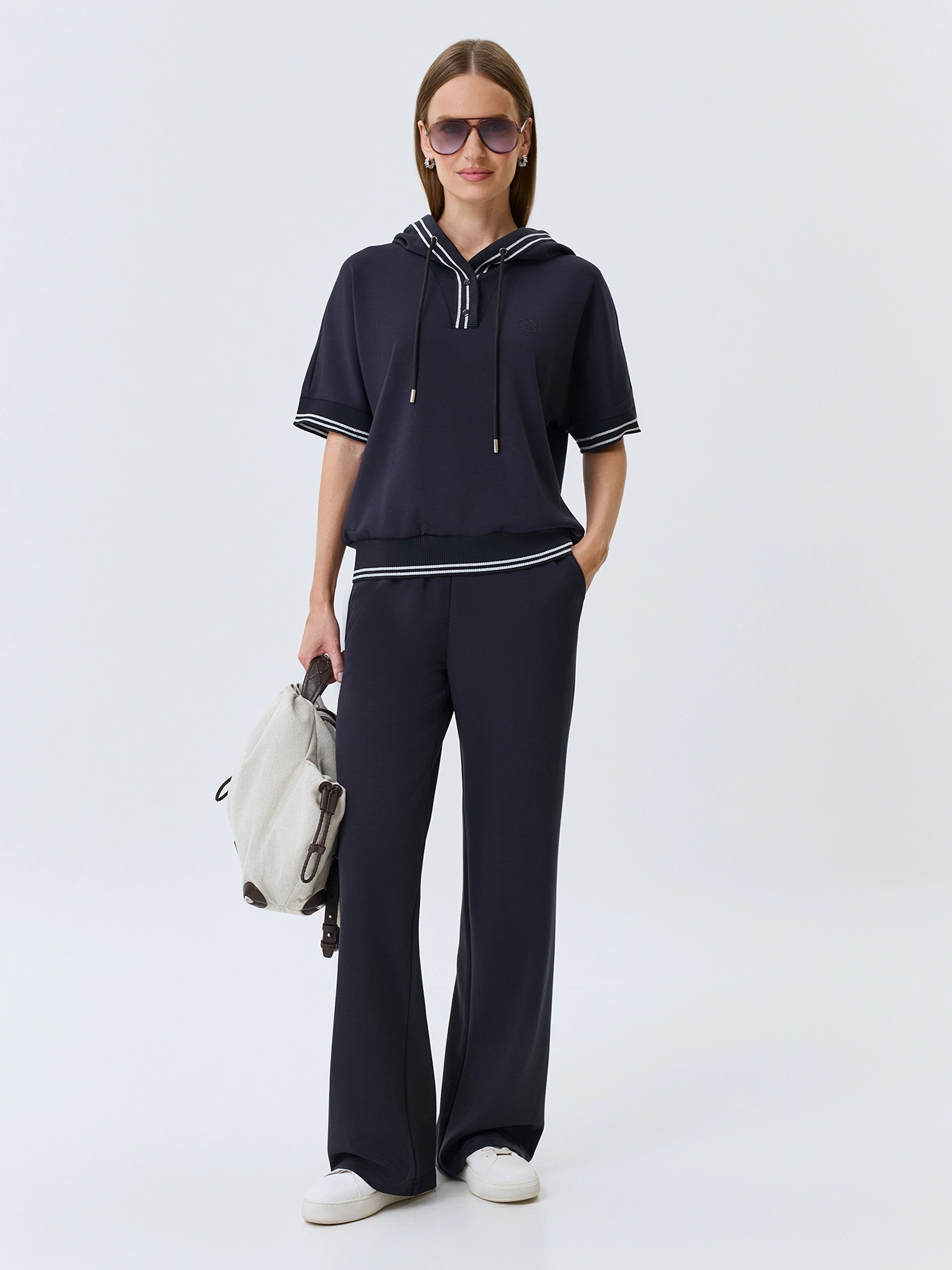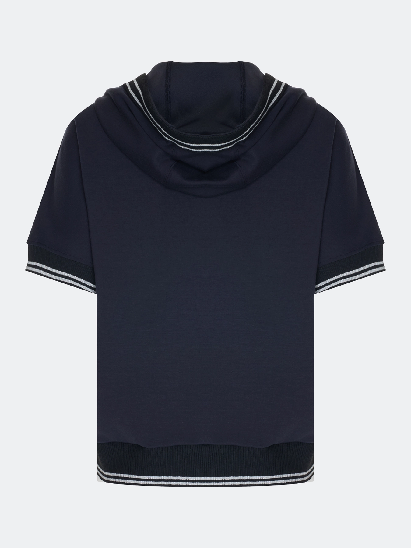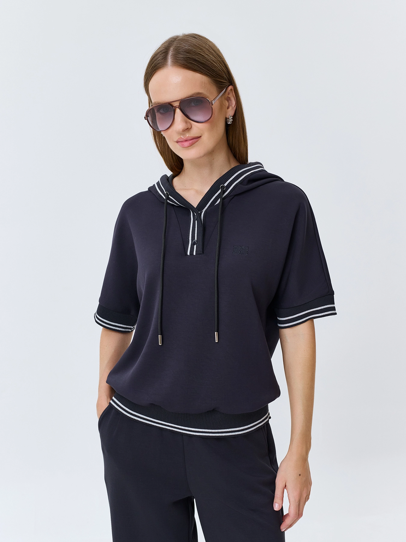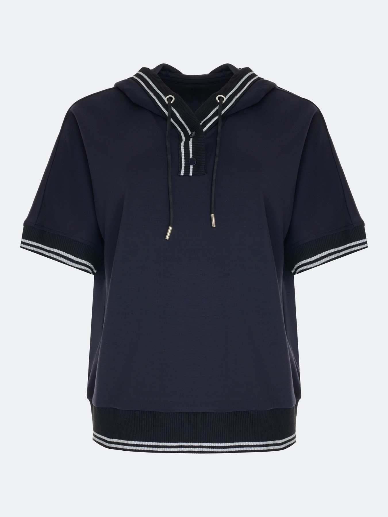 Трикотажный джемпер из смесовой вискозы. Прямой силуэт. Воротник-поло на кнопках дополнен капюшоном с утяжниками. Короткие цельнокроенные рукава. Дополнен рибом с полоской люрекса по воротнику, низу рукавов и изделия.