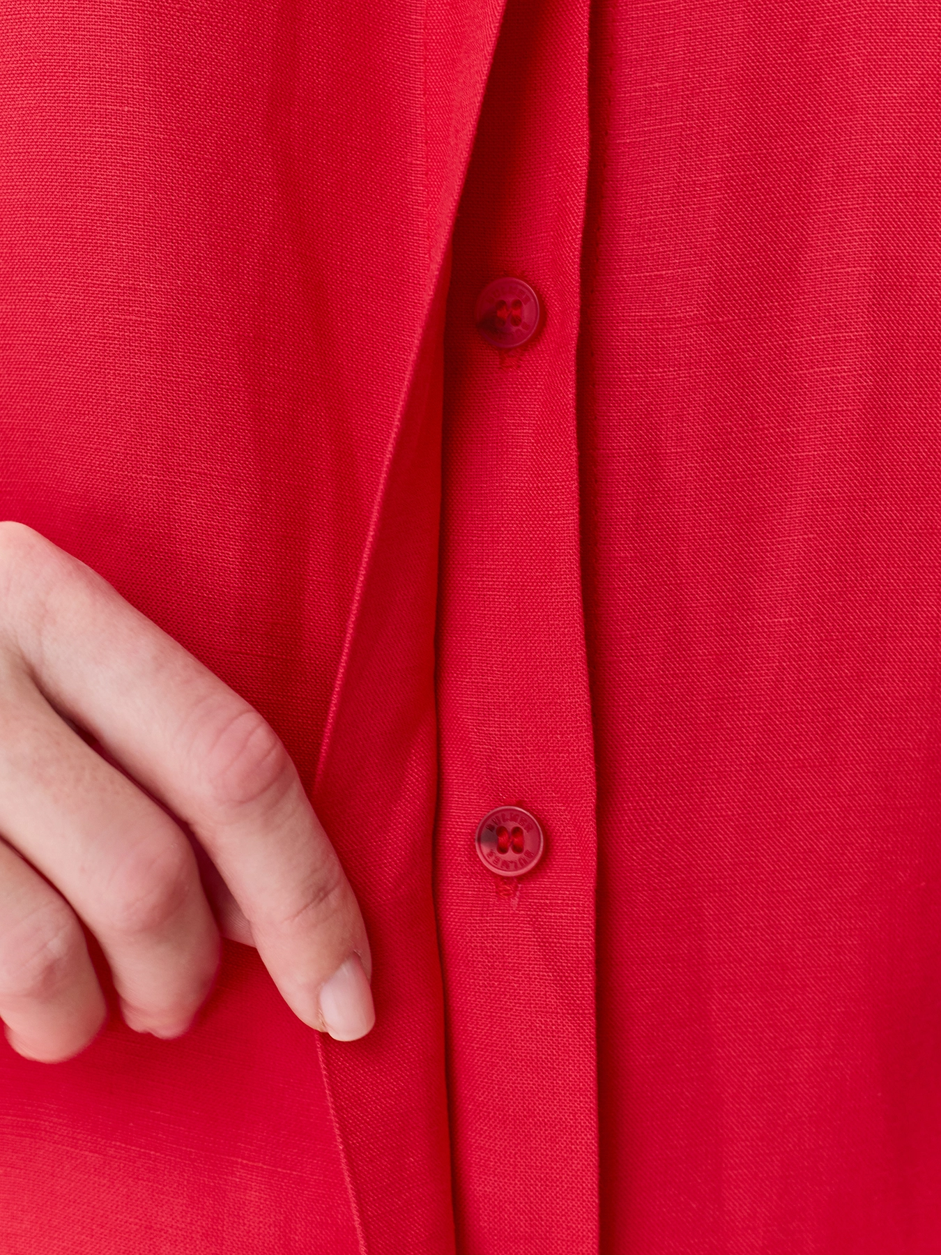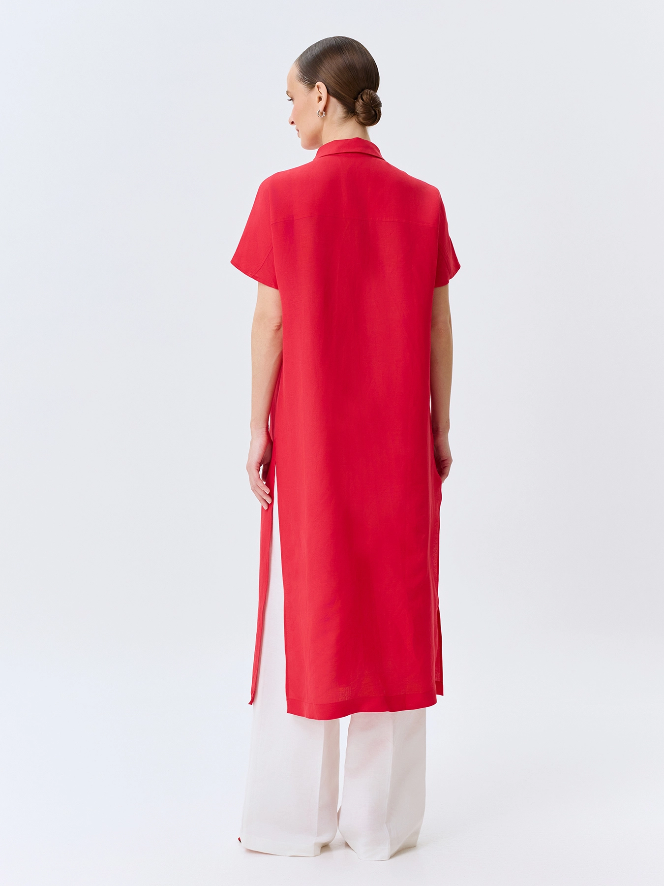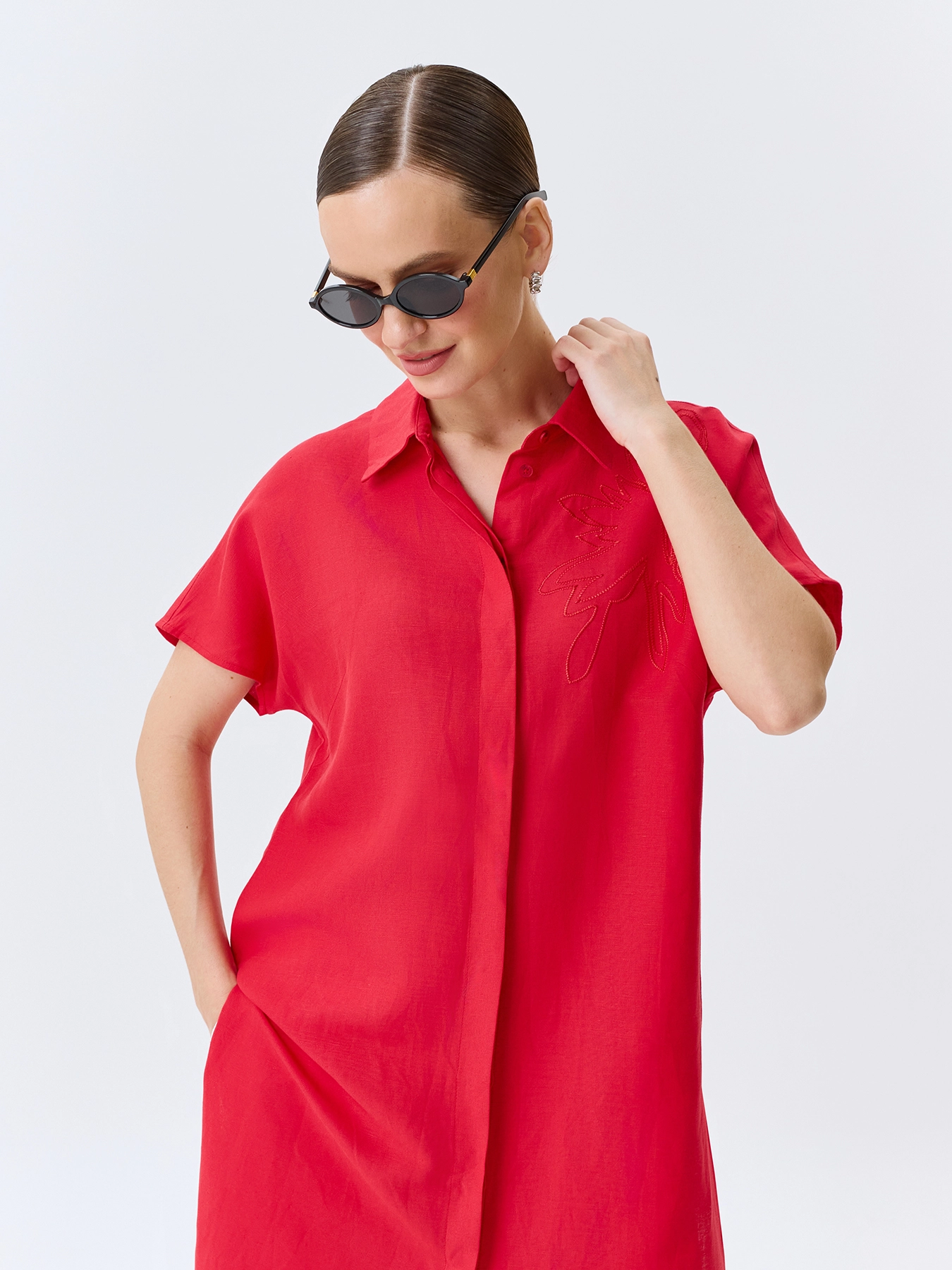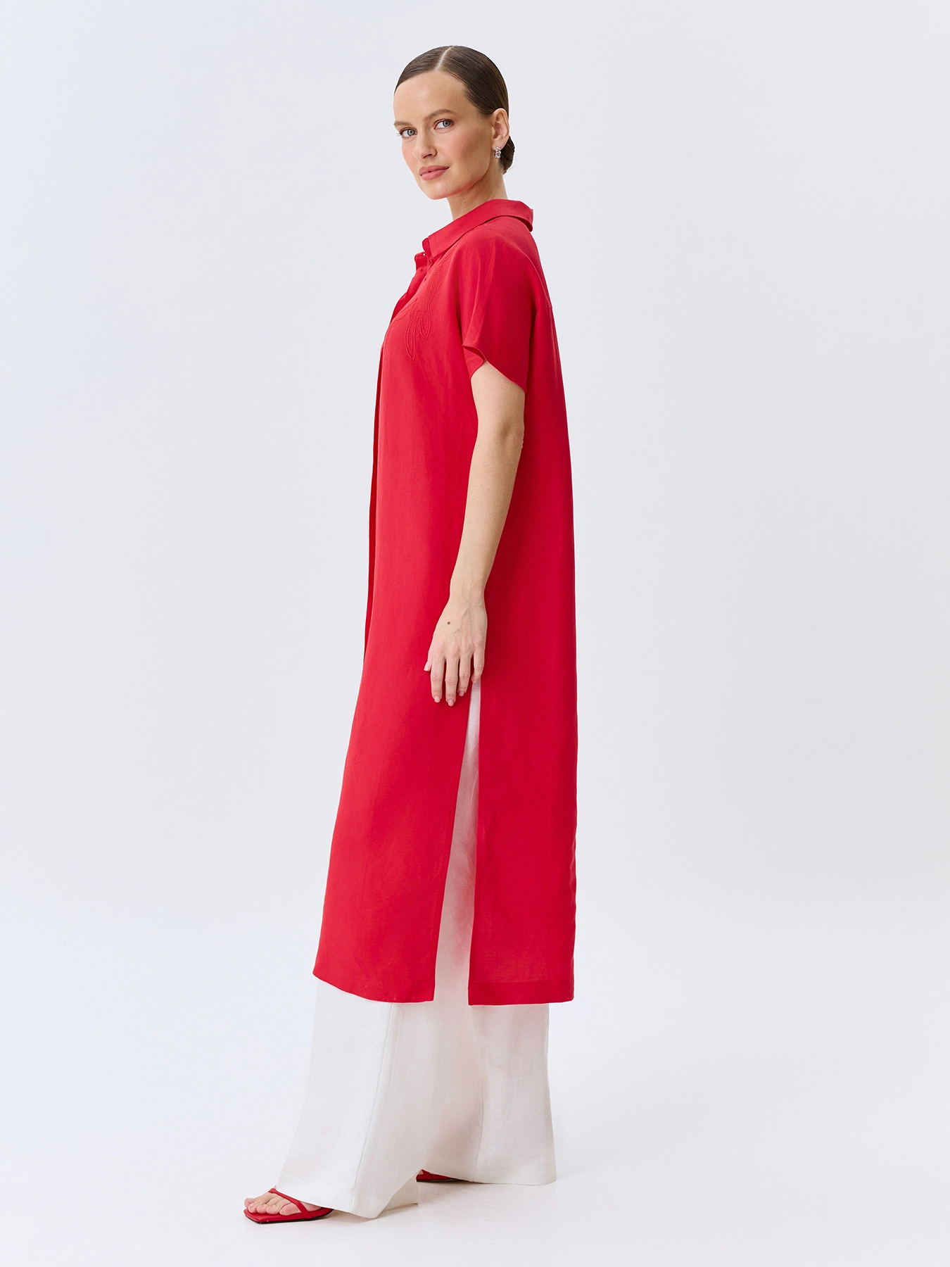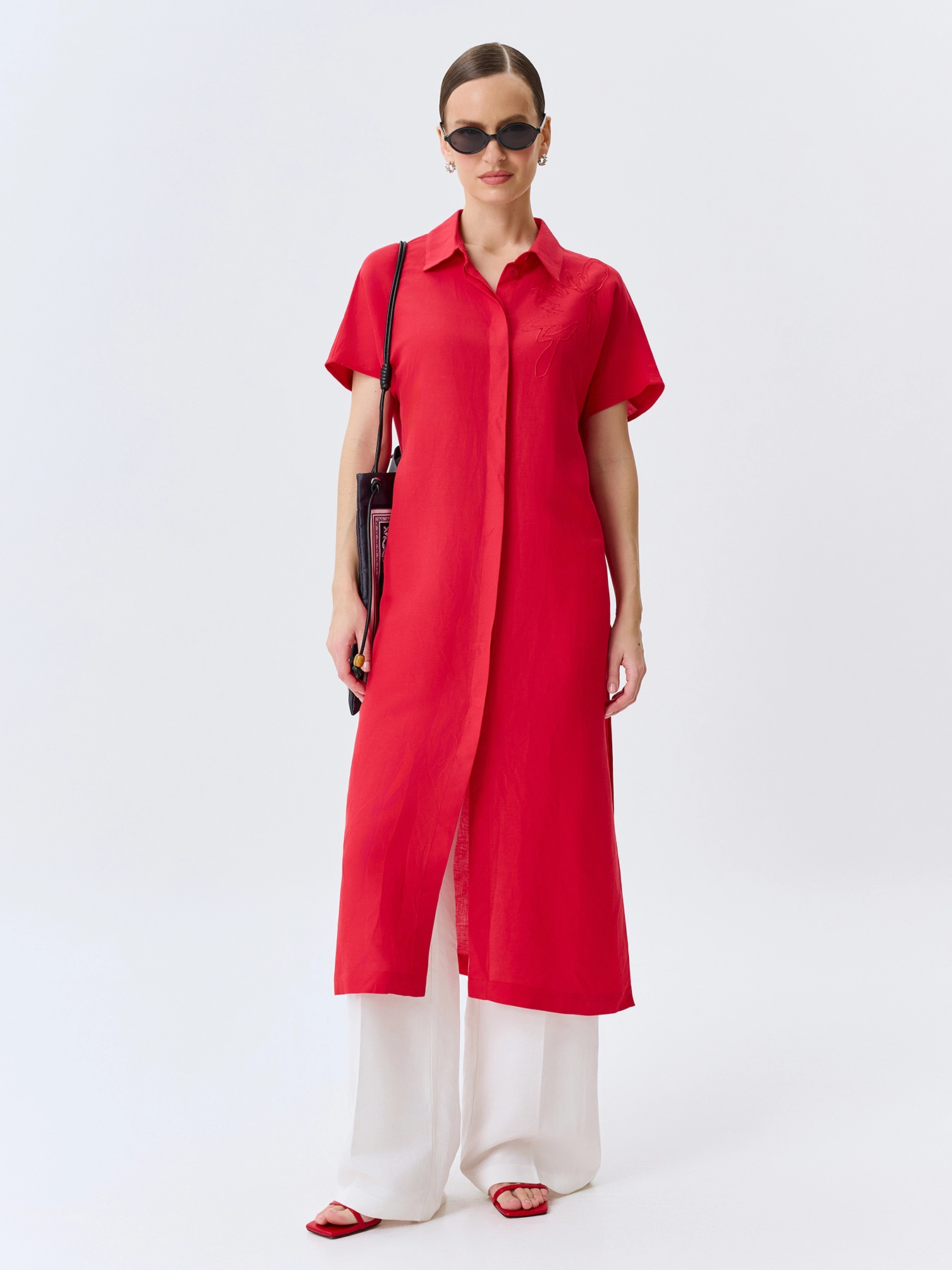 Удлиненная блуза-туника из смесового льна и вискозы. Прямой силуэт. Отложной воротник. Застежка на пуговицы. Короткие цельнокроенные рукава. Деликатная вышивка в цвет. Дополнена высокими разрезами в боковых швах.