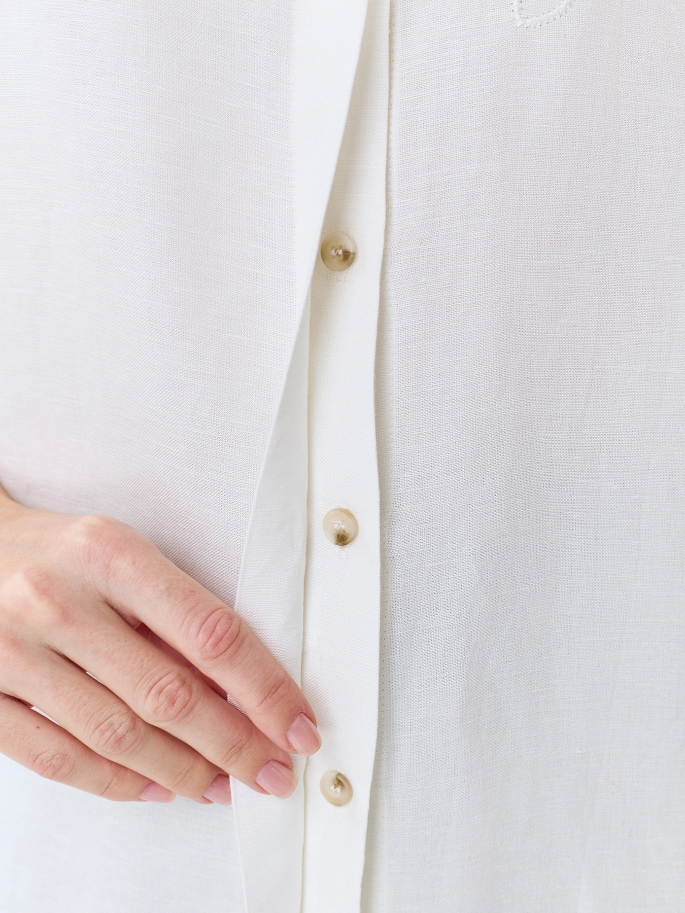 Удлиненная блуза-туника из смесового льна и вискозы. Прямой силуэт. Отложной воротник. Застежка на пуговицы. Короткие цельнокроенные рукава. Деликатная вышивка в цвет. Дополнена высокими разрезами в боковых швах.