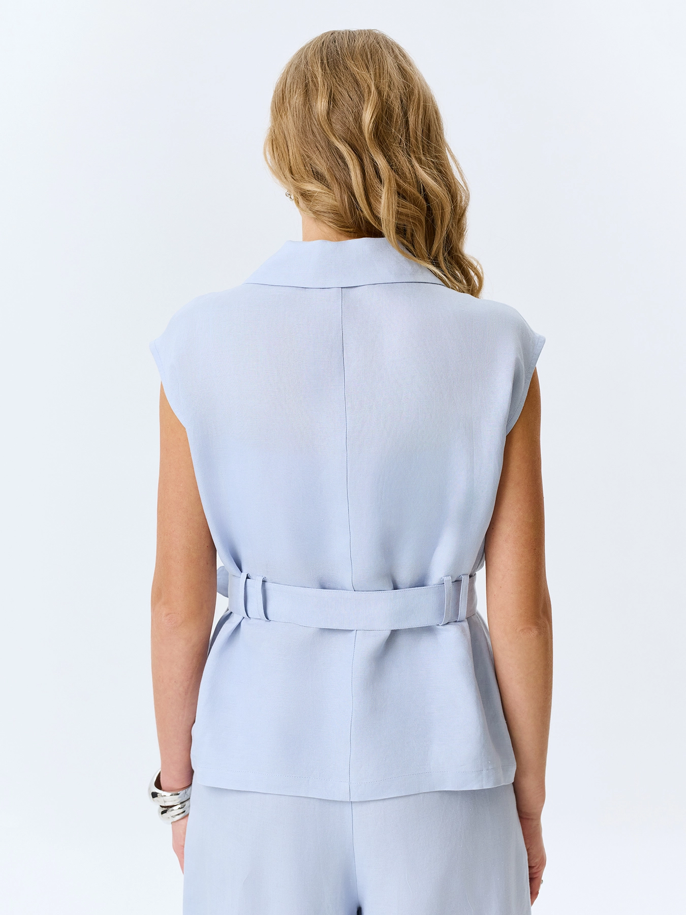 Удлиненный жилет из смесового льна и вискозы. Прямой силуэт можно приталить поясом. Отложной воротник. Застежка на пуговицы. Накладные нагрудные карманы с клапанами на пуговицах. Комплект с 4667437.