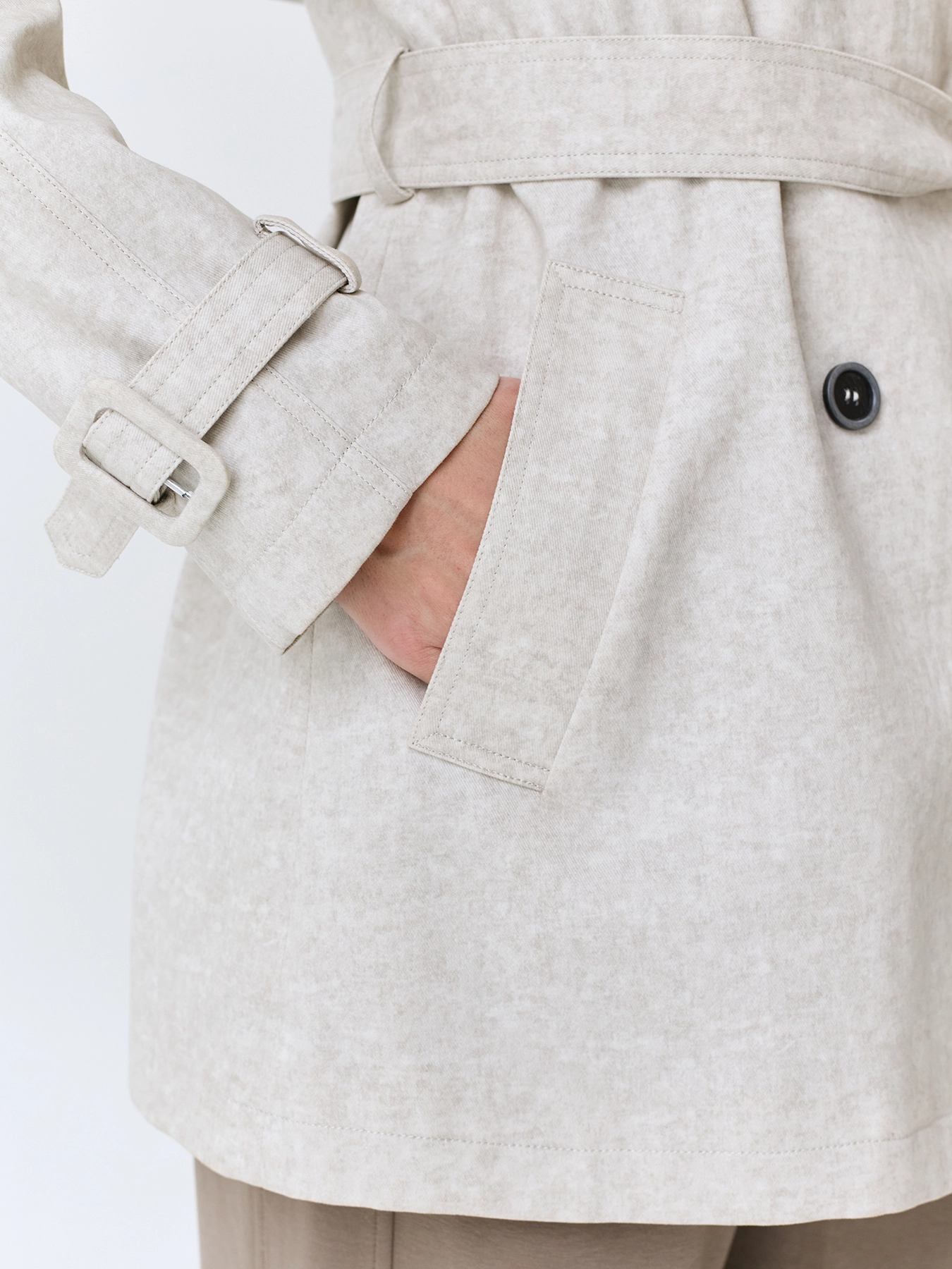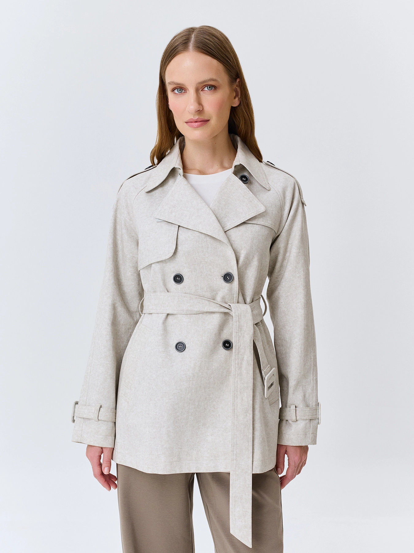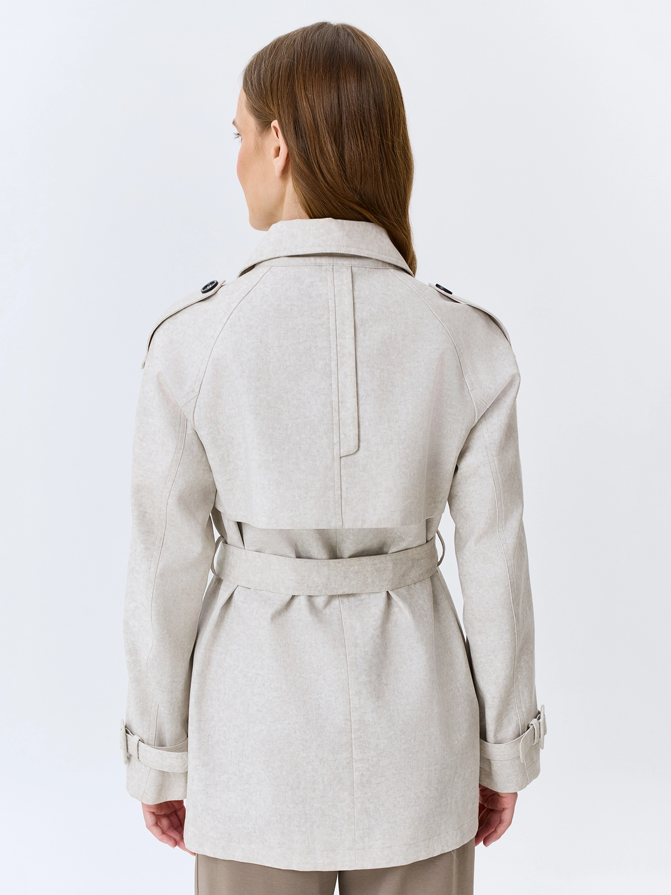 Укороченный тренч из 100% хлопка с эффектом варки. А-силуэт можно приталить поясом. Двойной английский воротник. Двубортная застежка на контрастные пуговицы. Боковые карманы с листочками. Дополнен отлетной кокеткой по спинке.