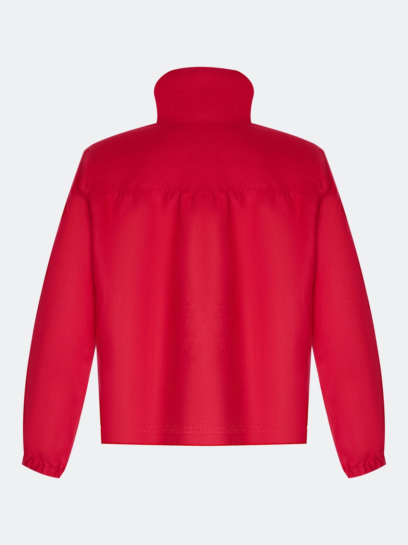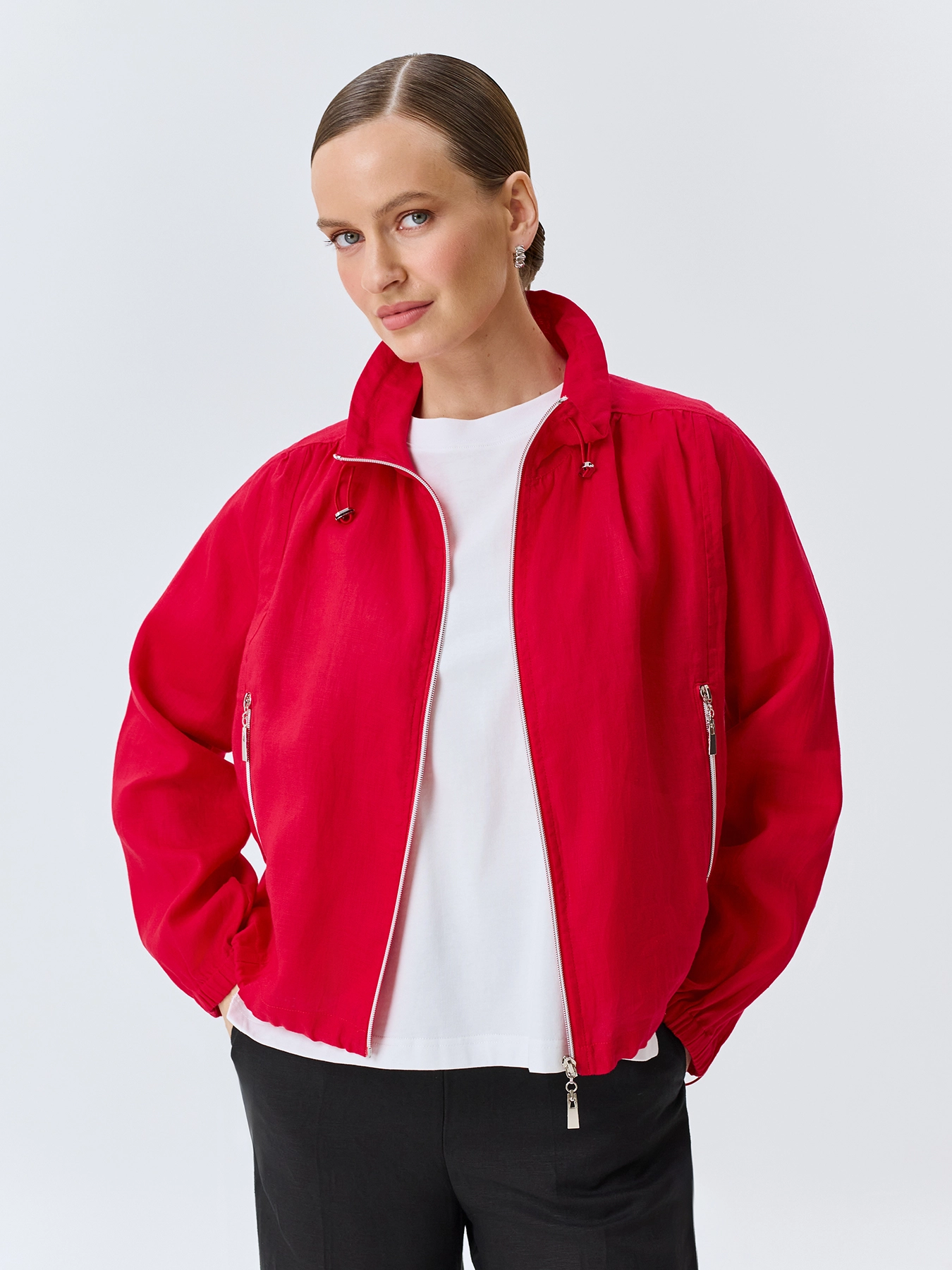 Укороченный жакет из 100% льна. Свободный силуэт. Воротник стойку на утяжниках можно отложить. Застежка на молнию. Спущенная линия плеч и длинные рукава с резинкой по низу. Боковые карманы на молнии. Дополнен кулисой по низу изделия.