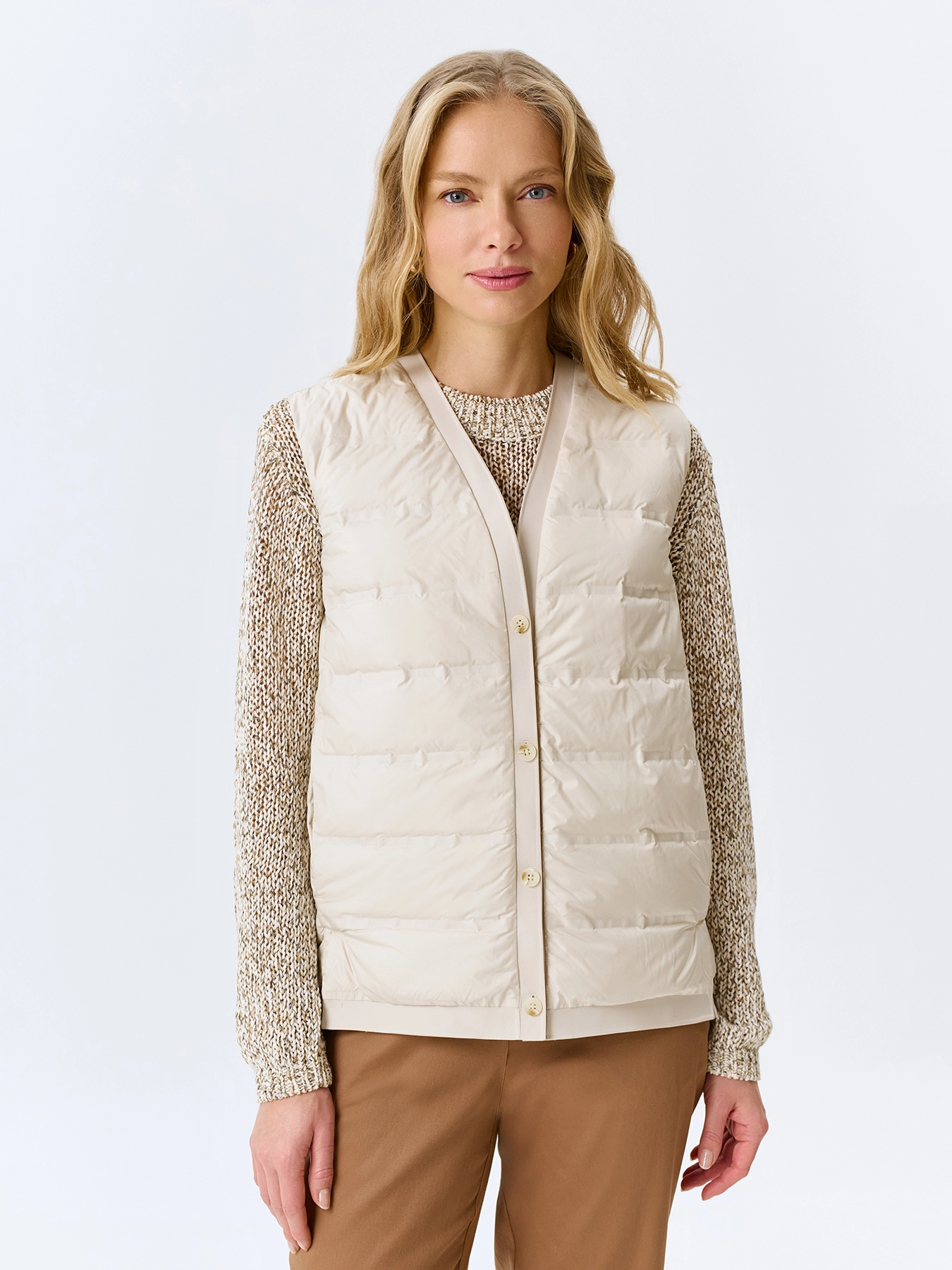Новый стильный утепленный жилет от немецкого бренда Bulmer – ваш идеальный спутник весной и осенью! Удобный прямой фасон без рукавов подходит под любую одежду из вашего гардероба. Жирный плюс – наполнение пух+перо, которое сохраняет тепло даже в прохладную погоду. Двусторонний жемчужно-светлый дизайн позволяет менять внешний вид изделия одним движением, добавляя новизну вашему образу.  Приятное дополнение к гардеробу по разумной цене!