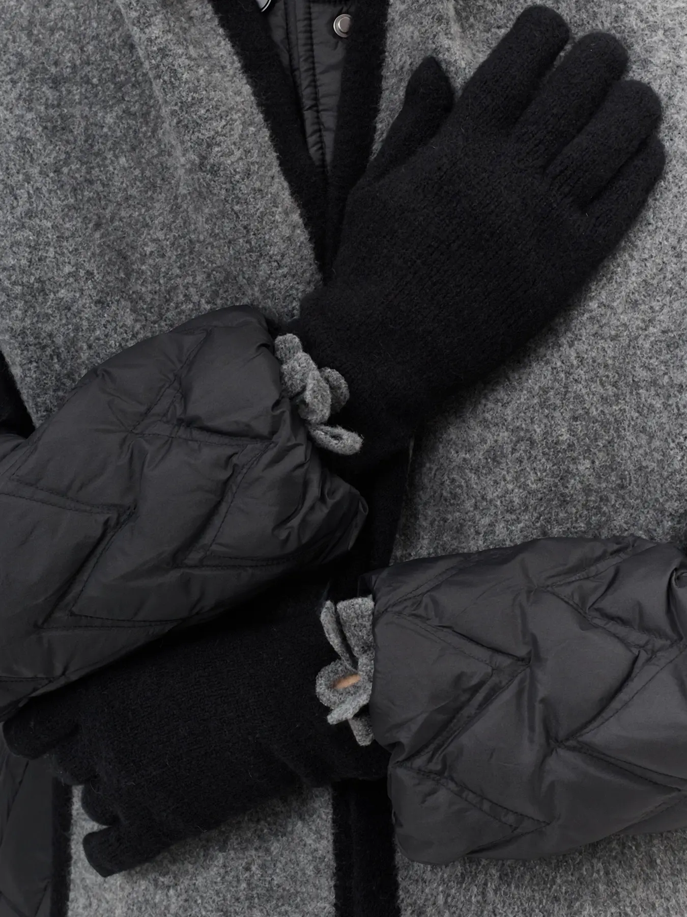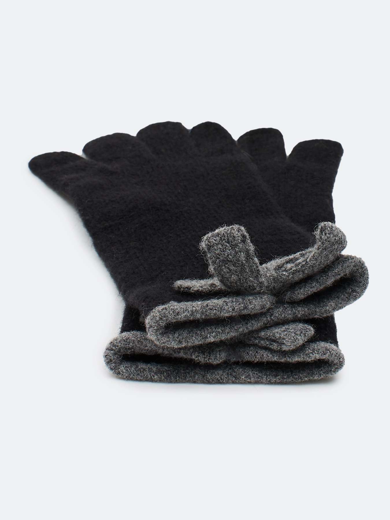 Вязаные перчатки из фасонной ворсистой пряжи с добавлением шерсти. Контрастная окантовка и бантик.  Украшены металлическим шильдиком.