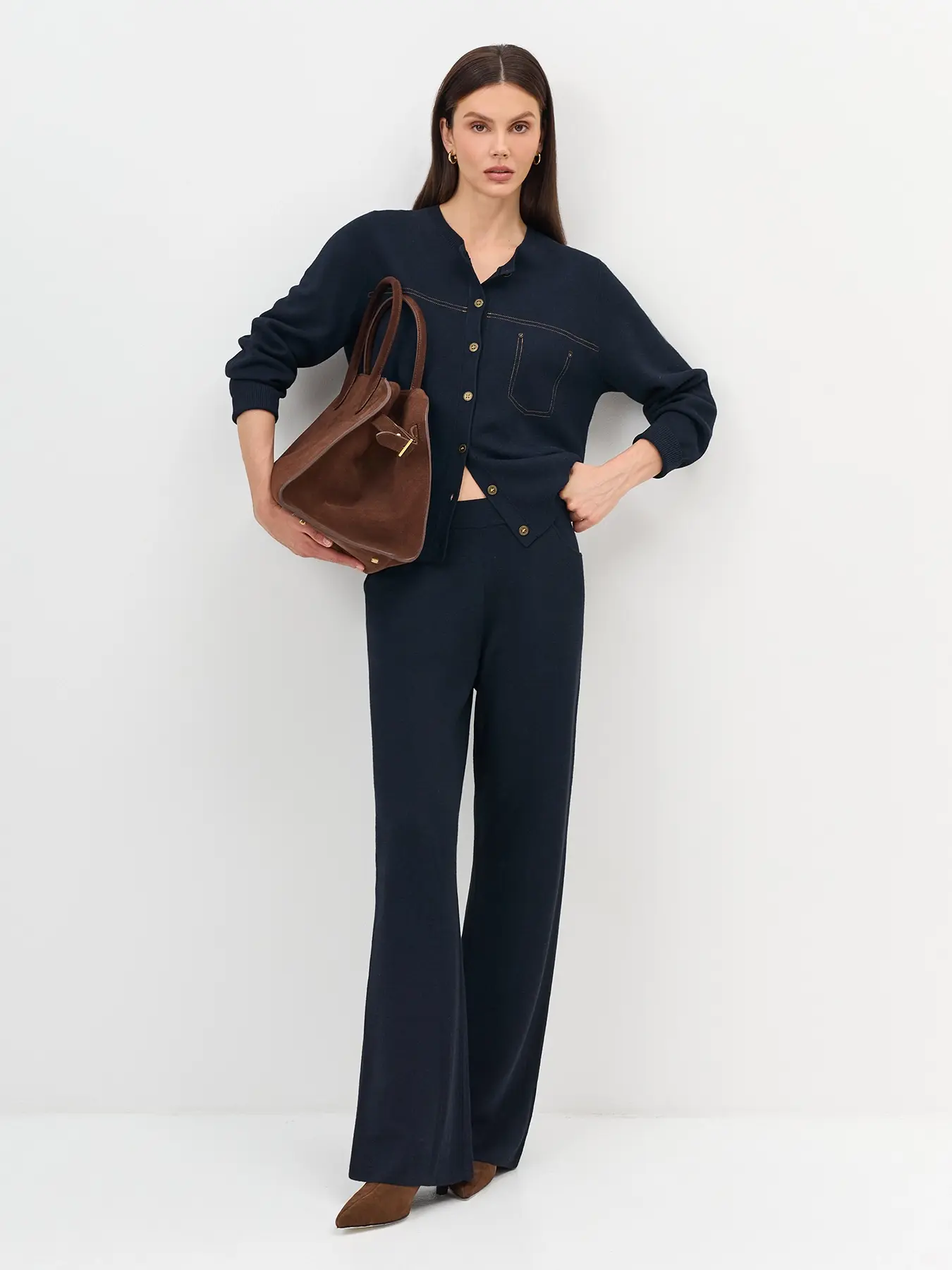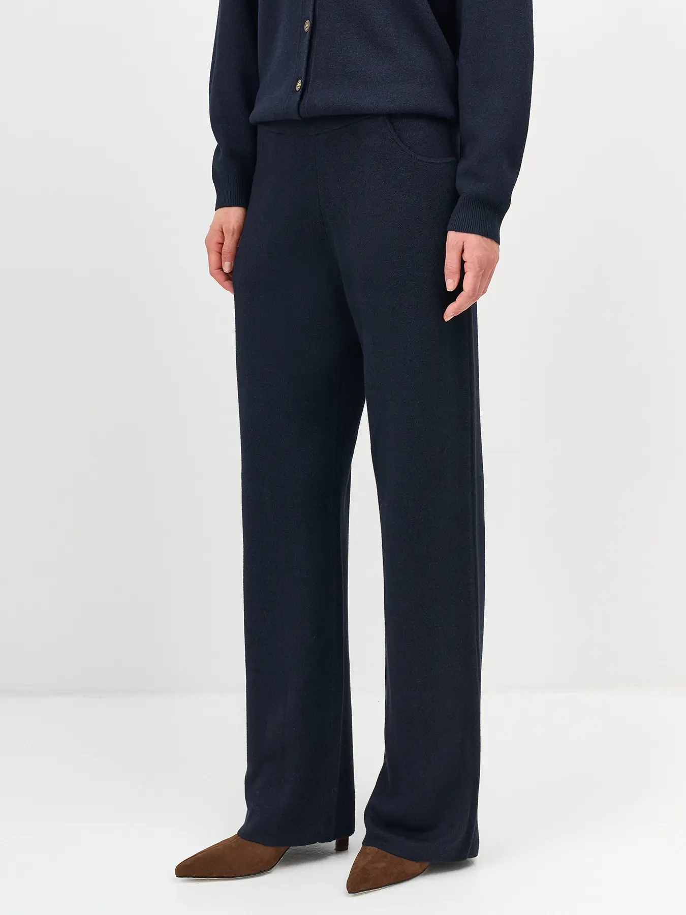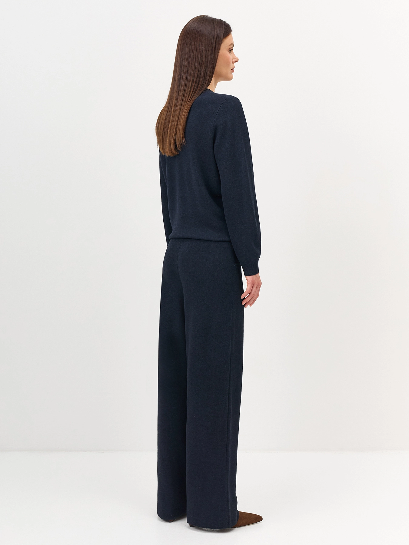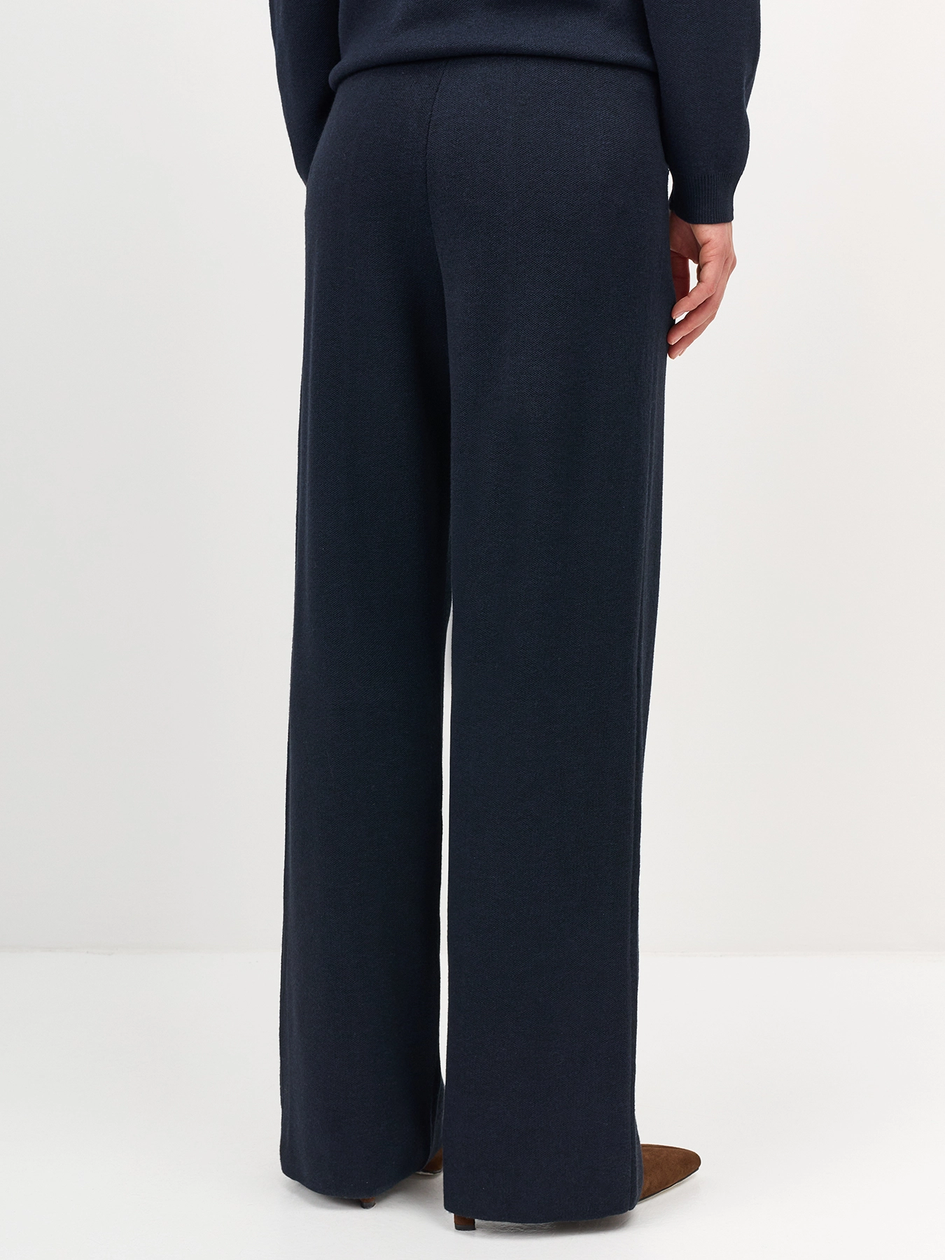Вязаные широкие брюки с шерстью в составе. Прямой силуэт. Широкий пояс с резинкой. Боковые карманы в швах. Контрастные строчки, имитирующие карманы сзади. Комплект с арт. 5257747.