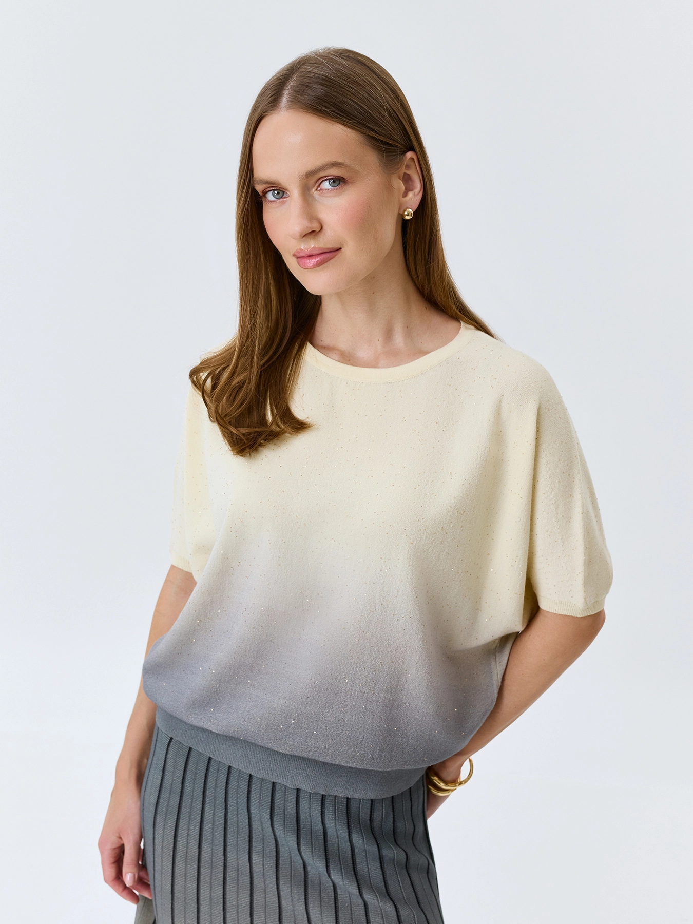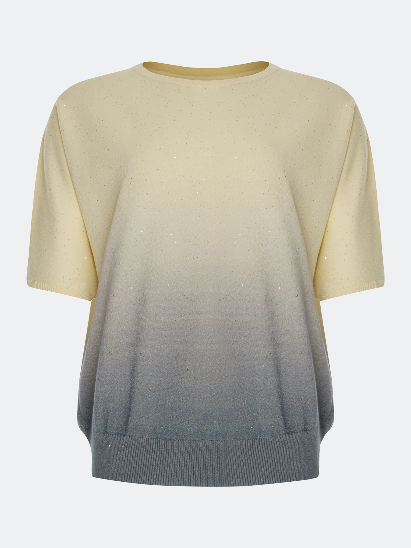 Яркий джемпер с градиентным принтом и мерцающими пайетками. Свободный силуэт. Круглый вырез. Укороченные цельнокроенные рукава. Дополнен рибом по низу изделия. В составе район и нейлон. Комплект с 4267709.