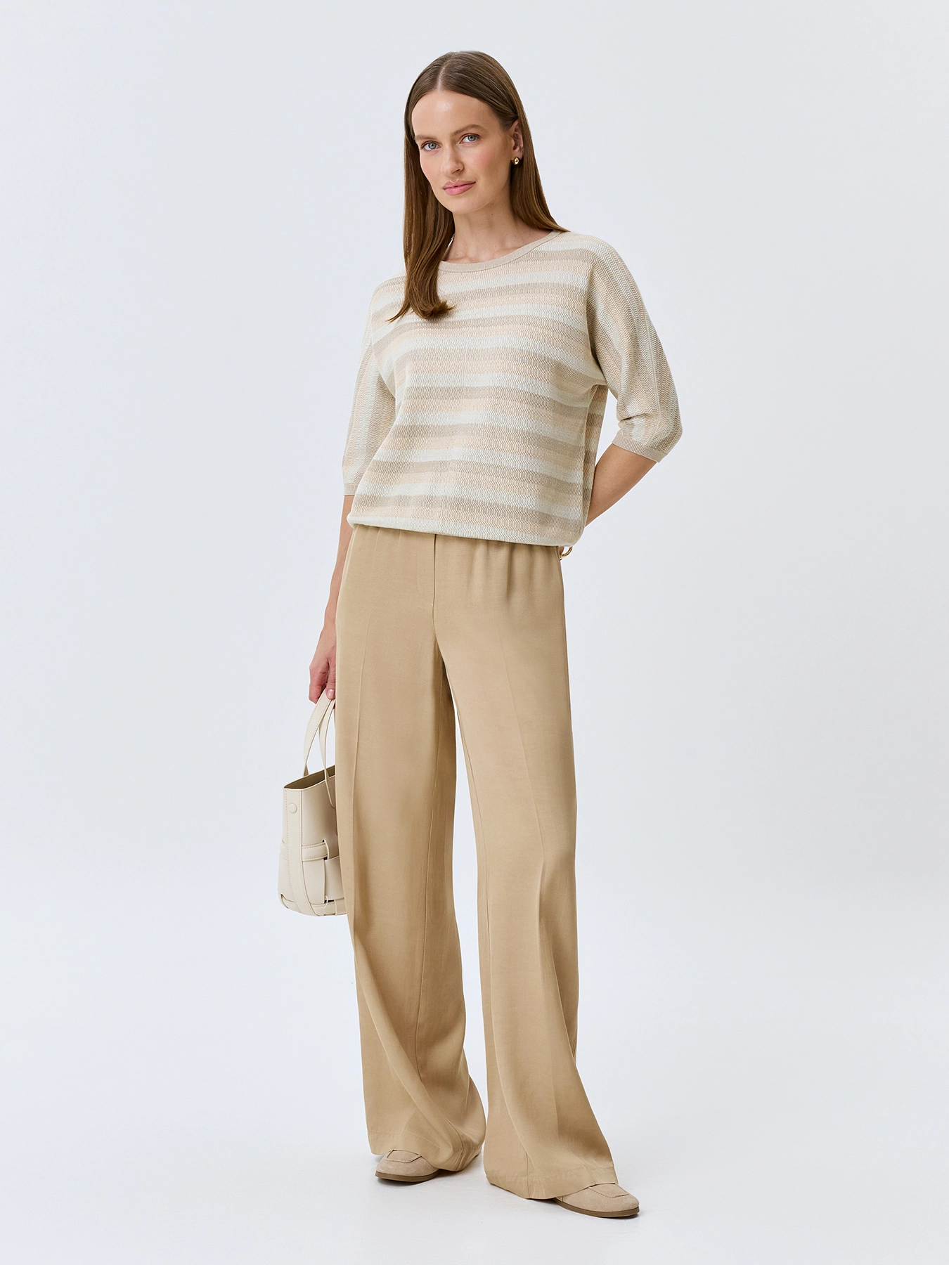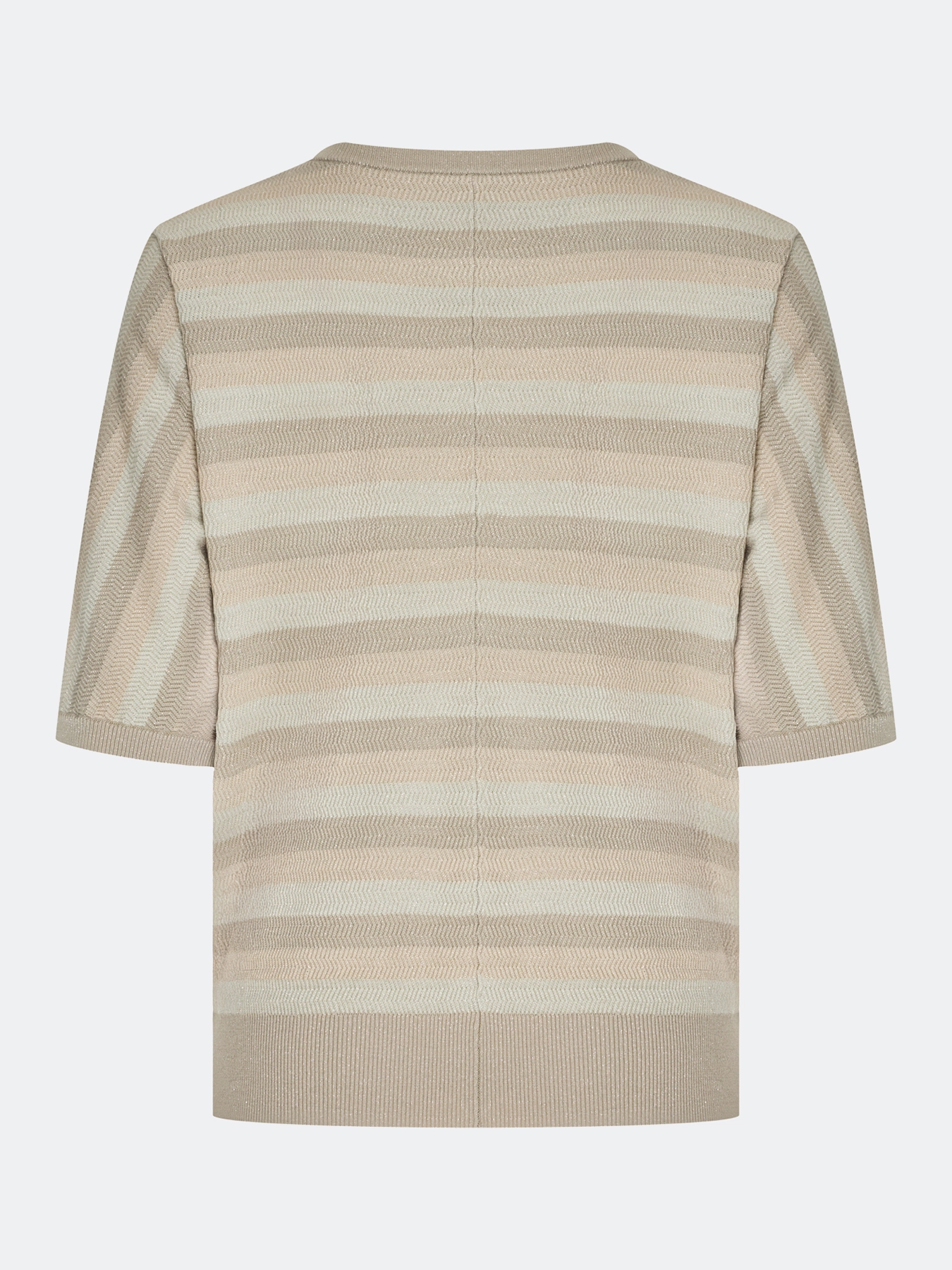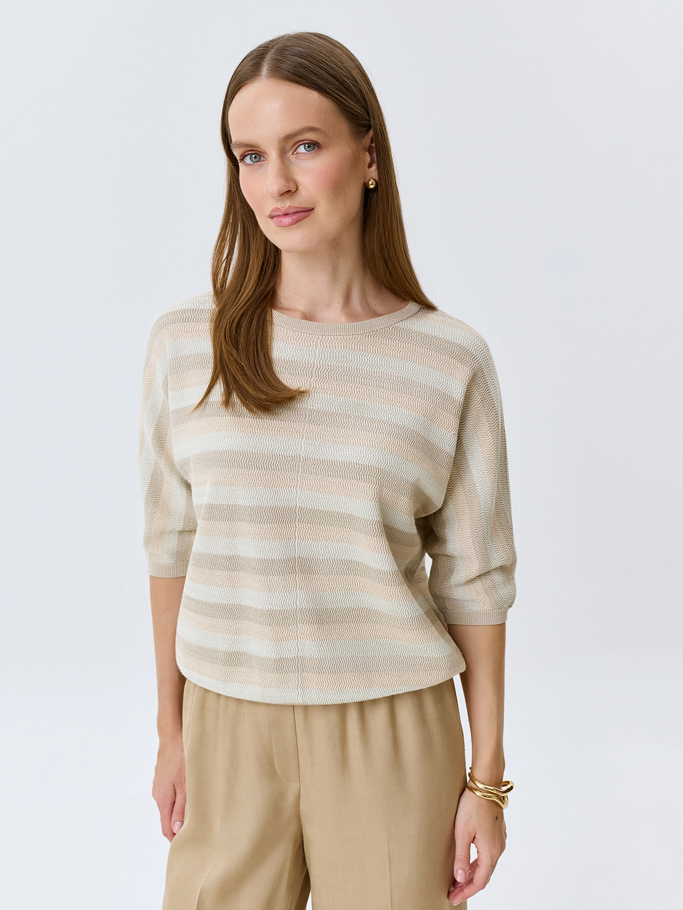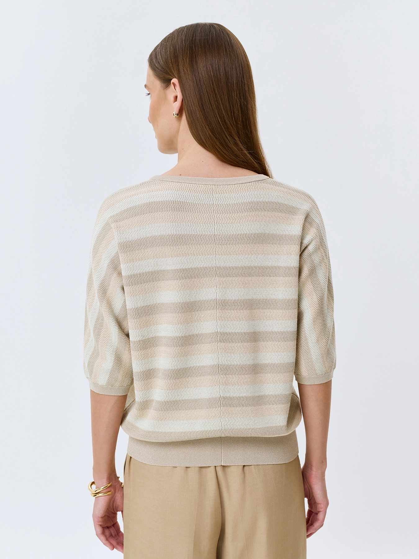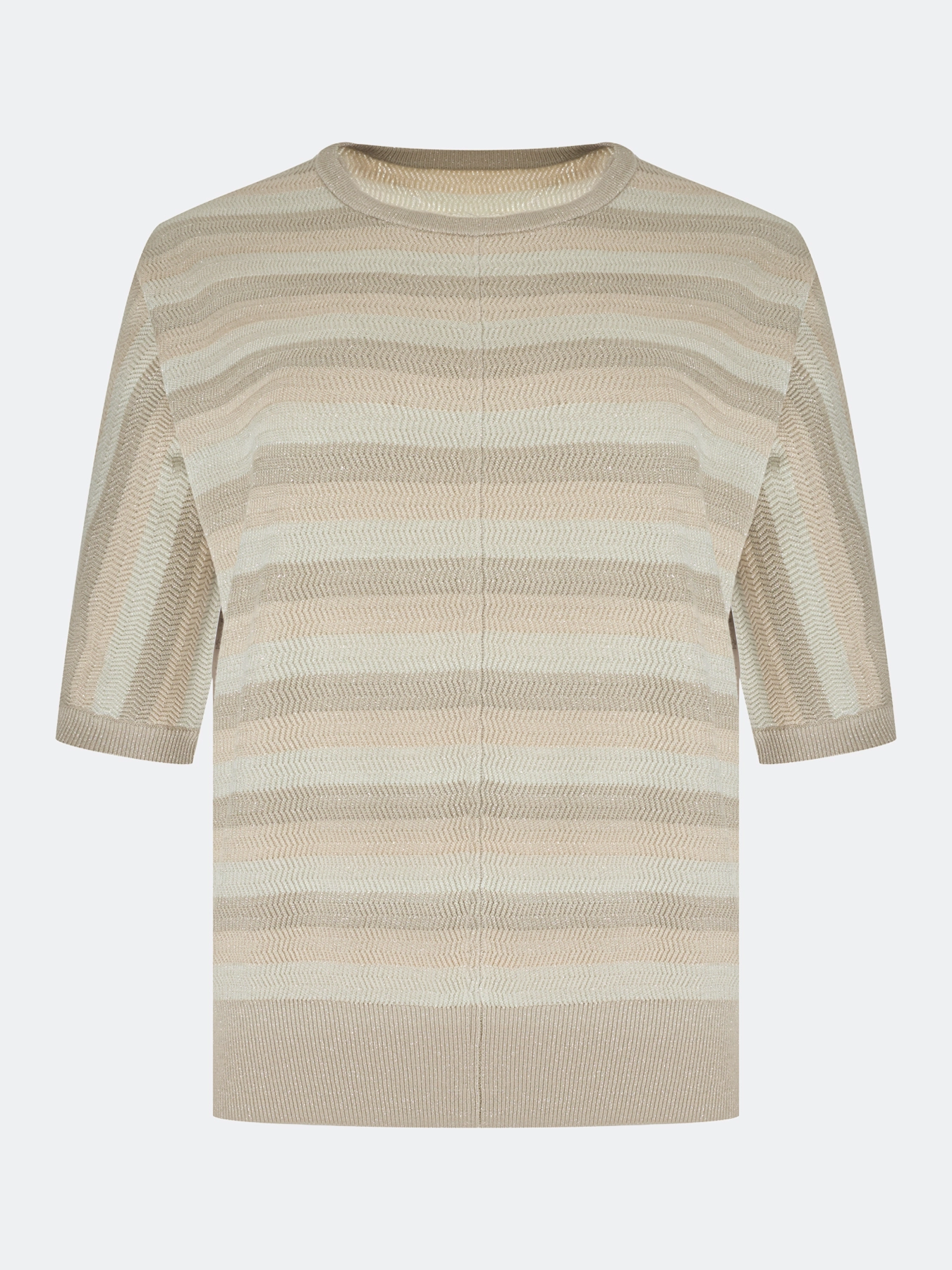 Вязаный джемпер из мягкого модала и хлопка в полоску. Прямой силуэт. Круглый вырез. Укороченные цельнокроенные рукава. Дополнен рибом по низу рукавов и изделия.