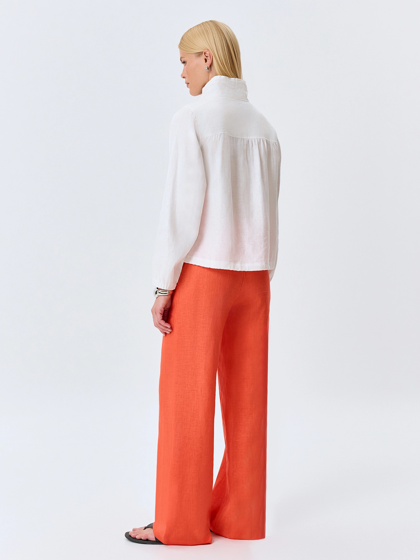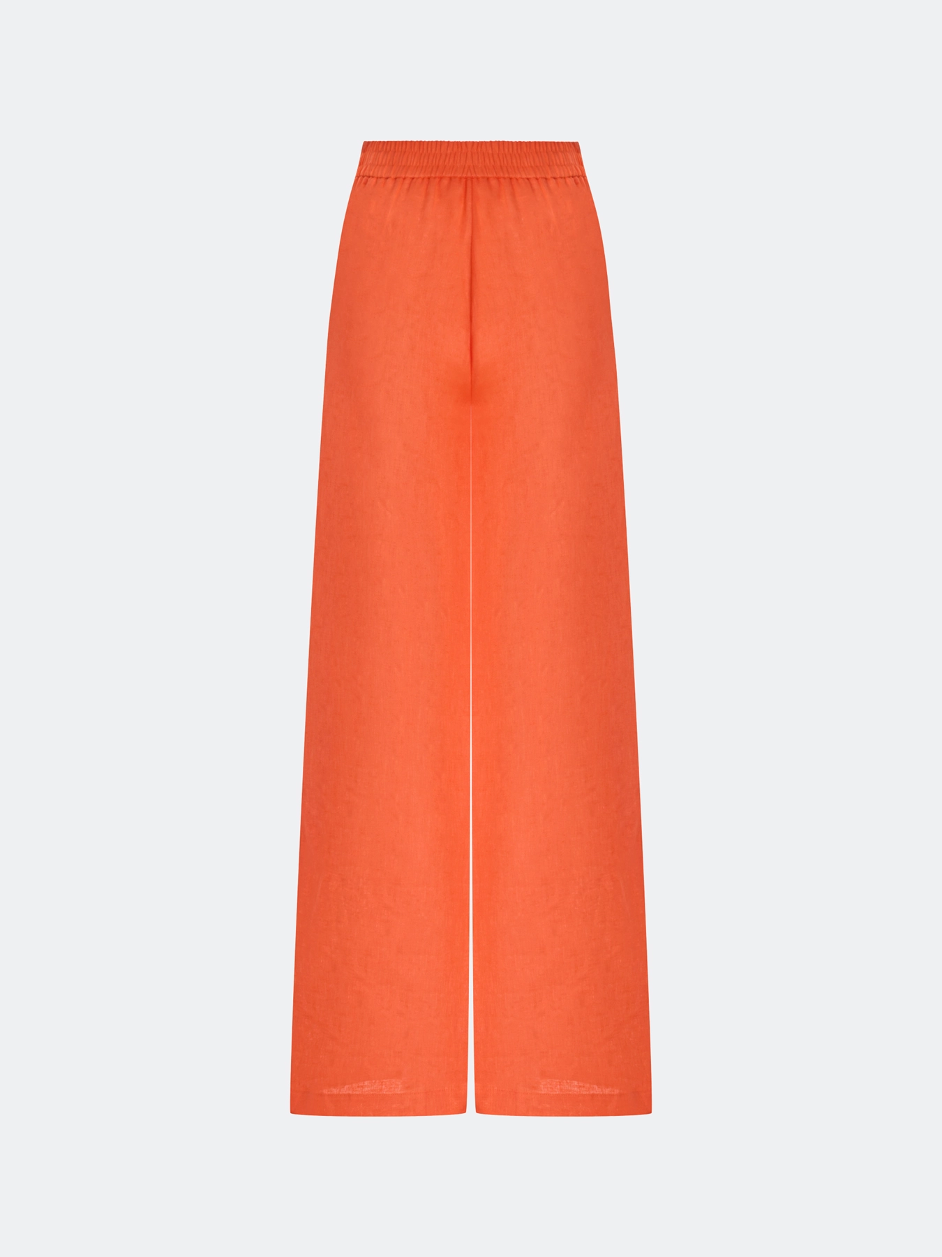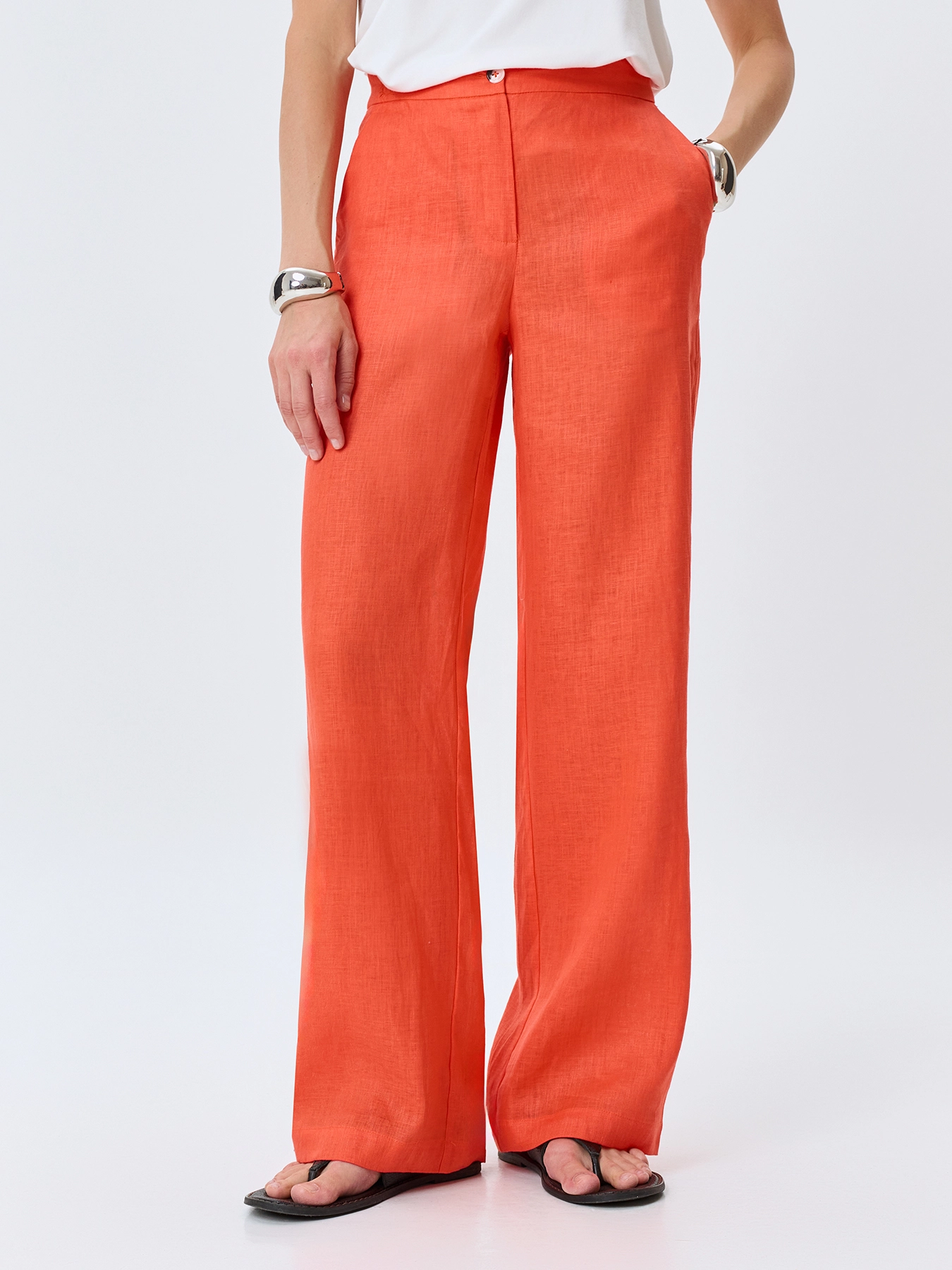 Яркие брюки из 100% льна. Прямой силуэт. Застежка на молнию и пуговицу. Боковые карманы в швах. Резинка по линии талии по спинке. Комплект с 4267339.