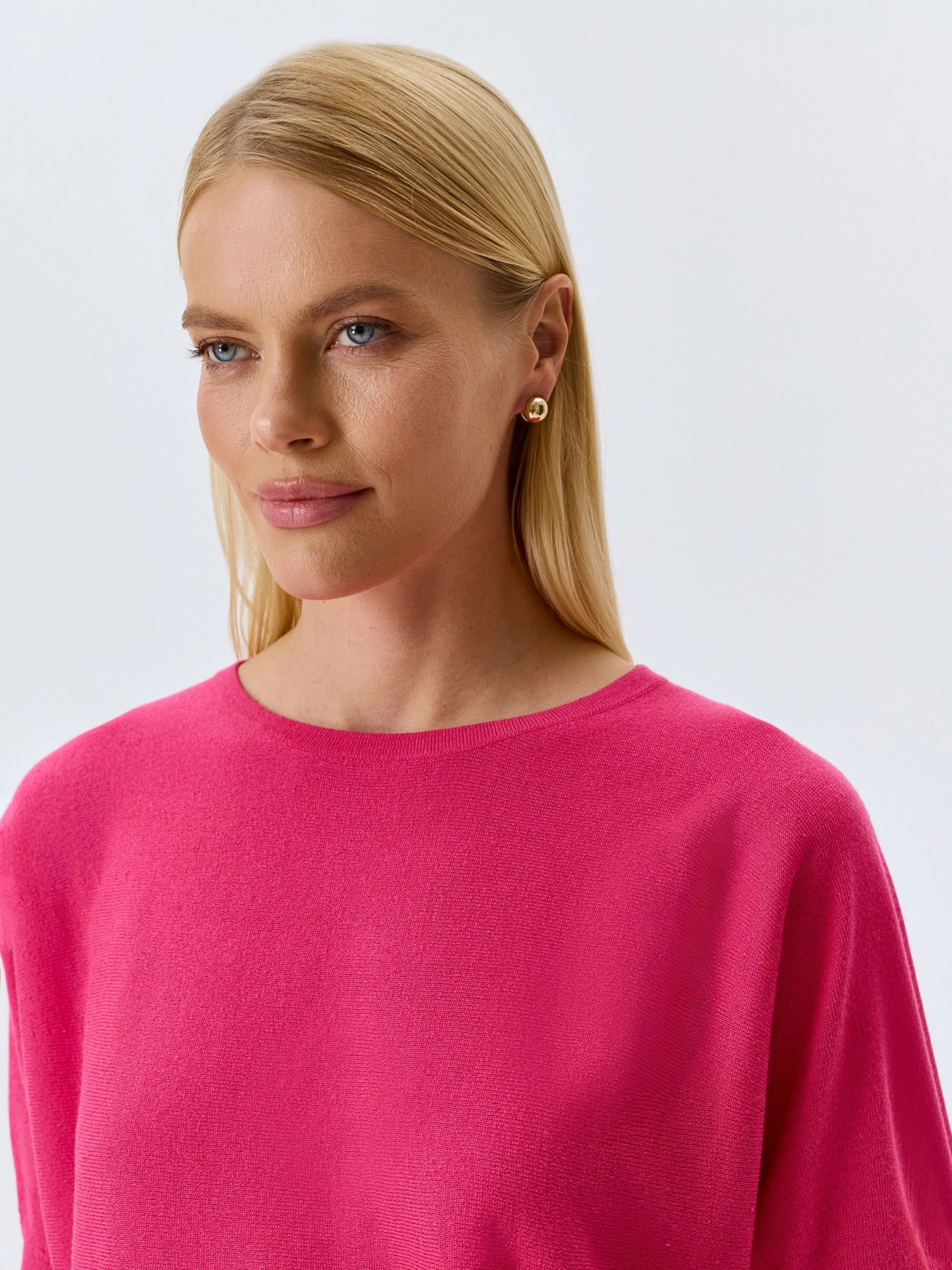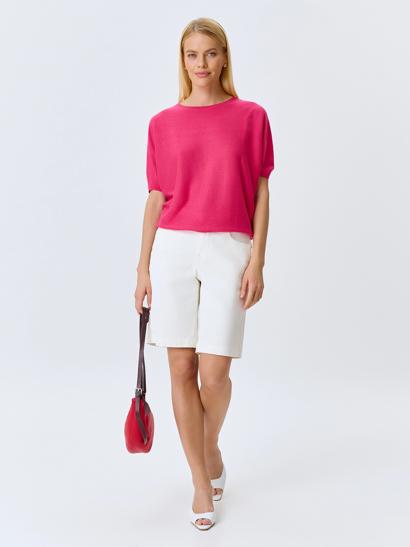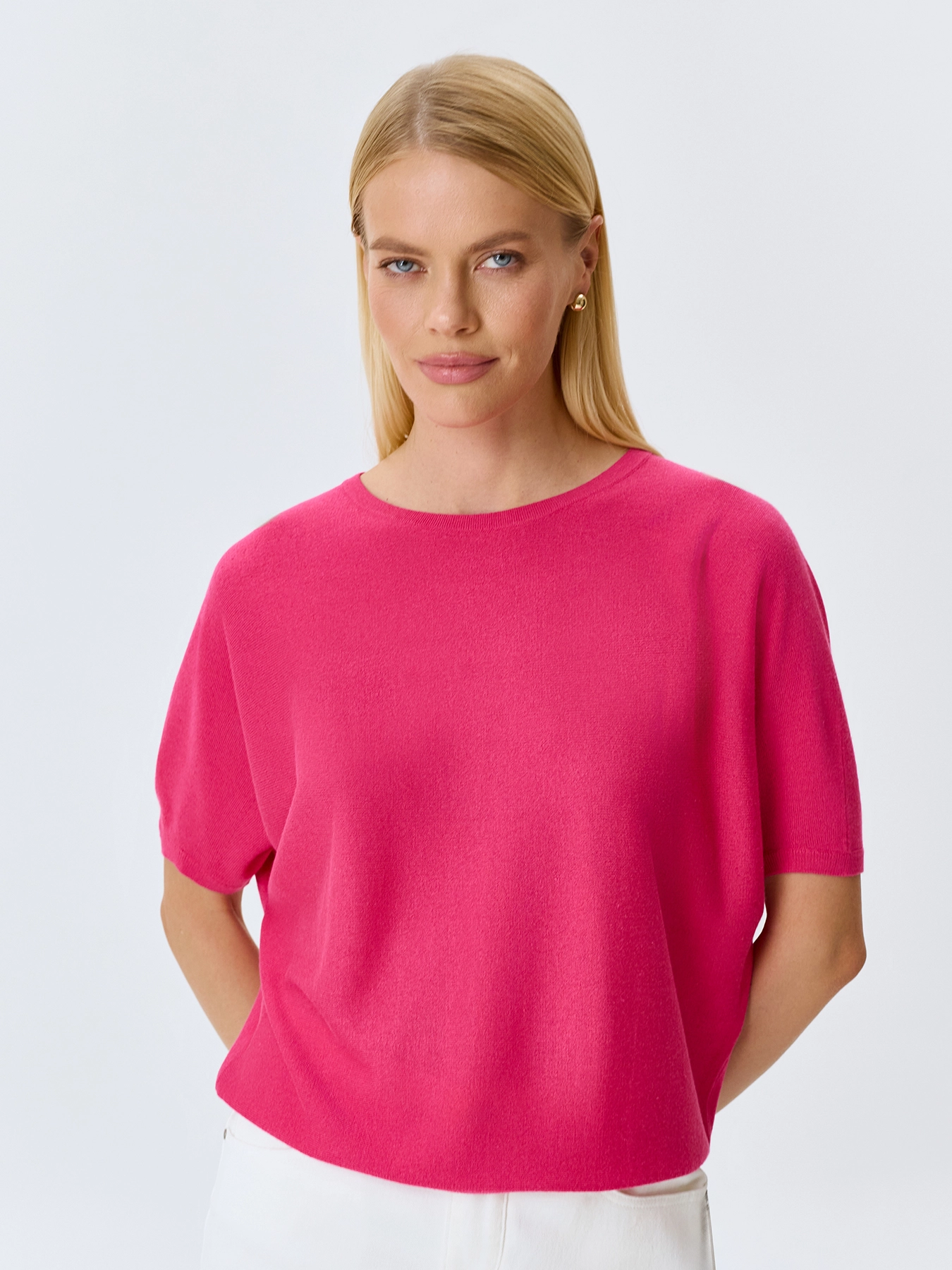 Яркий вязаный джемпер из смесовой вискозы и льна. Свободный силуэт. Круглый вырез. Укороченные цельнокроенные рукава. Дополнен рибом по горловине, низу рукавов и изделия.