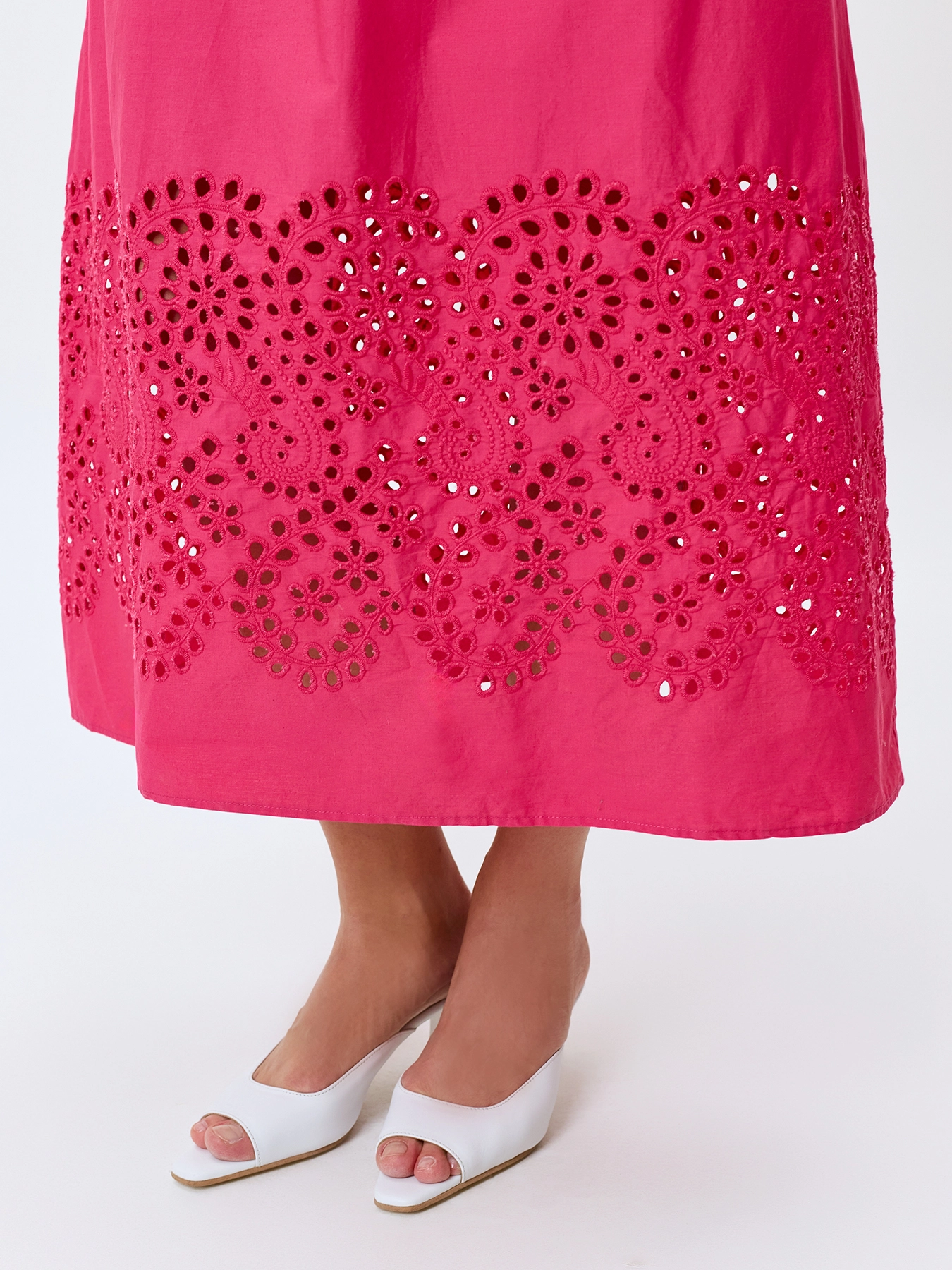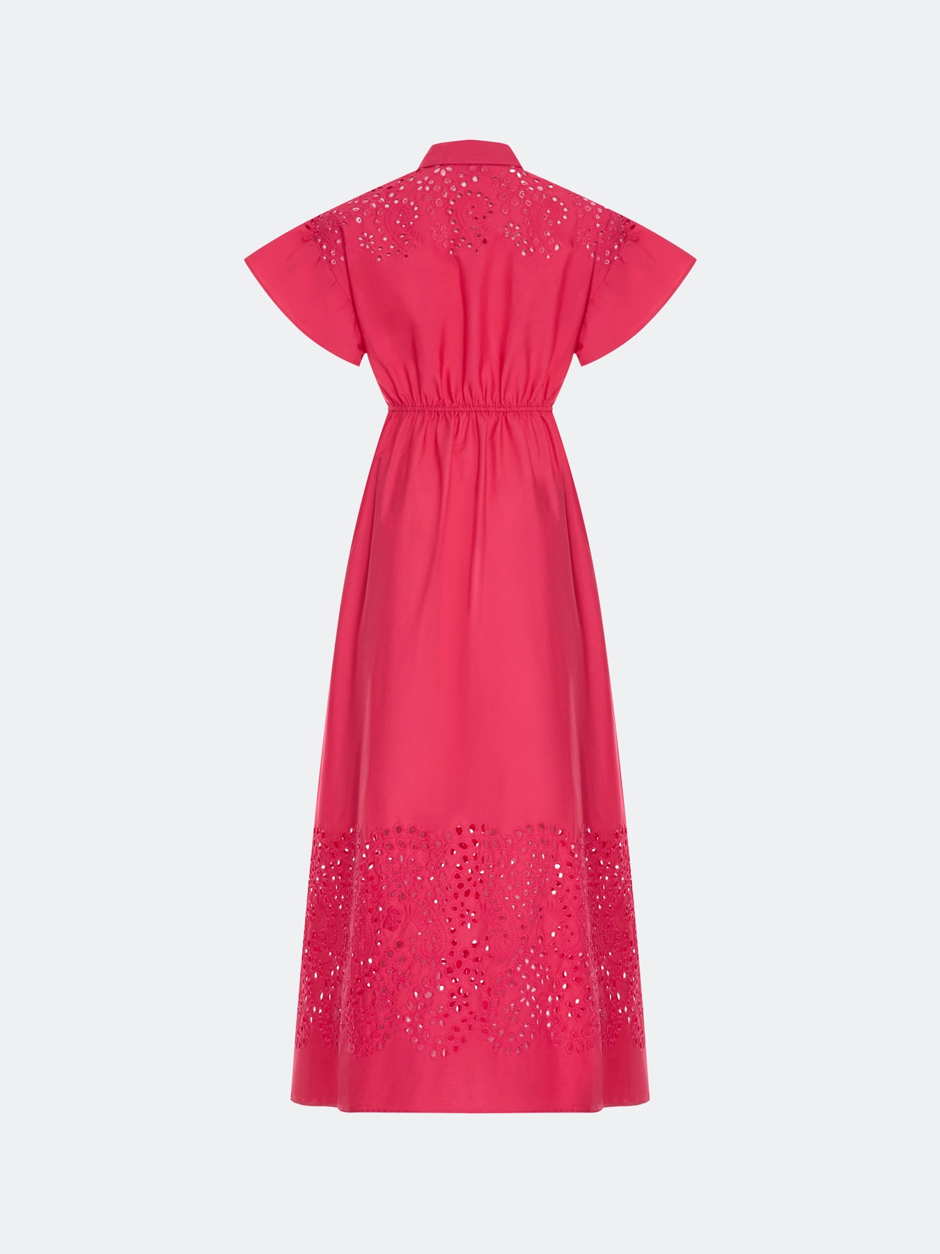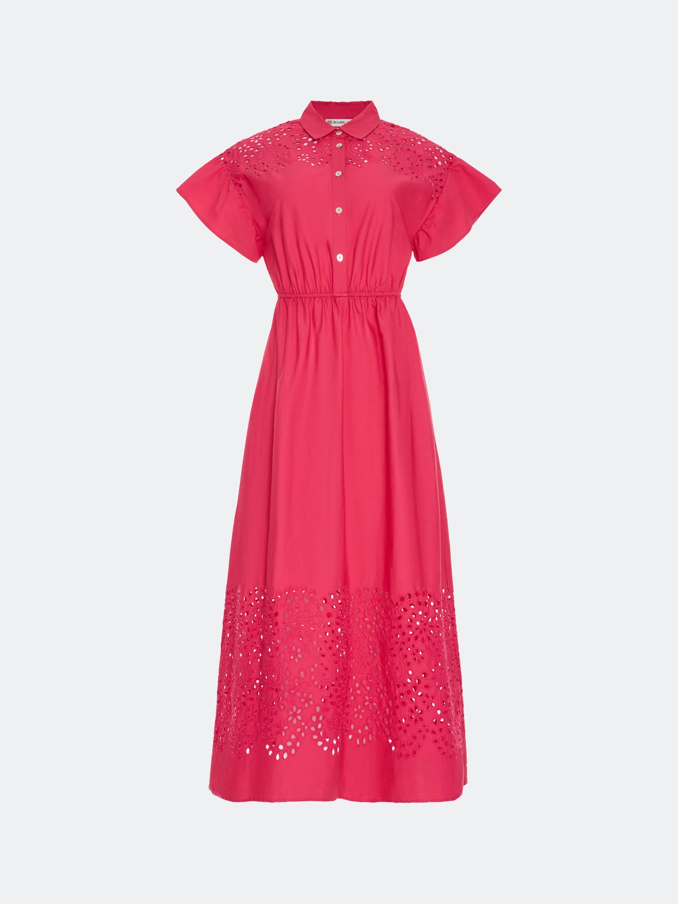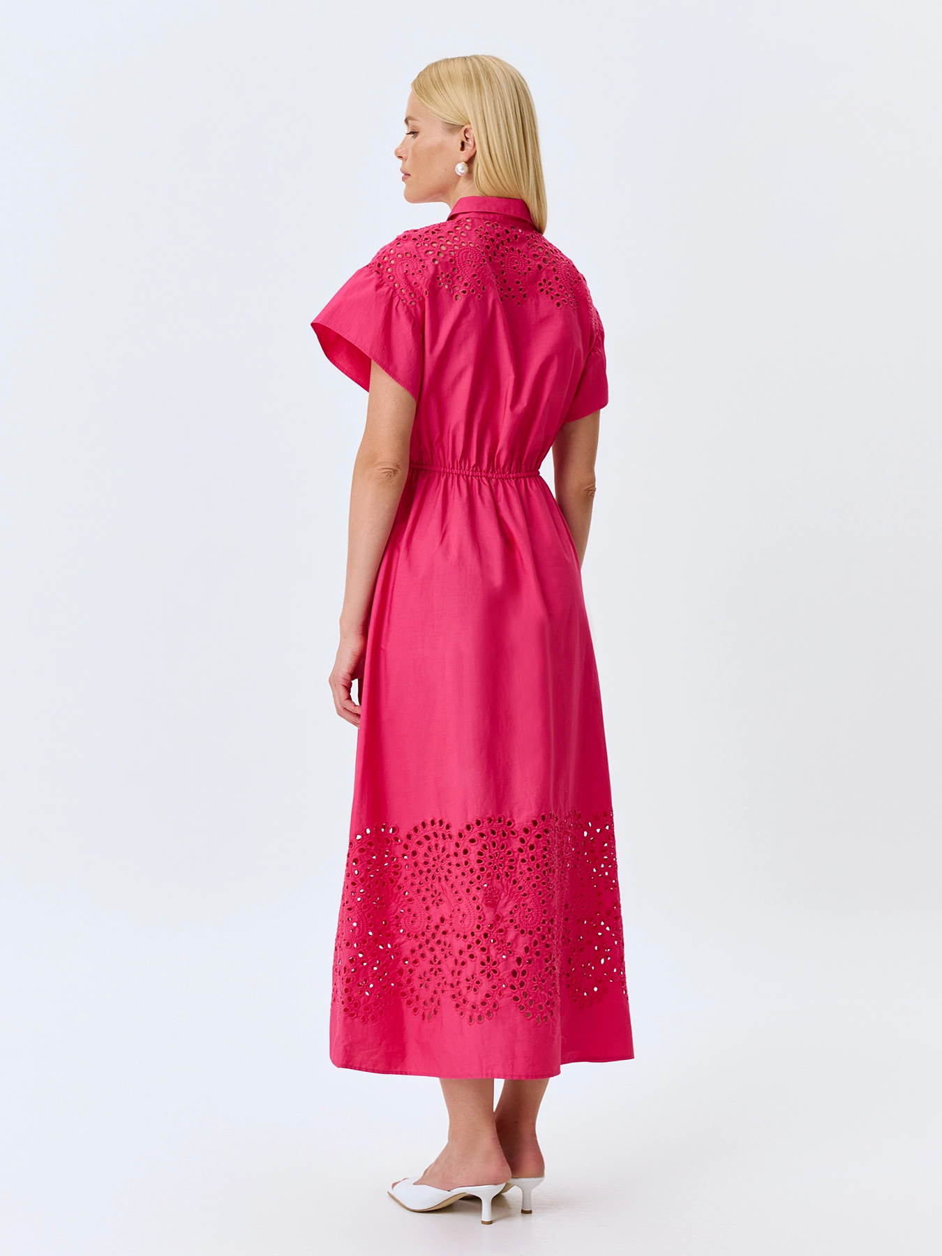 Яркое платье-миди из 100% хлопка с вышивкой ришелье. Приталенный силуэт. Резинка по линии талии. Отложной воротник дополнен планкой с пуговицами. Спущенная линия плеч и укороченные рукава-крылышки. Боковые карманы в швах.