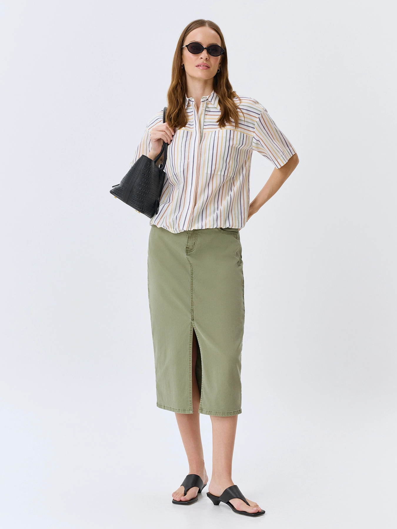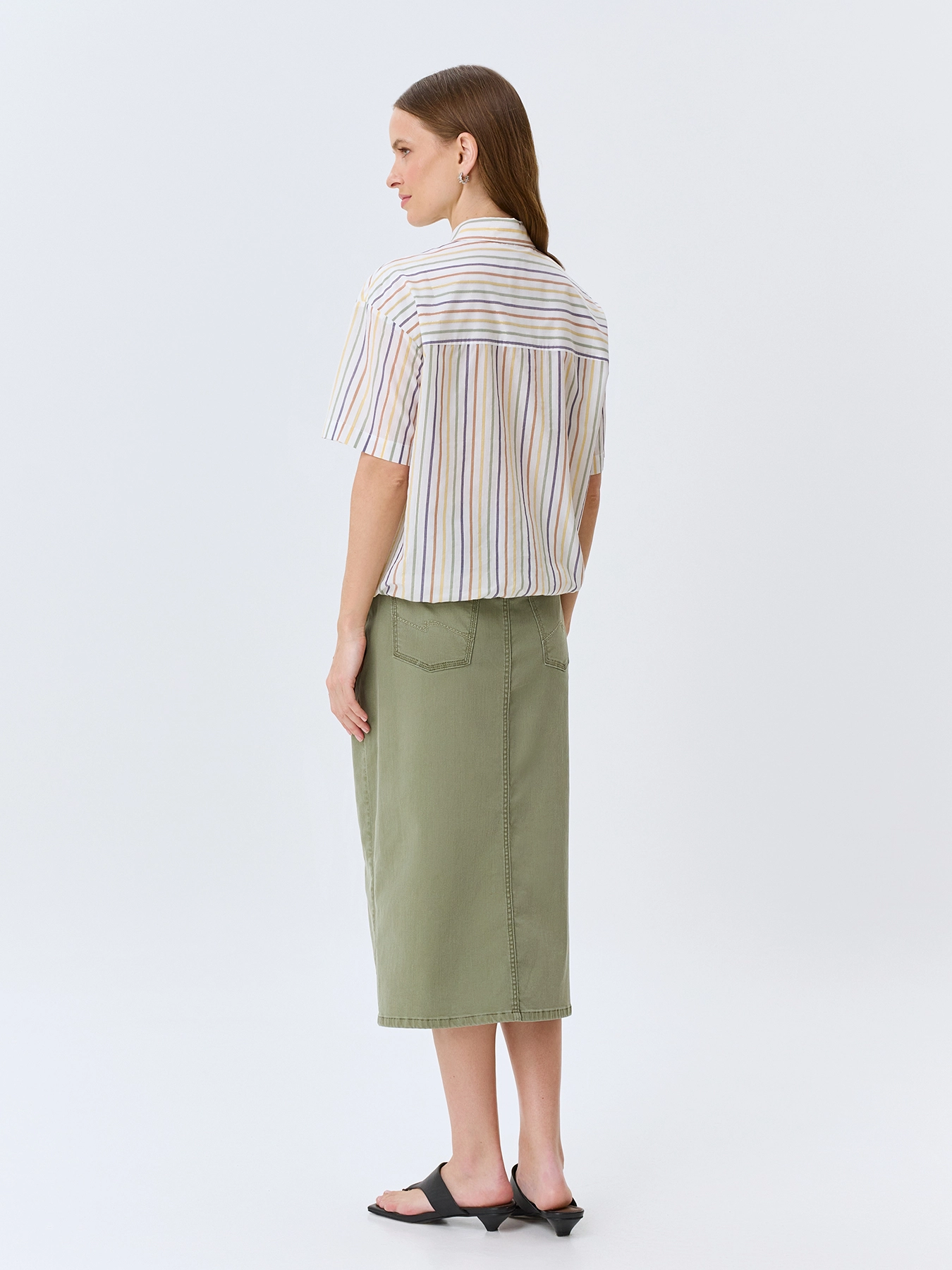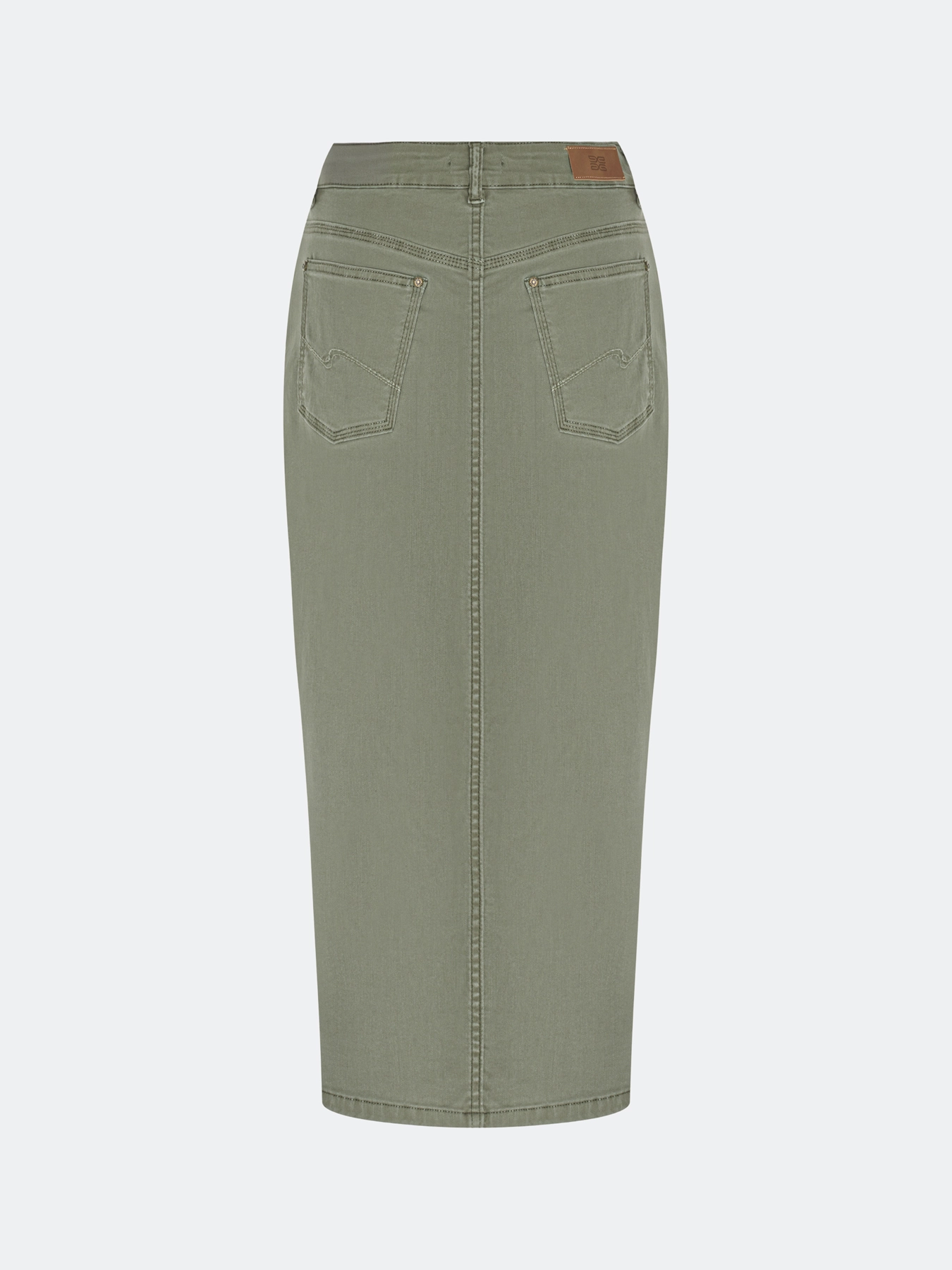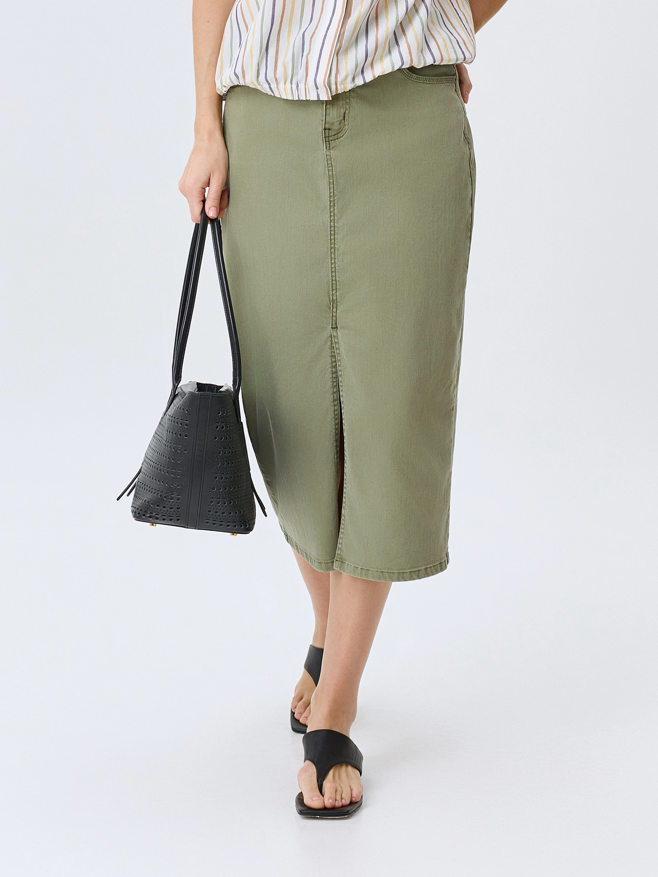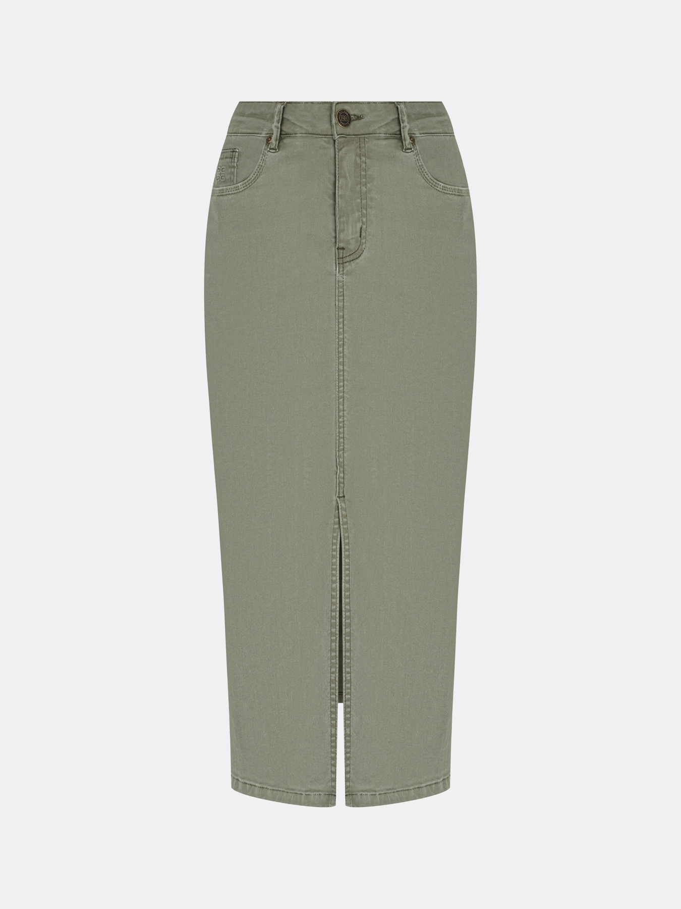 Оливковая джинсовая юбка-миди. Прямой силуэт. Застежка на молнию и металлическую пуговицу. Пять карманов. Дополнена акцентным разрезом спереди и вышивкой в цвет на задних карманах. В составе спандекс.