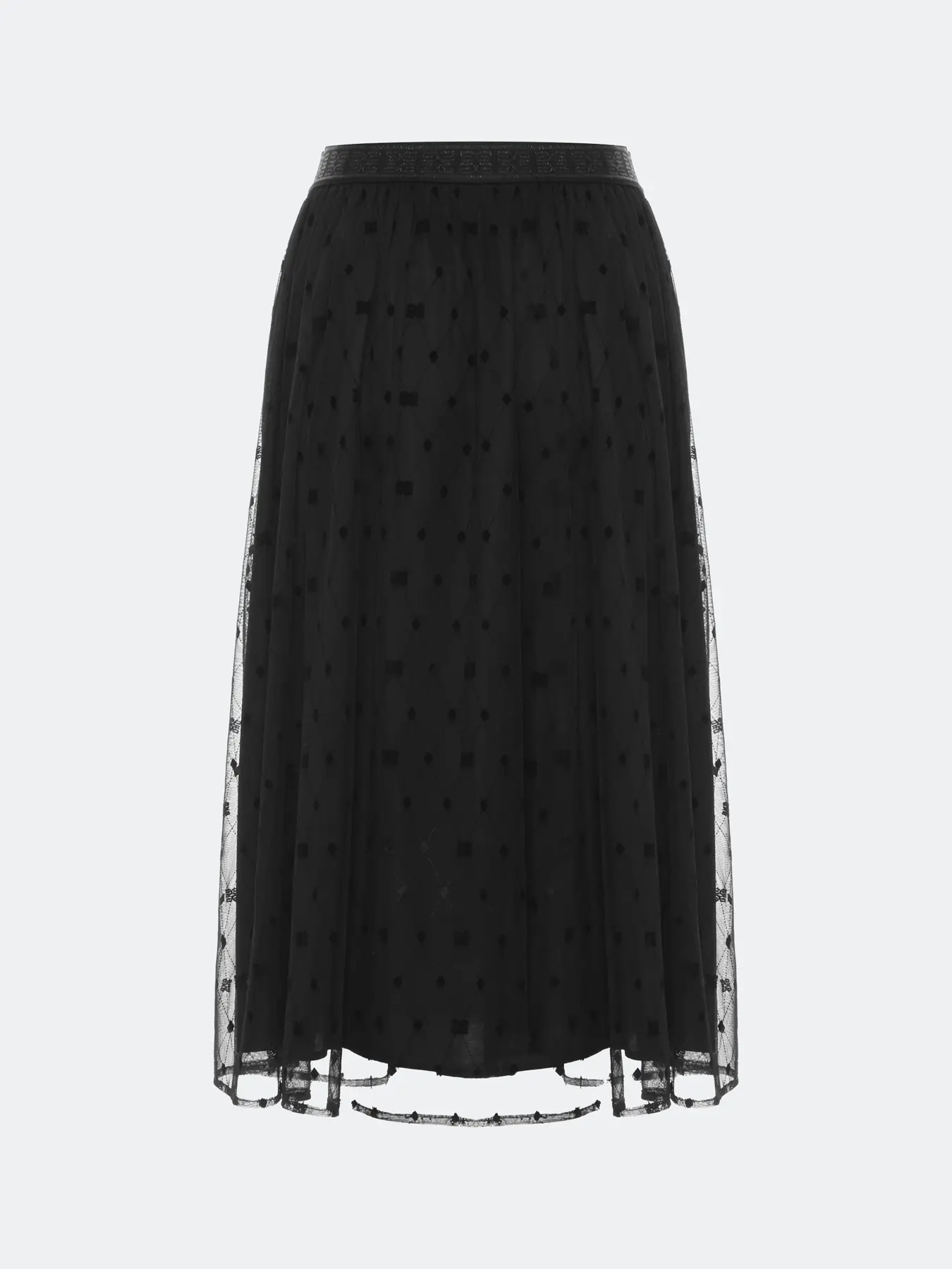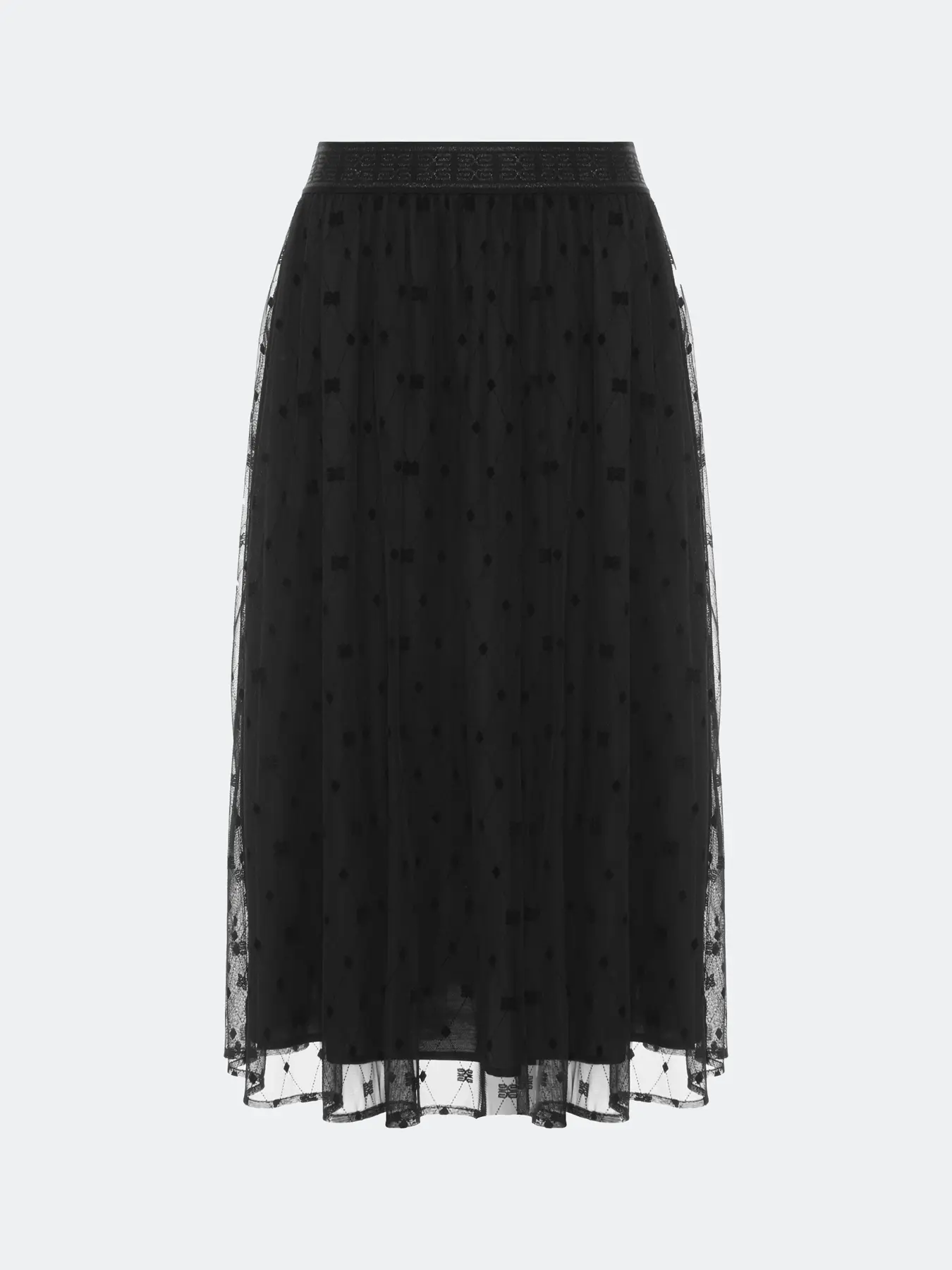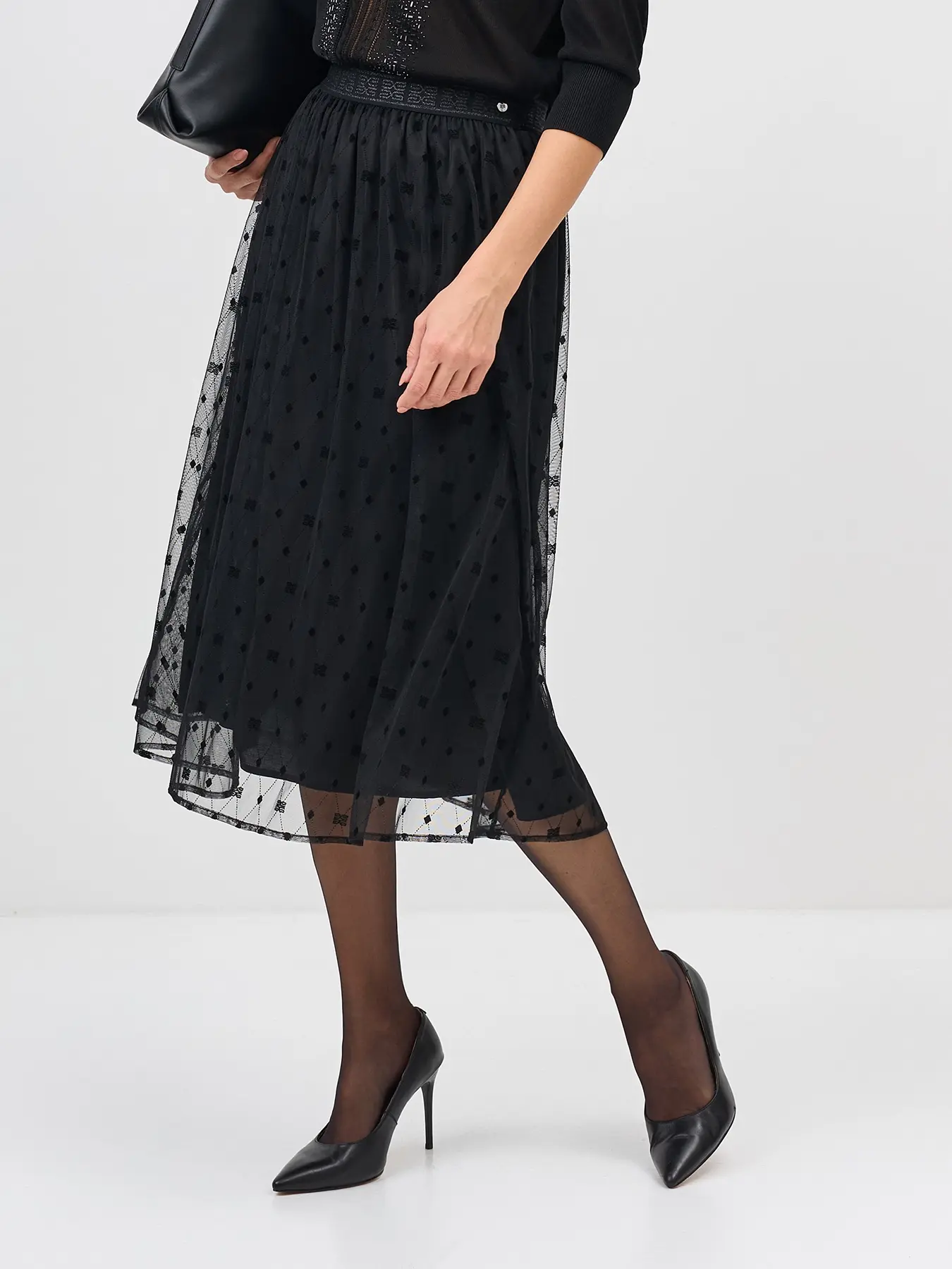 Юбка  из сетки с бархатным лого принтом. А-силуэт. Длина миди. Резинка по линии талии. Подкладка из вискозы.