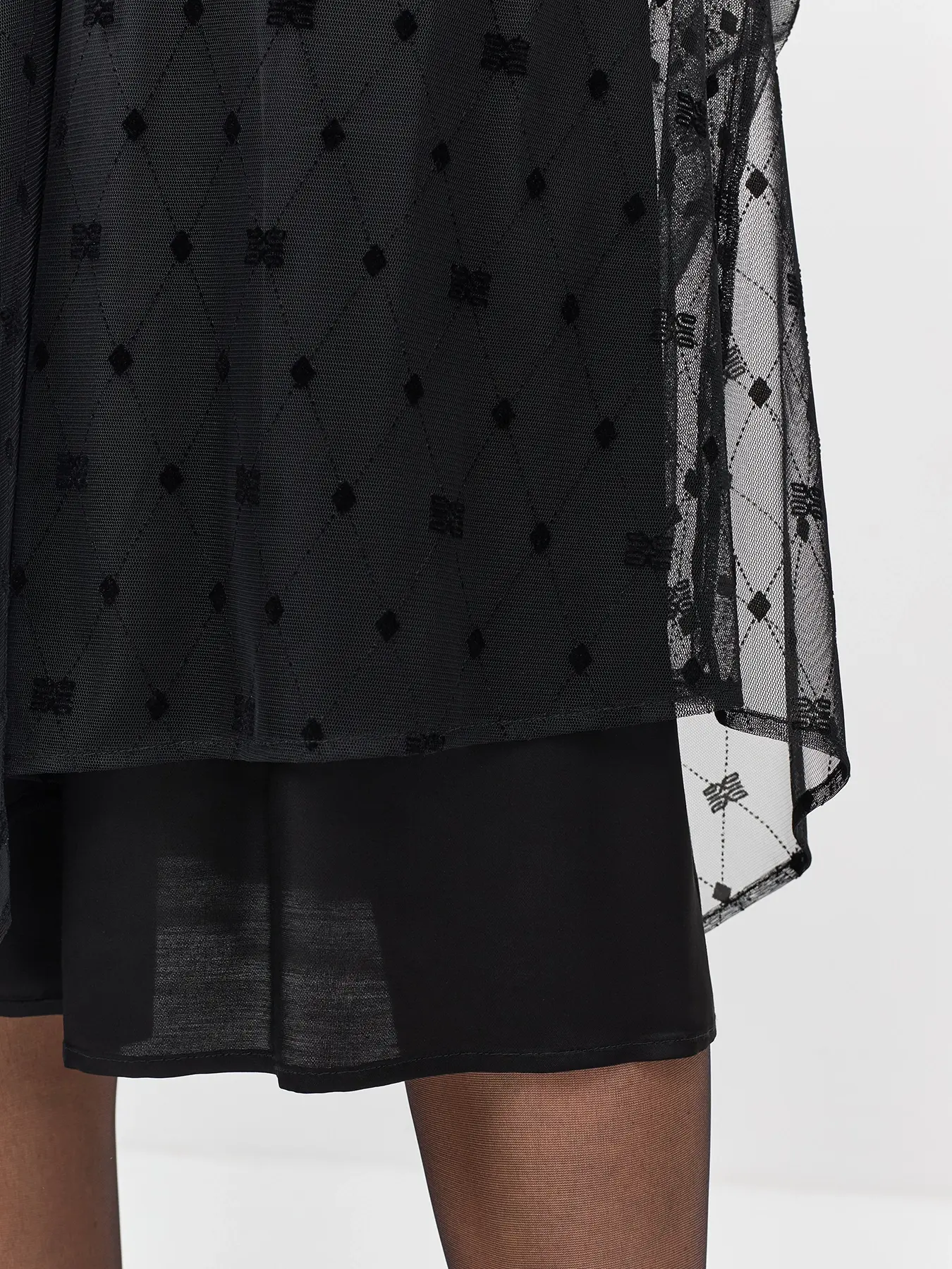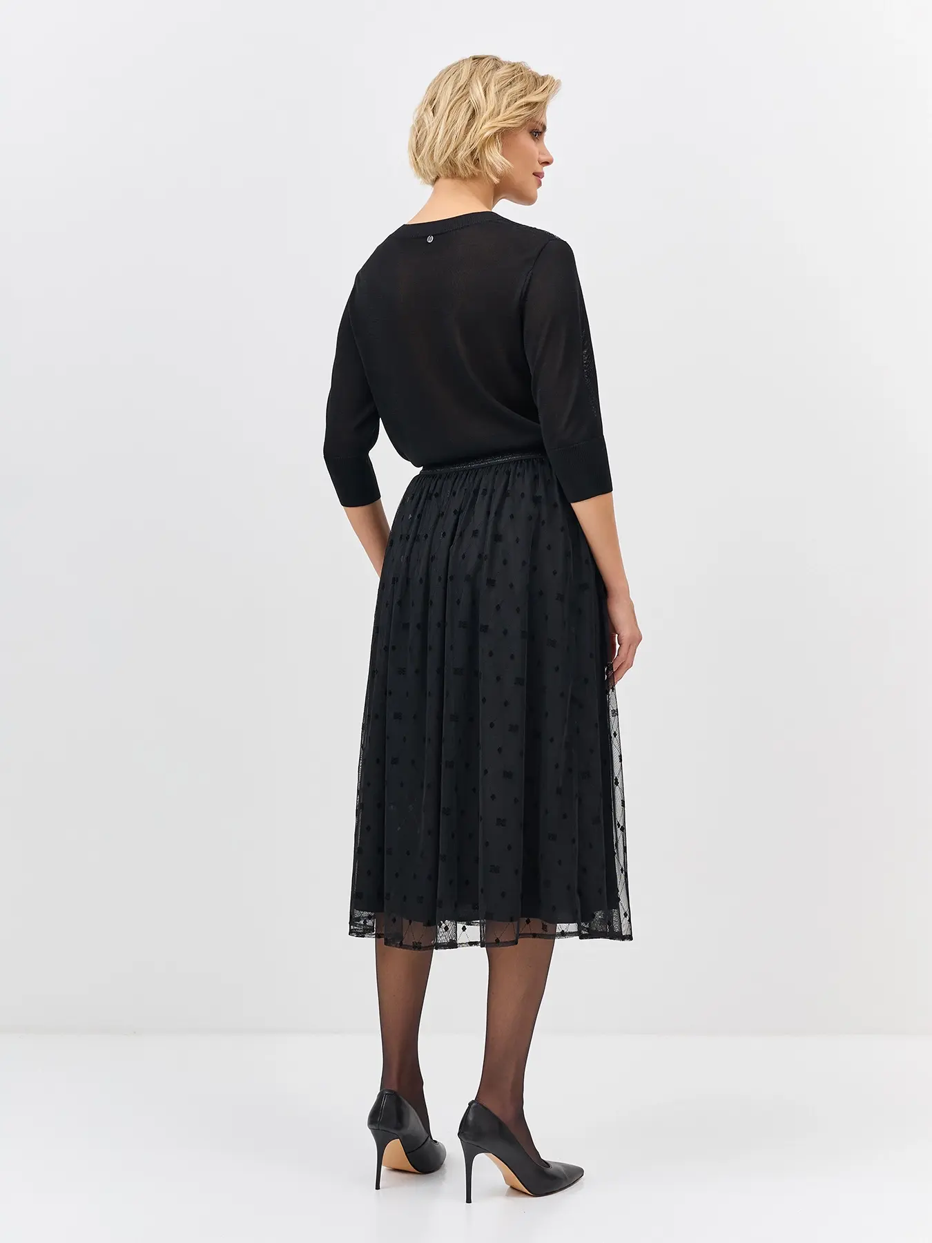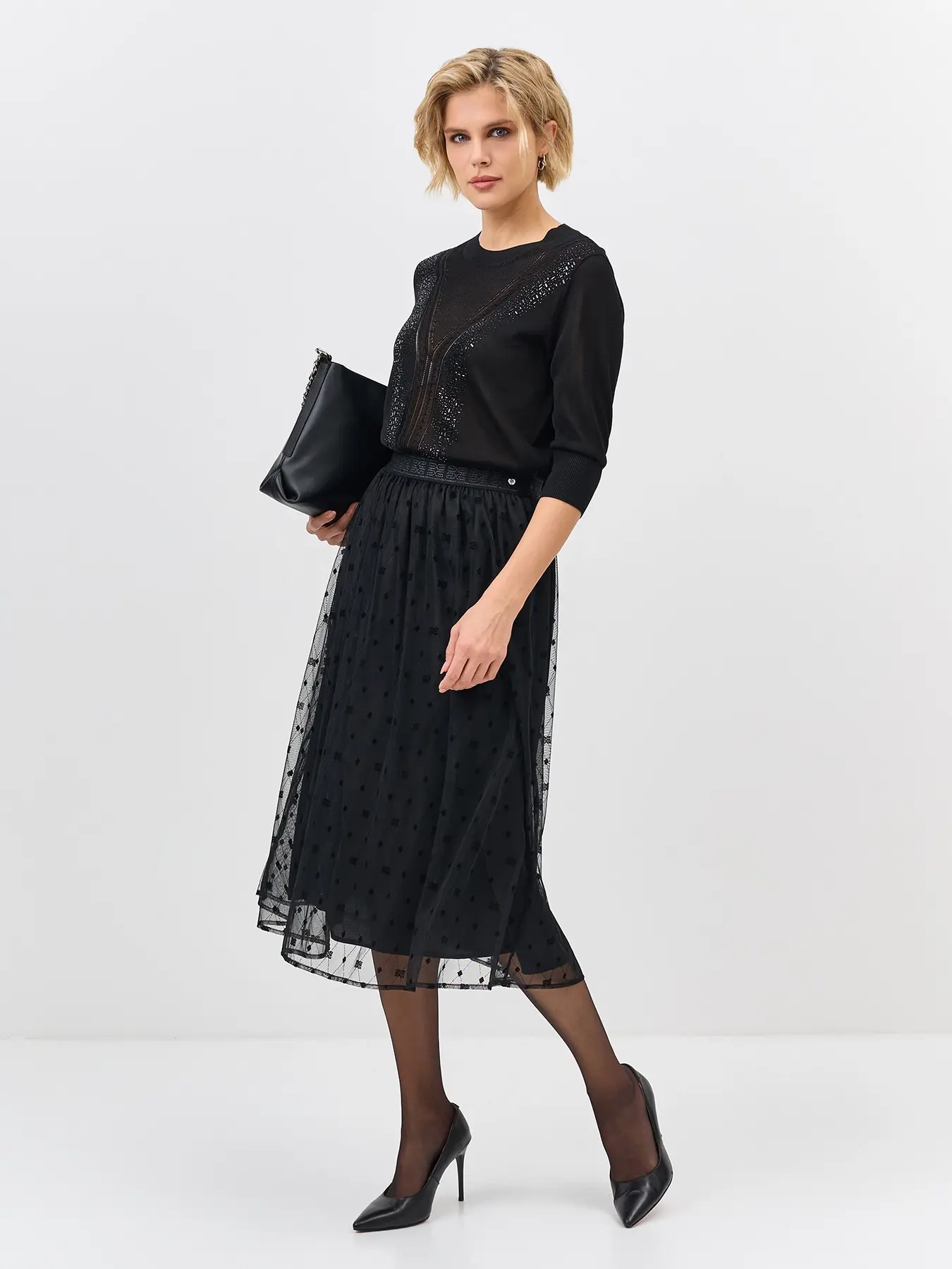 Юбка  из сетки с бархатным лого принтом. А-силуэт. Длина миди. Резинка по линии талии. Подкладка из вискозы.