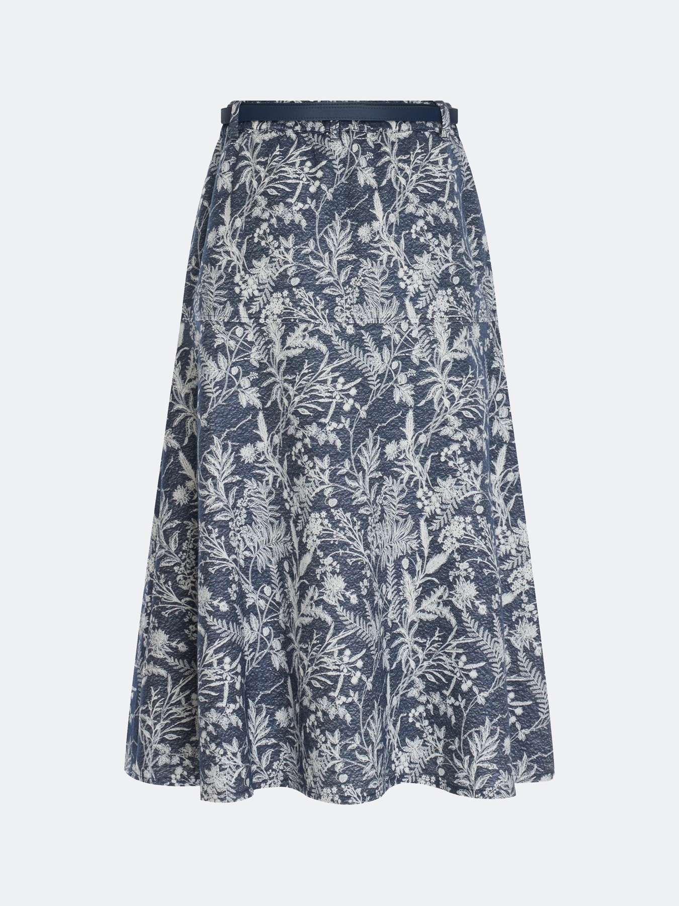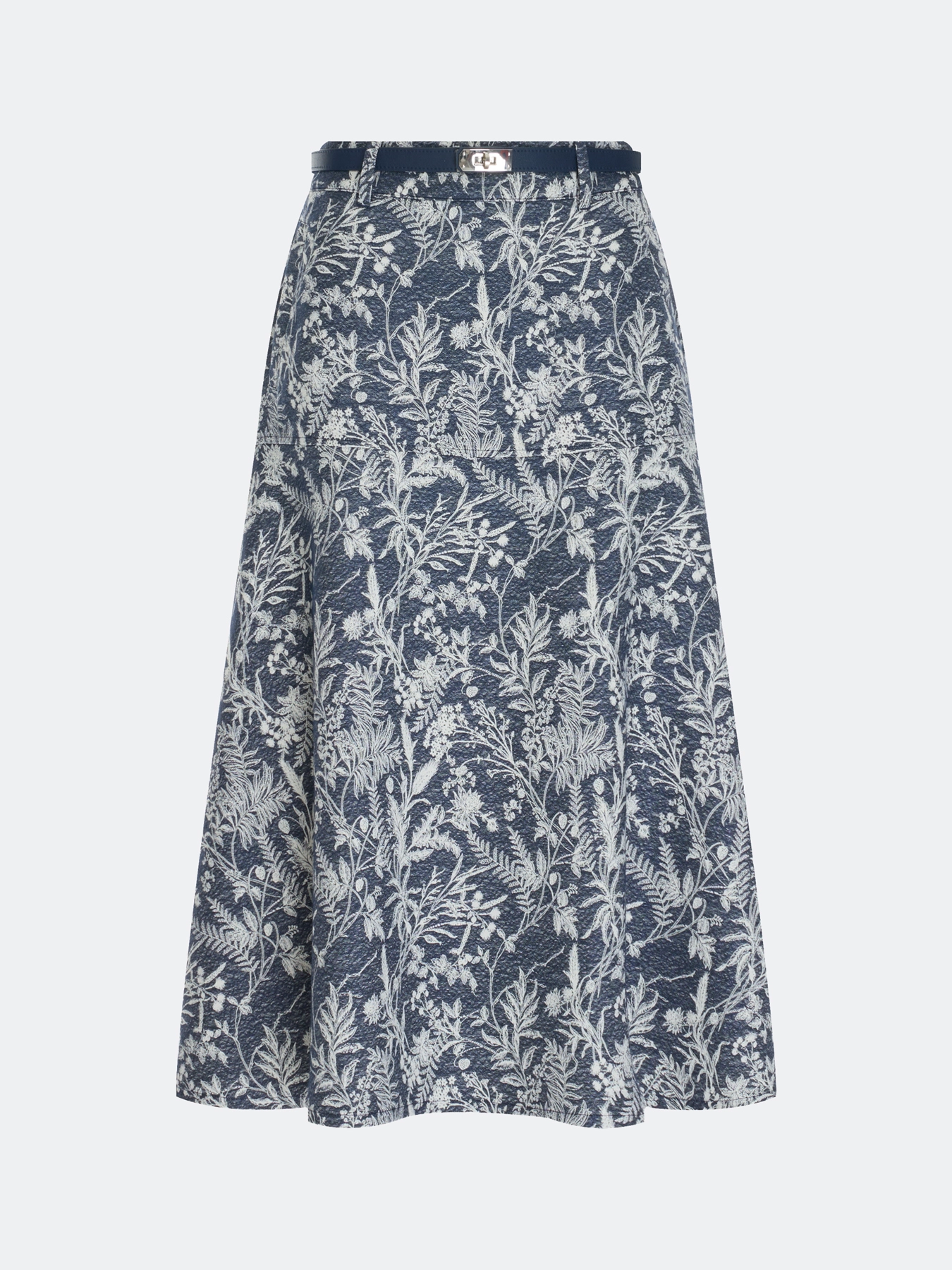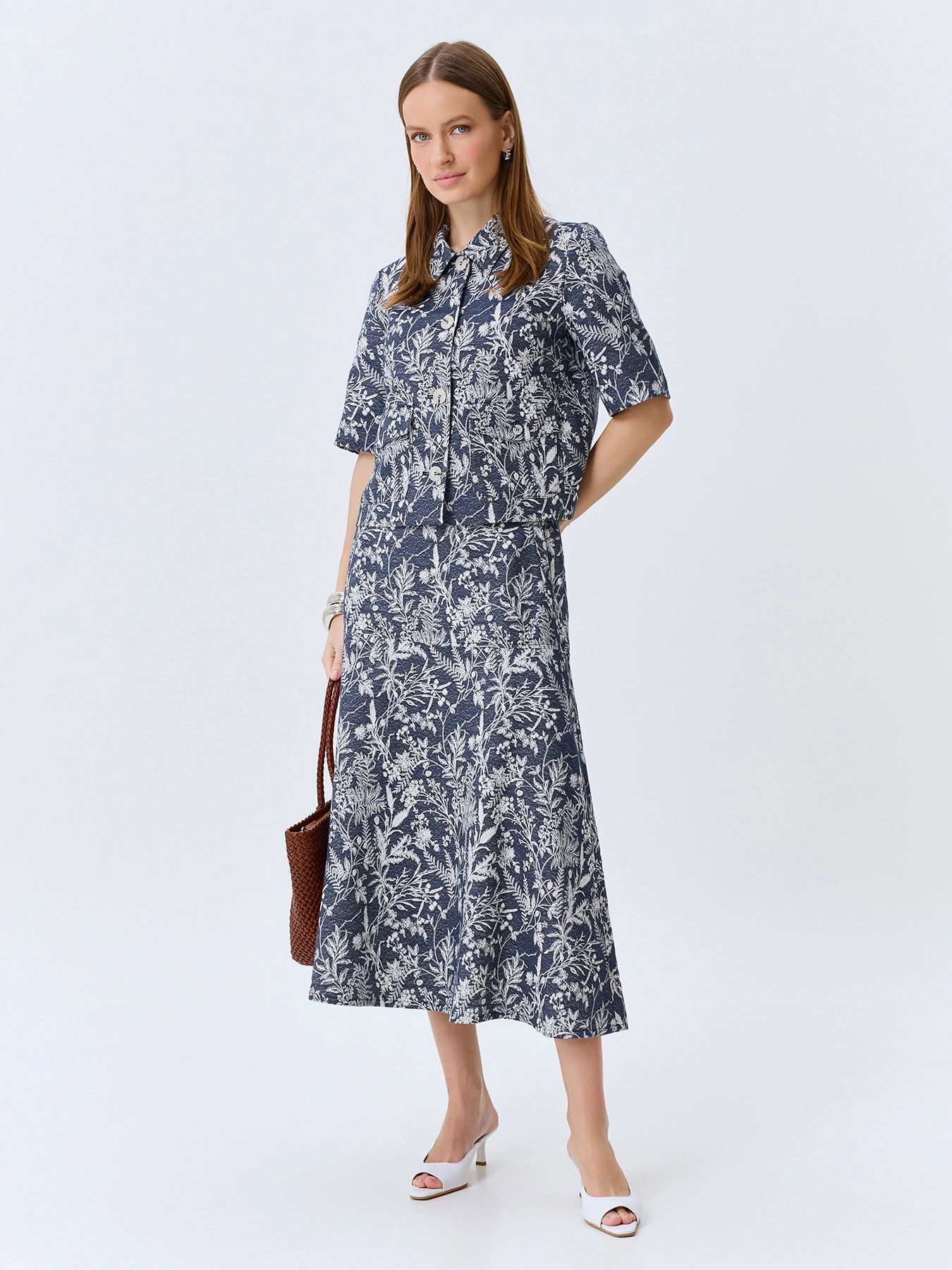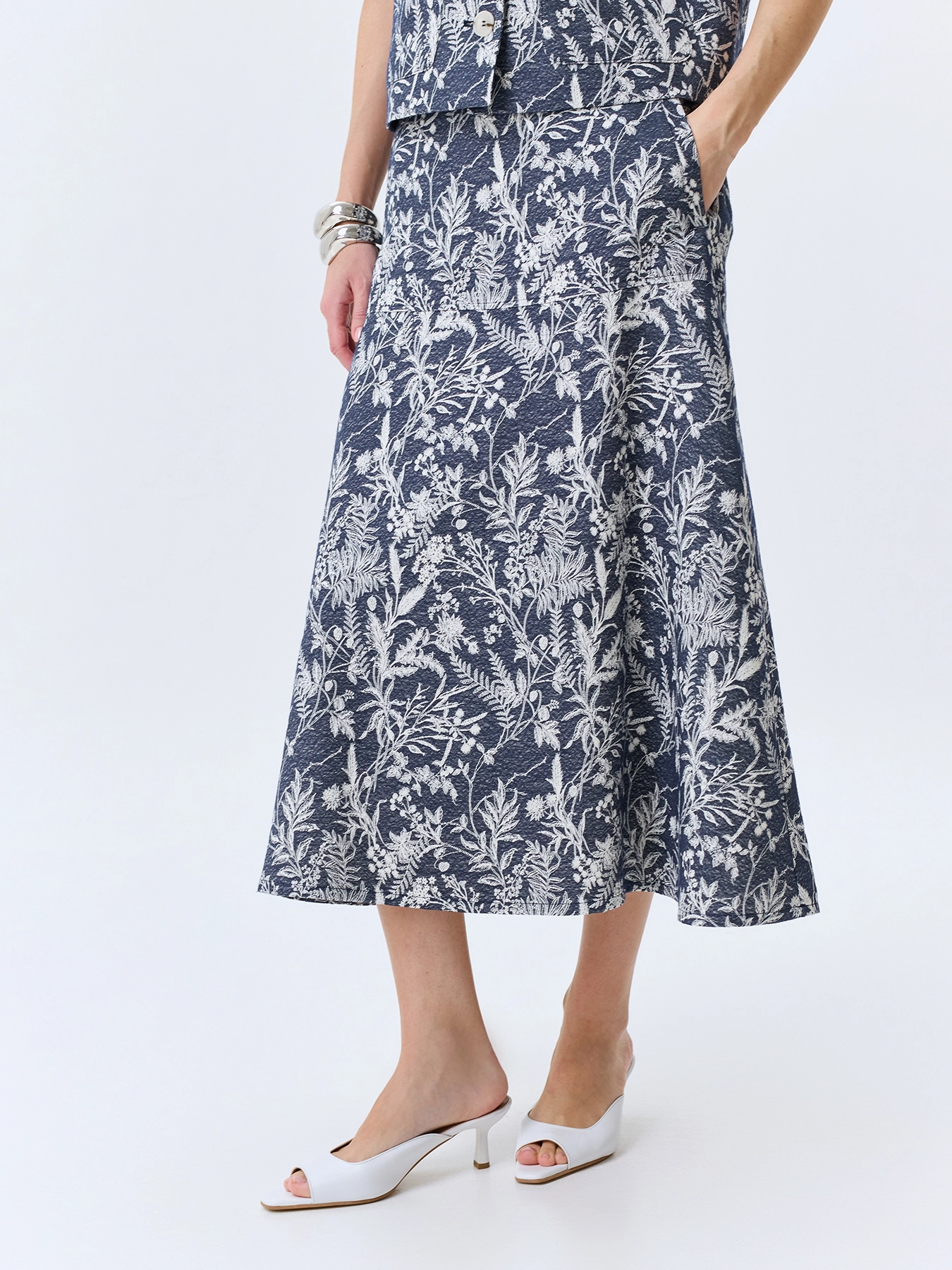 Новинка от немецкого бренда Bulmer – стильная юбка из жаккардового денима! А-силуэт подчеркнёт вашу фигуру, а длина миди сделает образ элегантным и современным. Принт с цветочными мотивами добавит яркости вашему гардеробу и станет идеальным акцентом любого лука. Изготовлена из качественной вискозы, представлена в синей гамме. Подходит для российских размеров от 44 до 54 (европейские размеры 38–46).