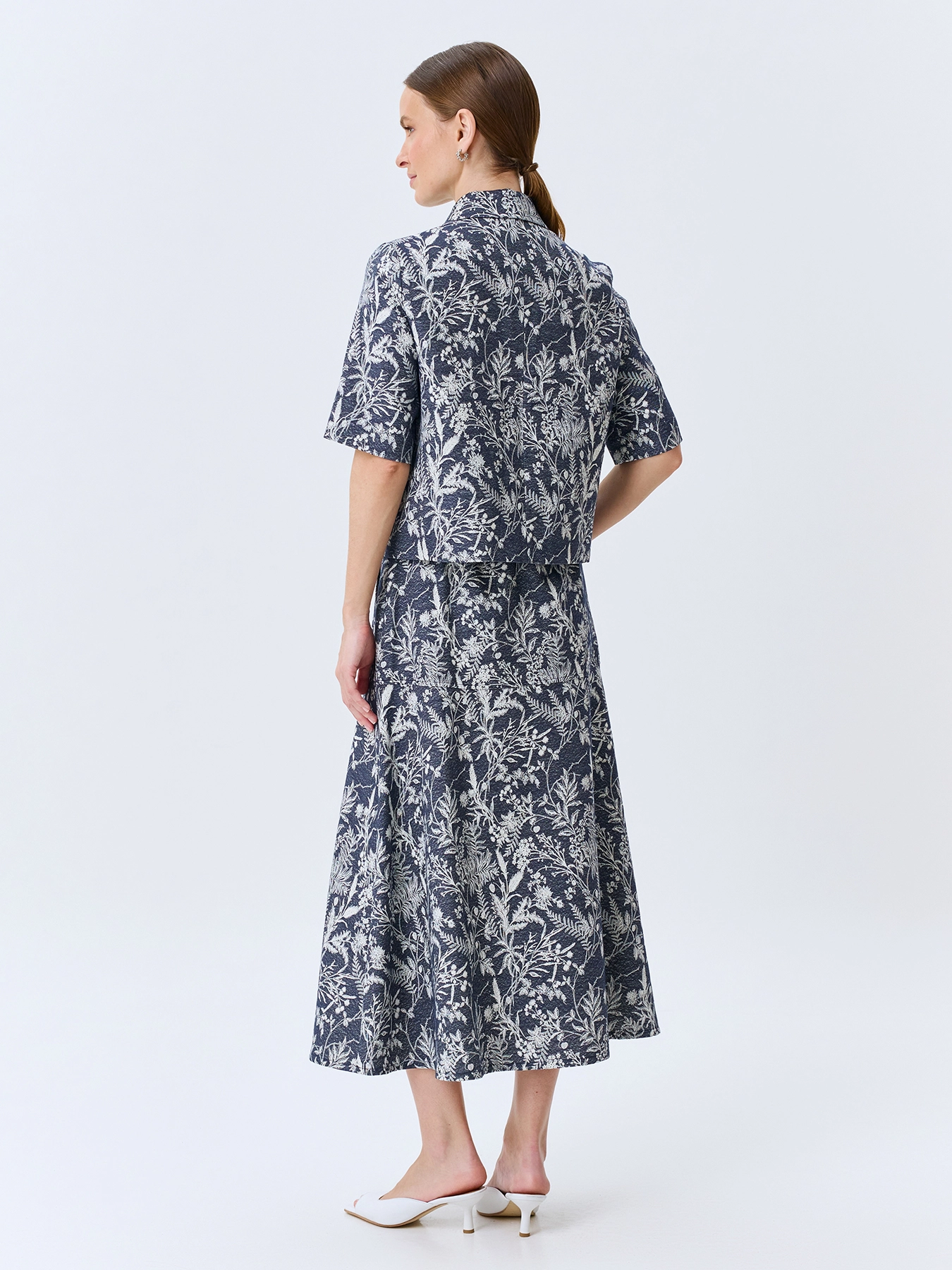 Жаккардовая юбка-миди с флоральным принтом. Силуэт трапеция дополнен мягкими складками. Застежка на молнию. Резинка по линии талии по спинке. В комплекте ремень с пряжкой из эко кожи. Боковые карманы в швах. В составе вискоза и лен.