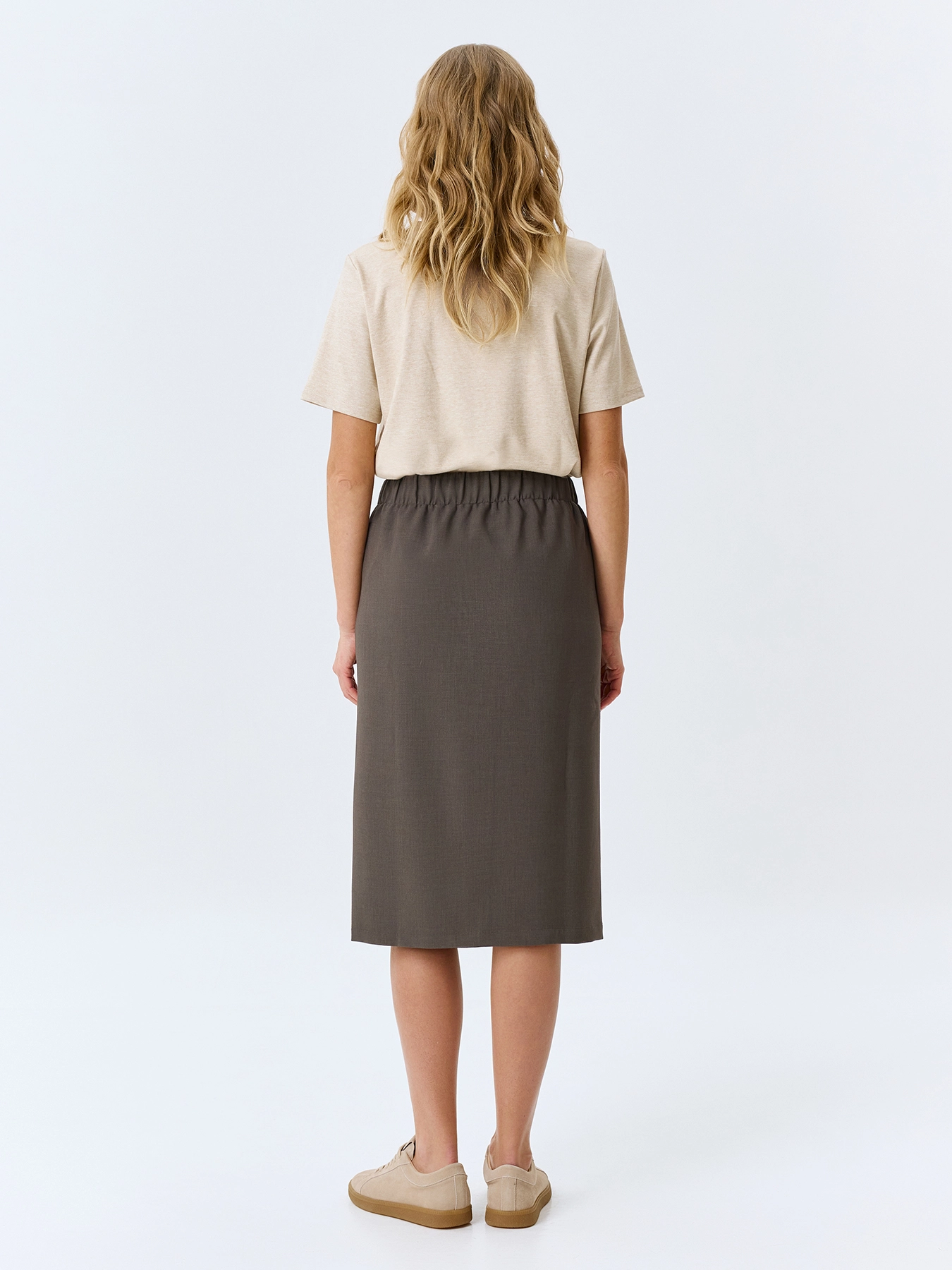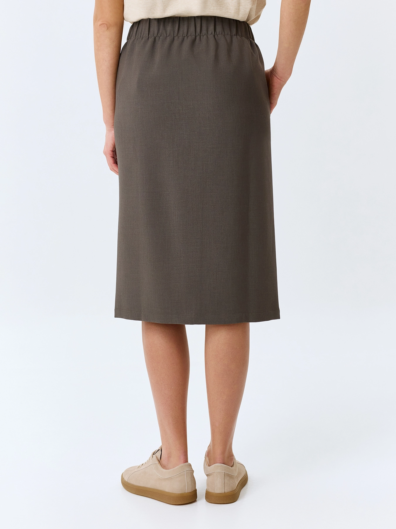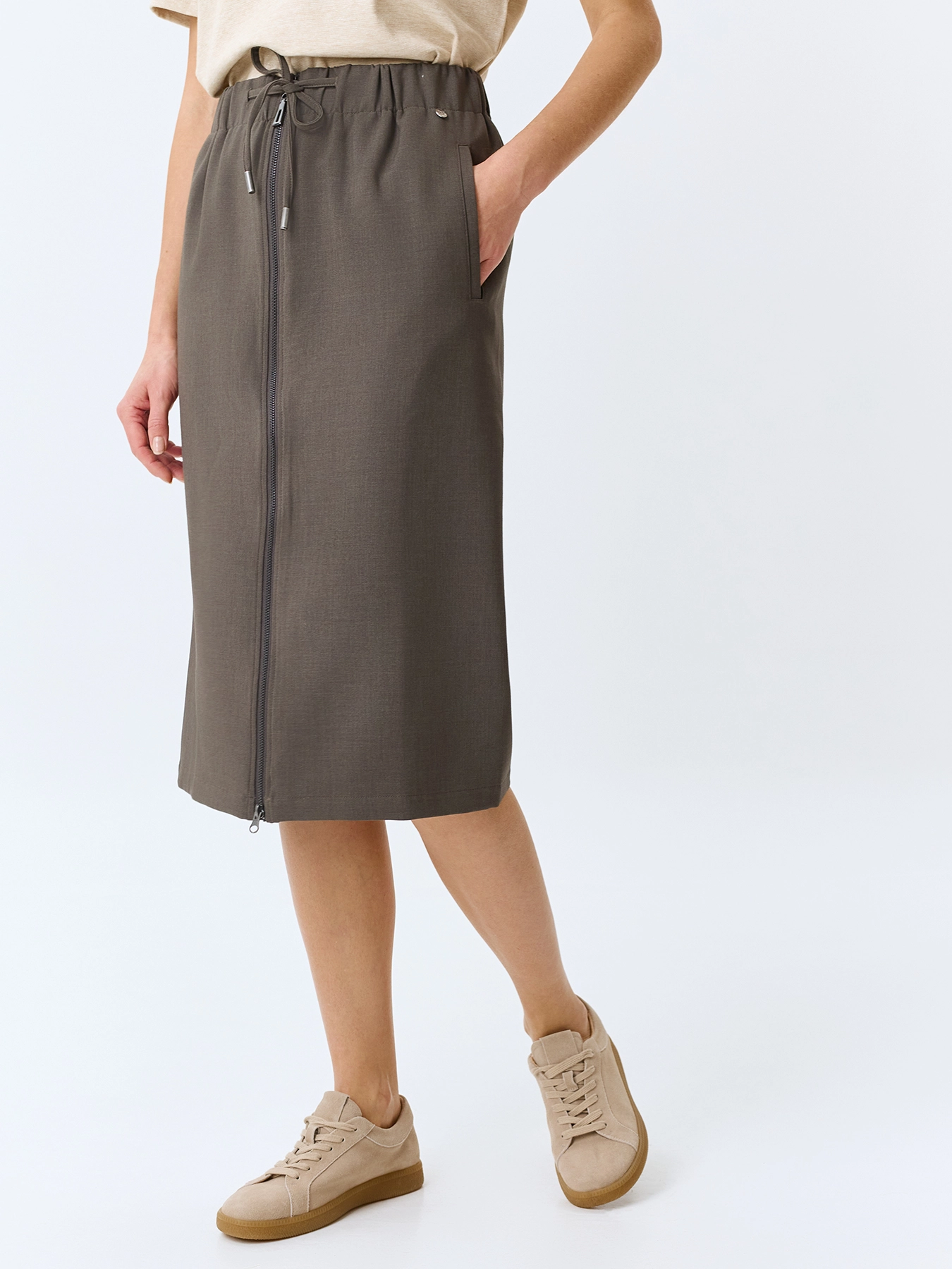 Юбка-миди из эластичной костюмной поливискозы. Прямой силуэт. Резинка и шнурок по линии талии. Боковые карманы с листочками. Вертикальная функциональная разъемная молния позволяет регулировать высоту разреза.