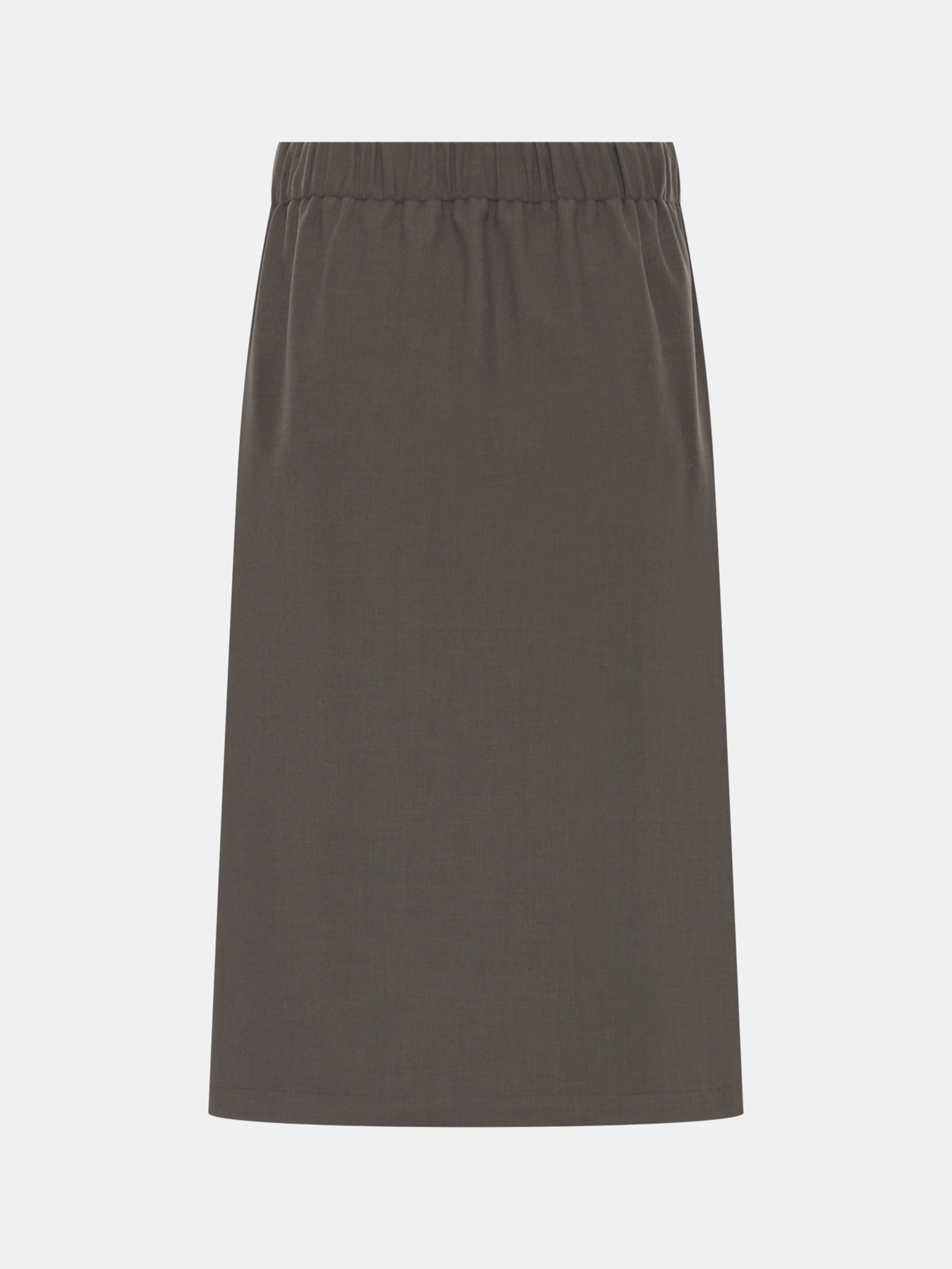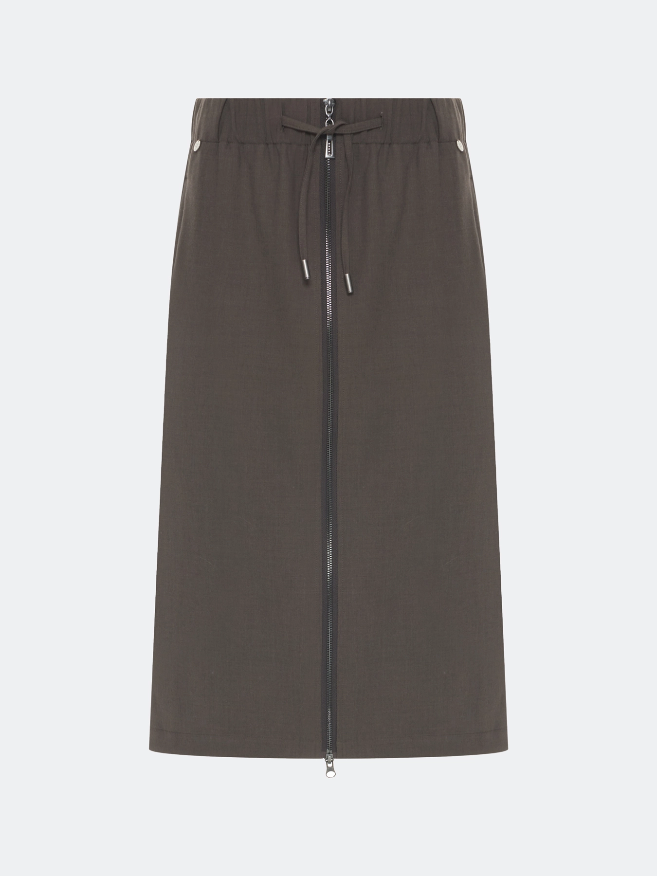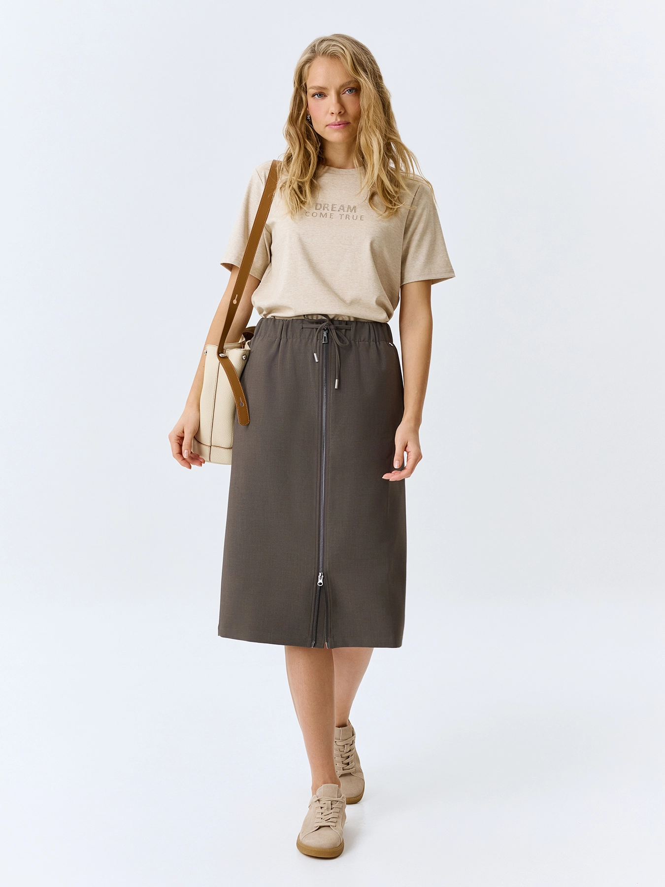 Юбка-миди из эластичной костюмной поливискозы. Прямой силуэт. Резинка и шнурок по линии талии. Боковые карманы с листочками. Вертикальная функциональная разъемная молния позволяет регулировать высоту разреза.