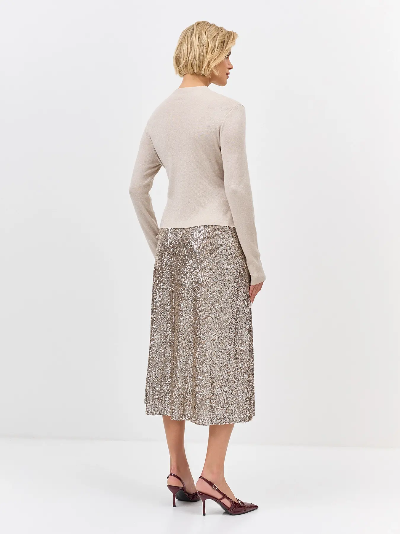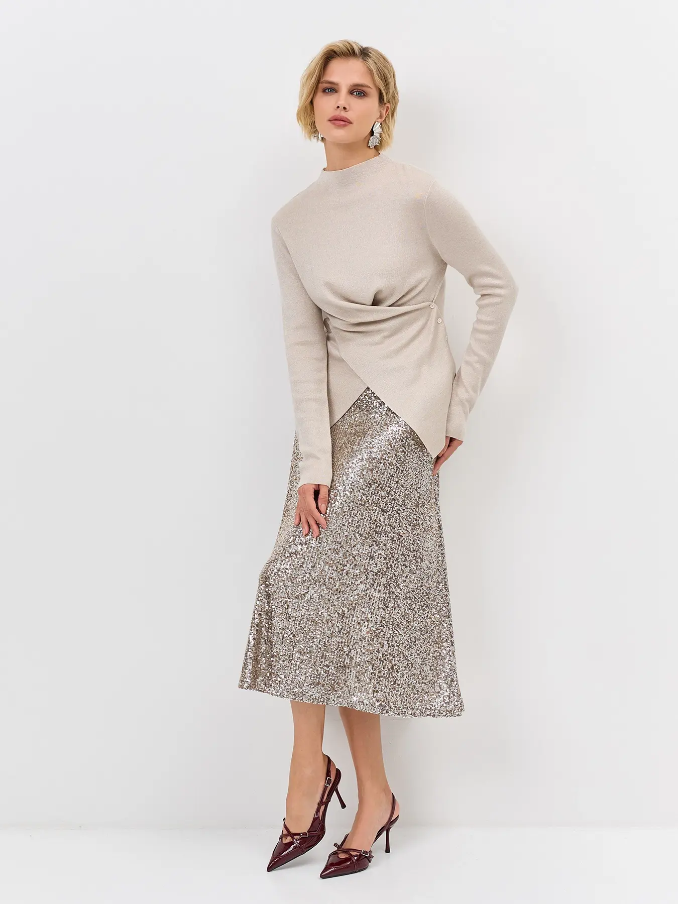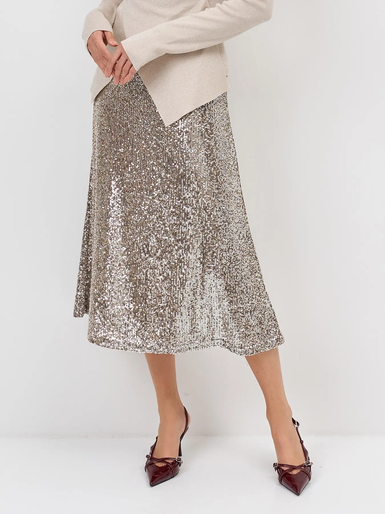 Трикотажная юбка-миди с искрящимися пайетками. Свободный силуэт. Застежка на молнию. Дополнена мягкими складками и шелковистой подкладкой.