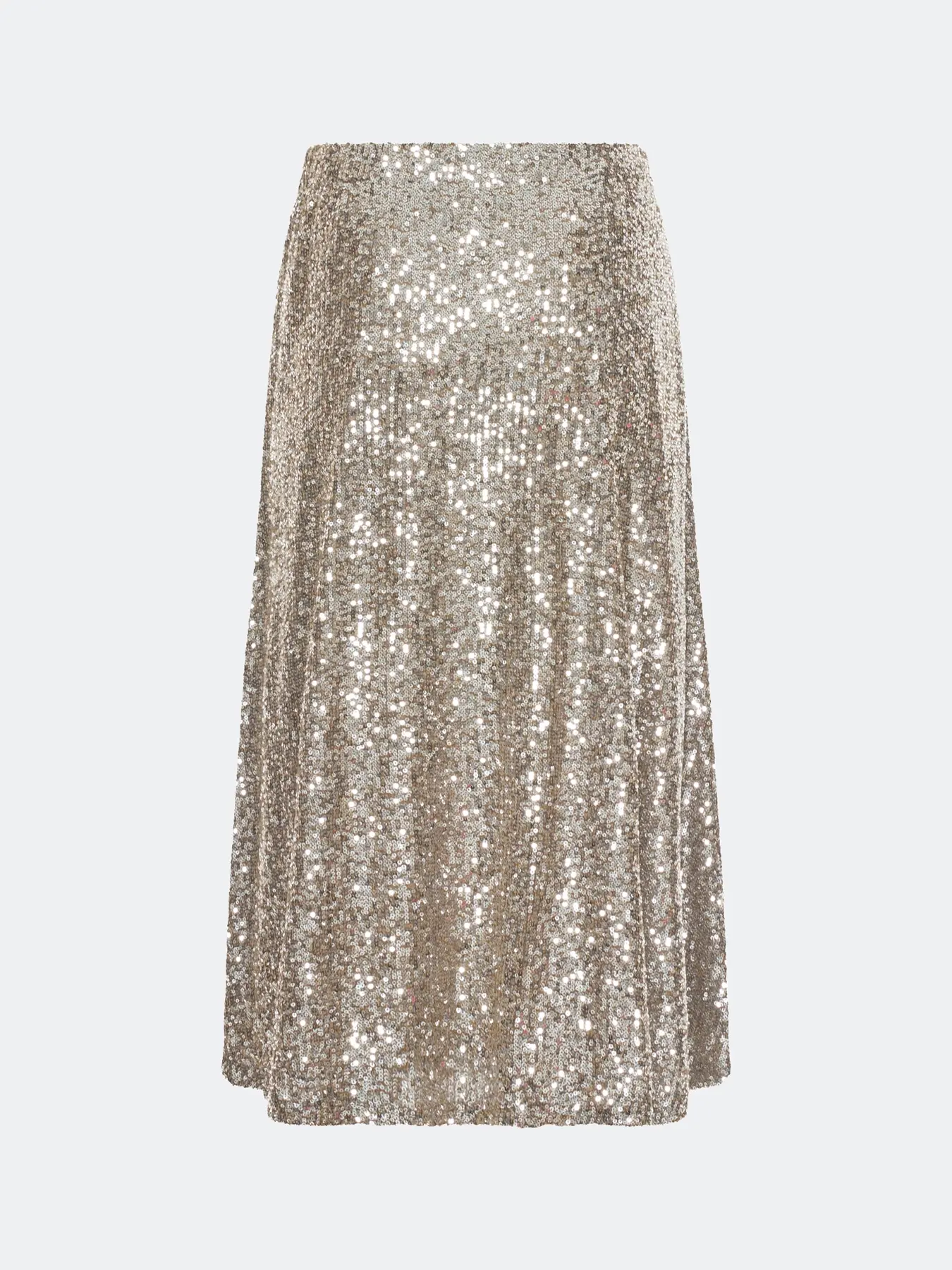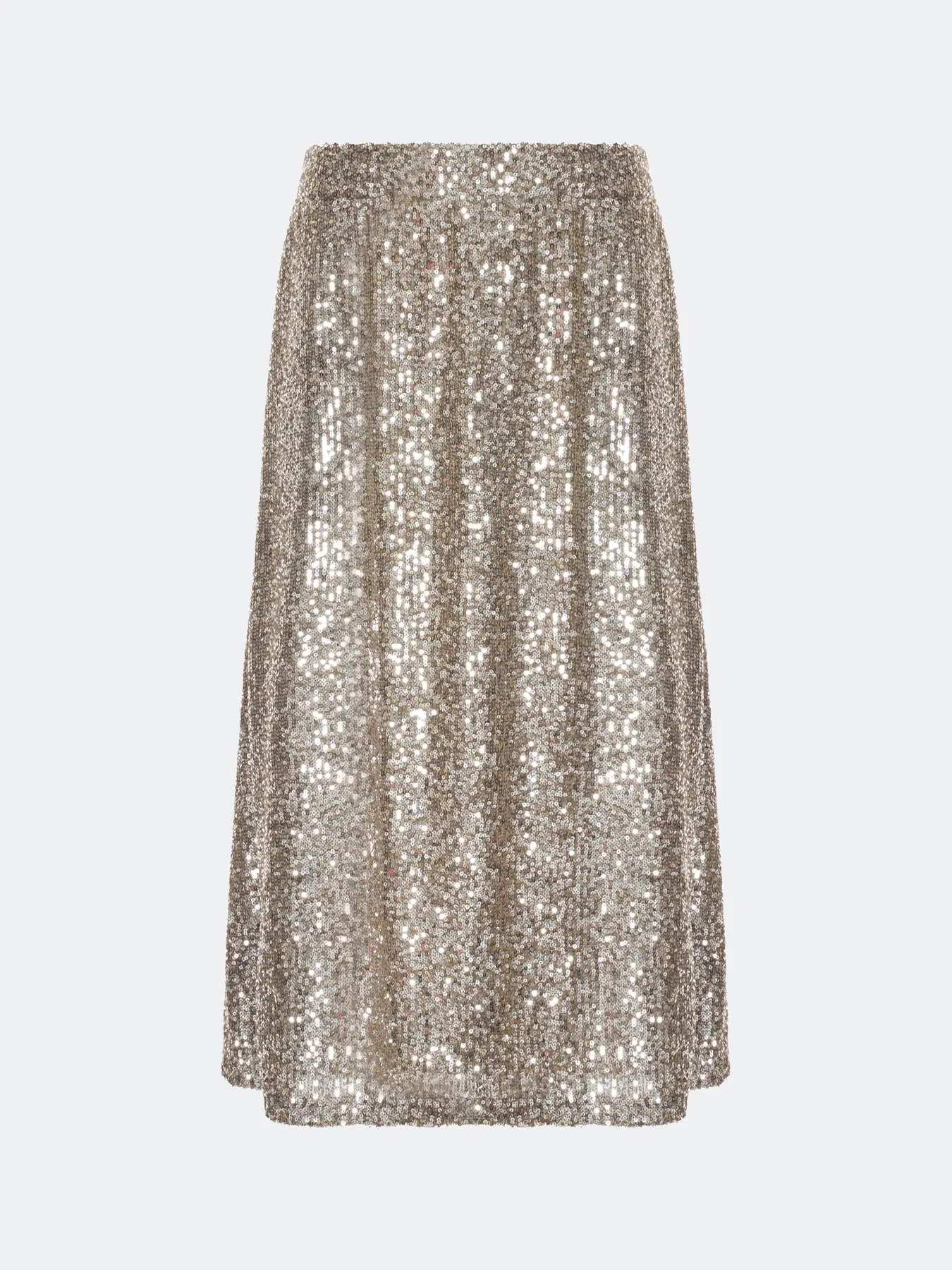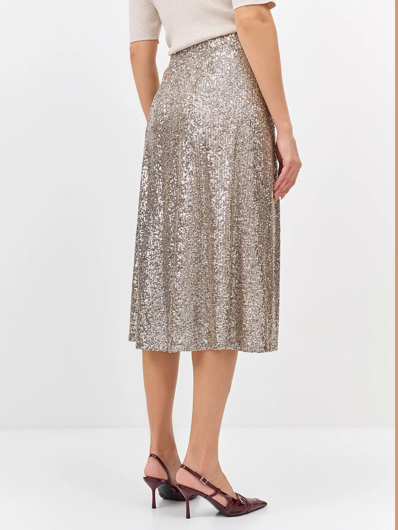 Трикотажная юбка-миди с искрящимися пайетками. Свободный силуэт. Застежка на молнию. Дополнена мягкими складками и шелковистой подкладкой.