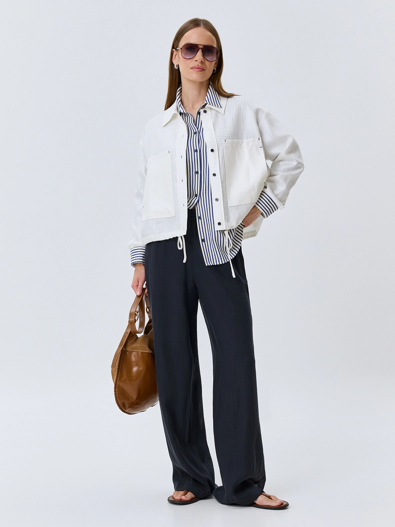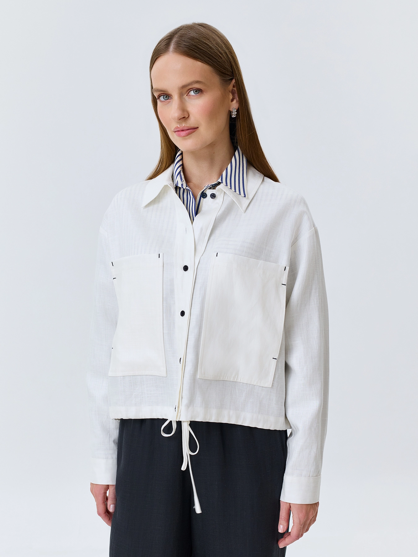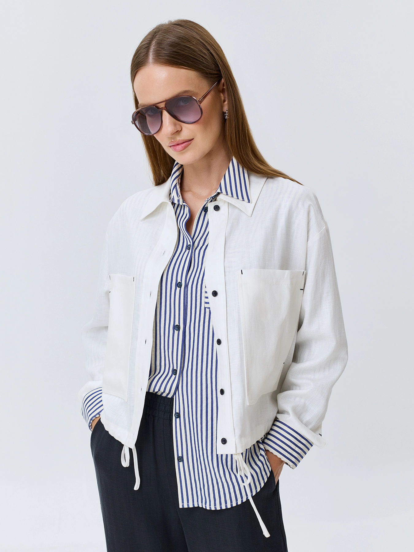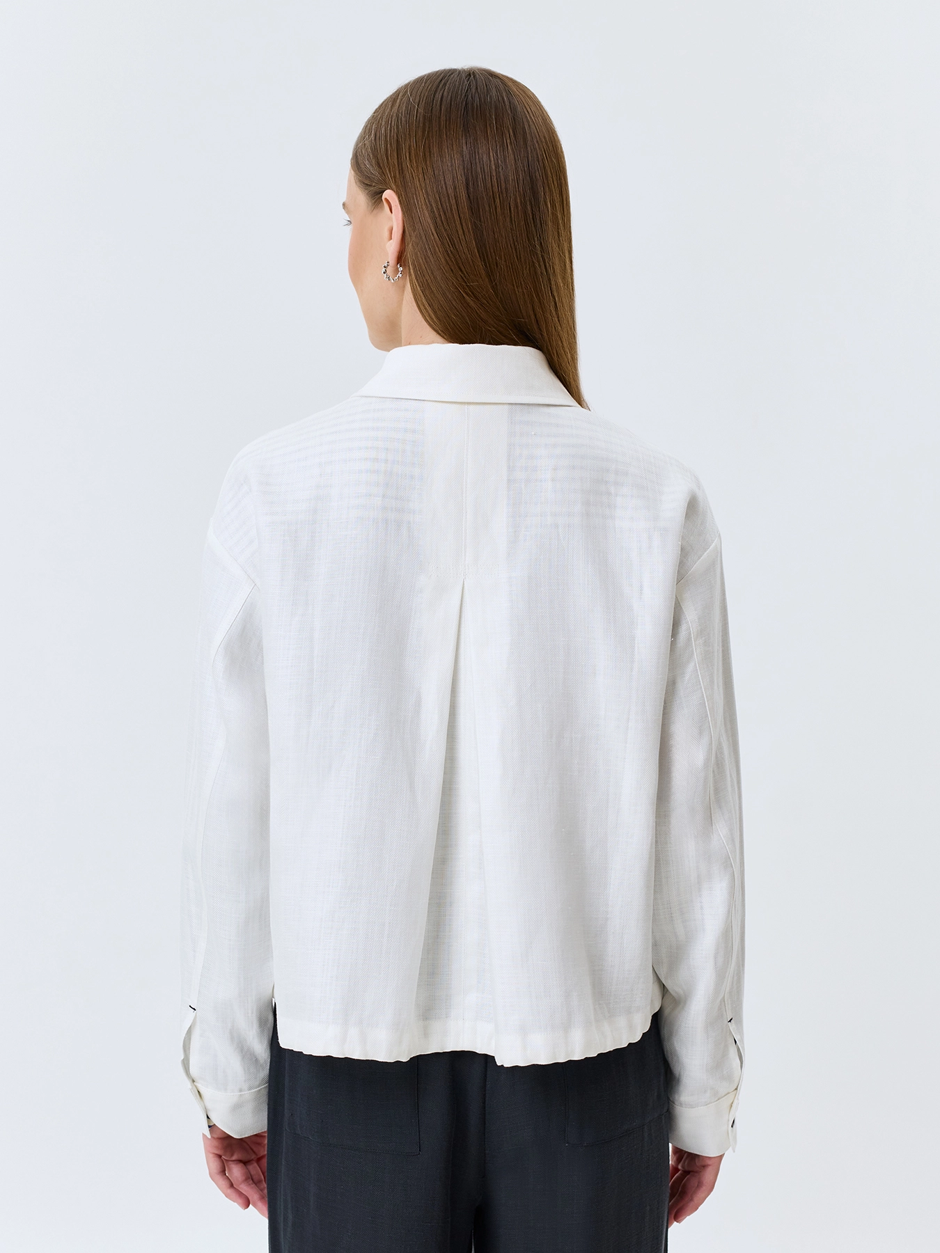 Легкий жакет из тенселя и льна. Свободный силуэт. Отложной воротник. Застежка на контрастные пуговицы. Накладные нагрудные карманы. Спущенная линия плеч и длинные рукава с манжетами по низу. Дополнен контрастными закрепками на карманах.
