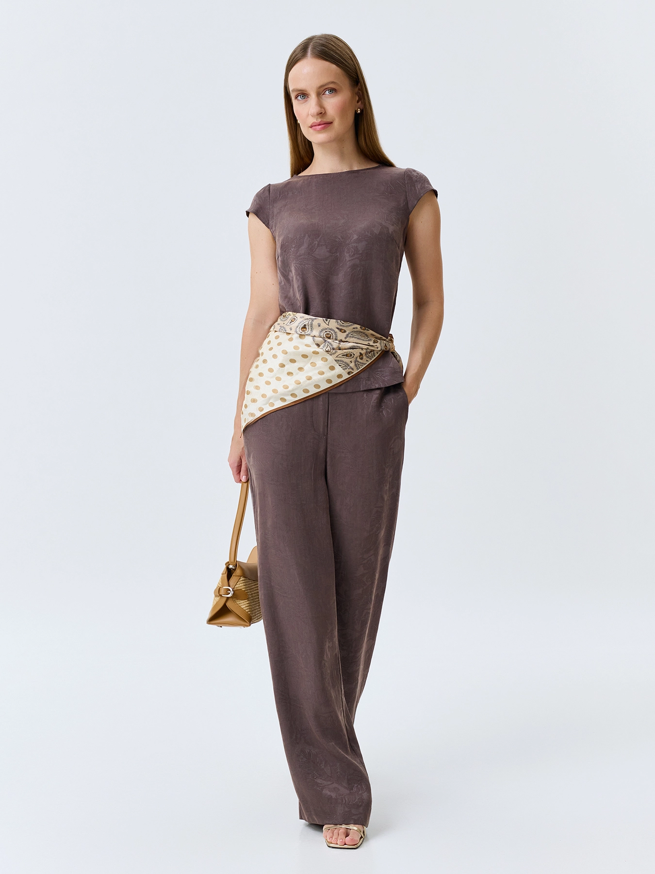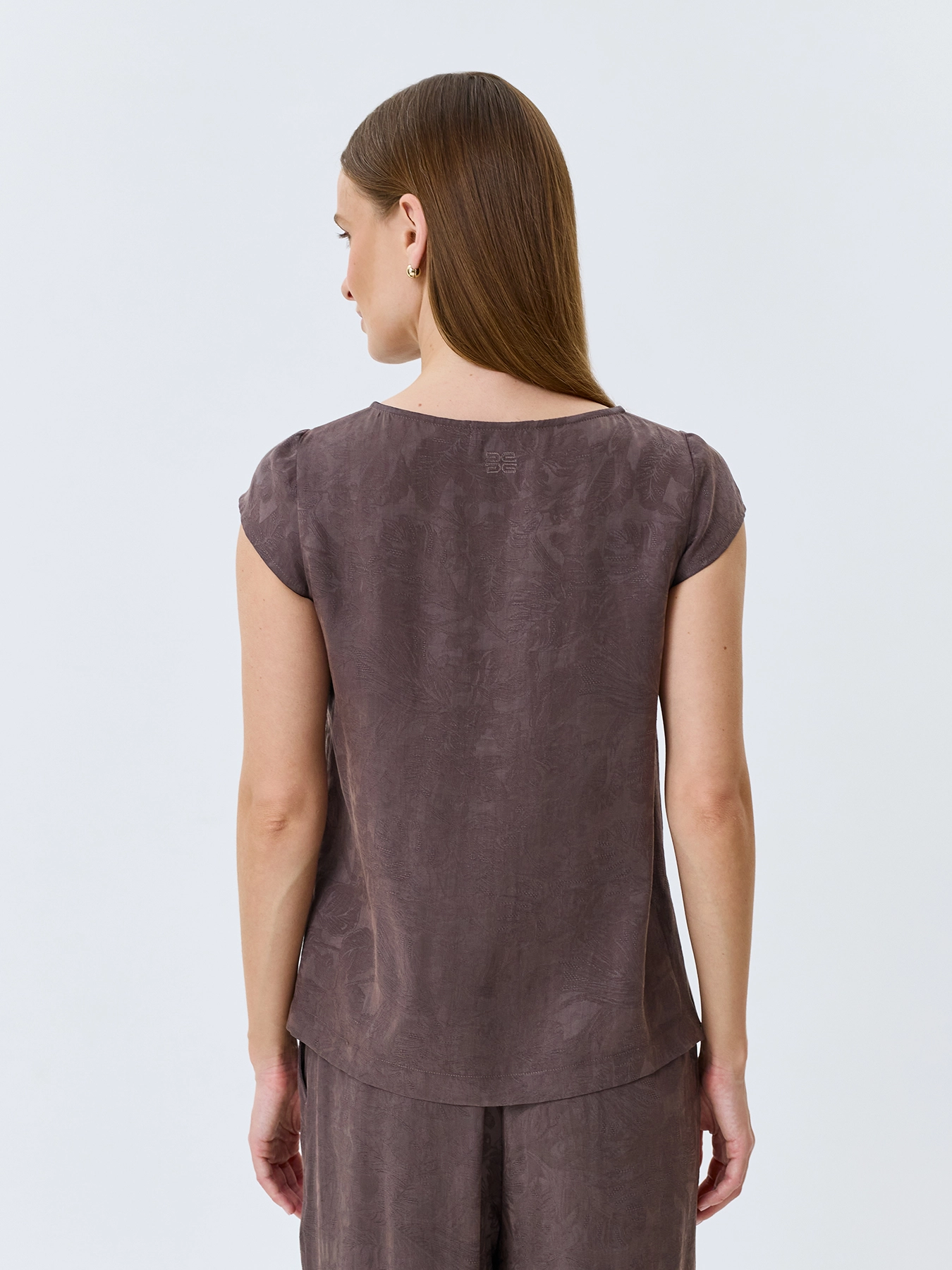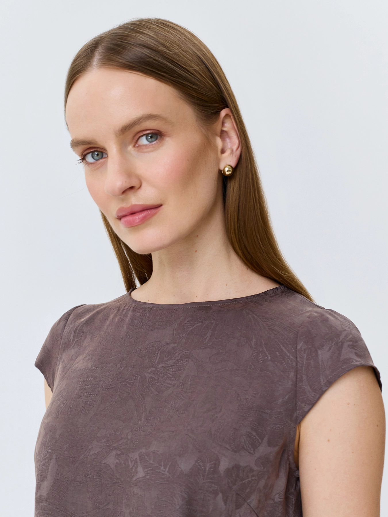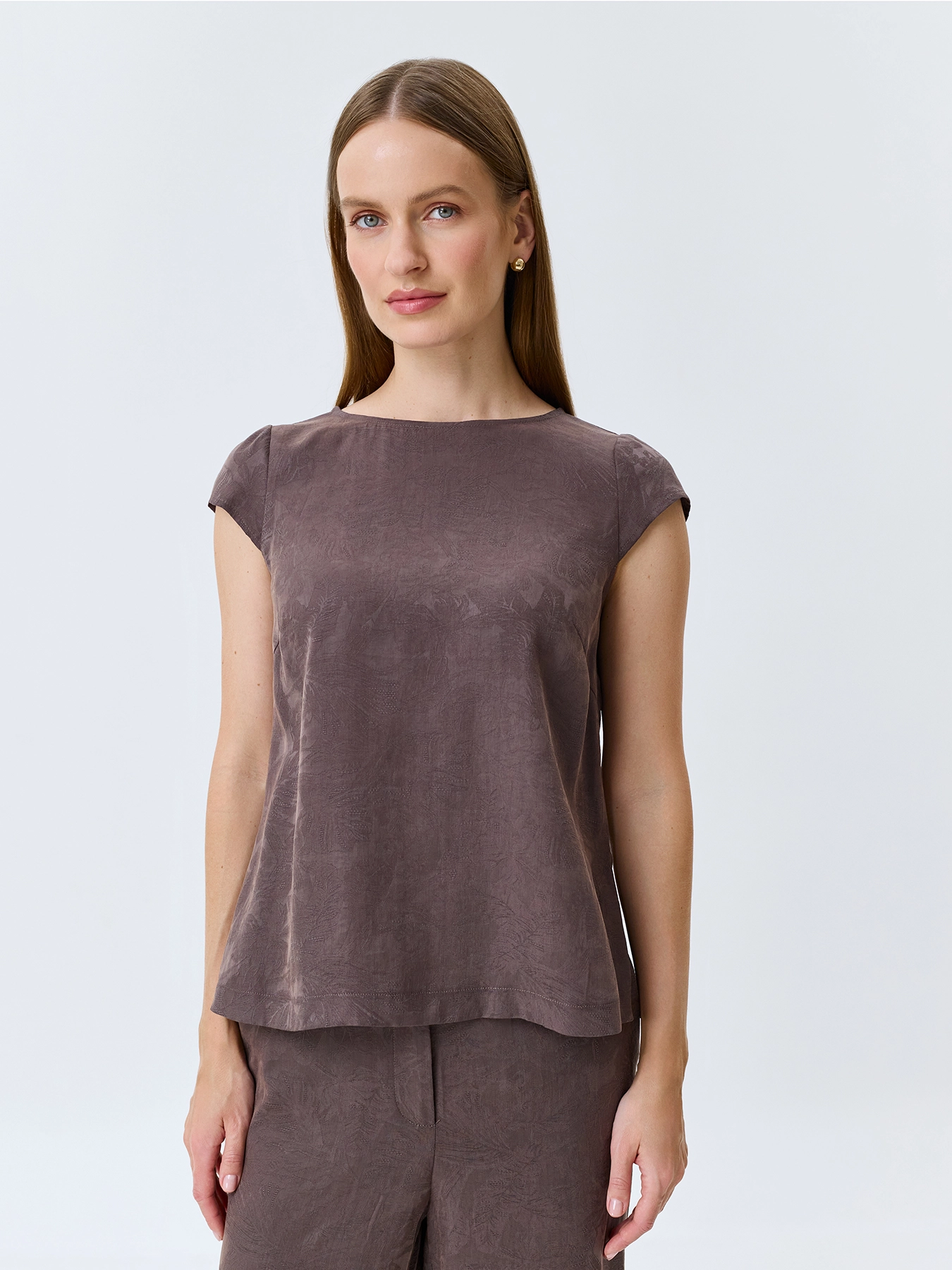 Жаккардовый топ из лиоцелла и льна. Прямой силуэт. Круглый вырез. Короткие рукава-крылышки. Дополнен деликатными разрезами в боковых швах. Комплект с 4267423.