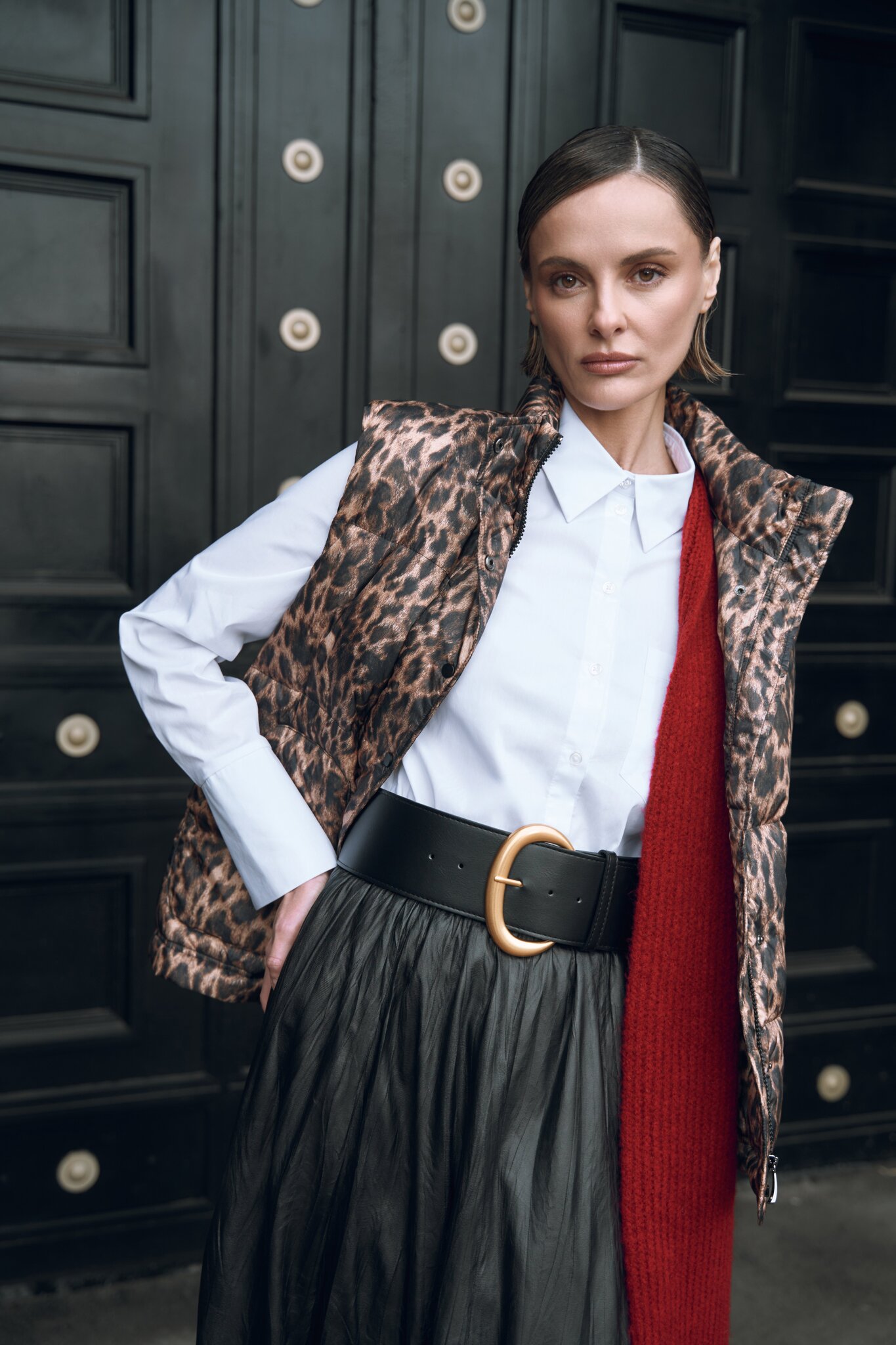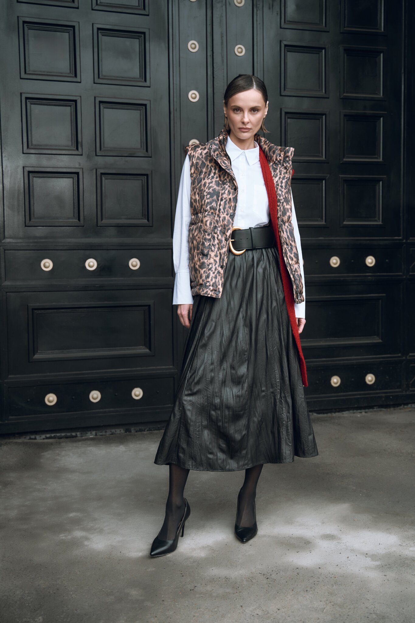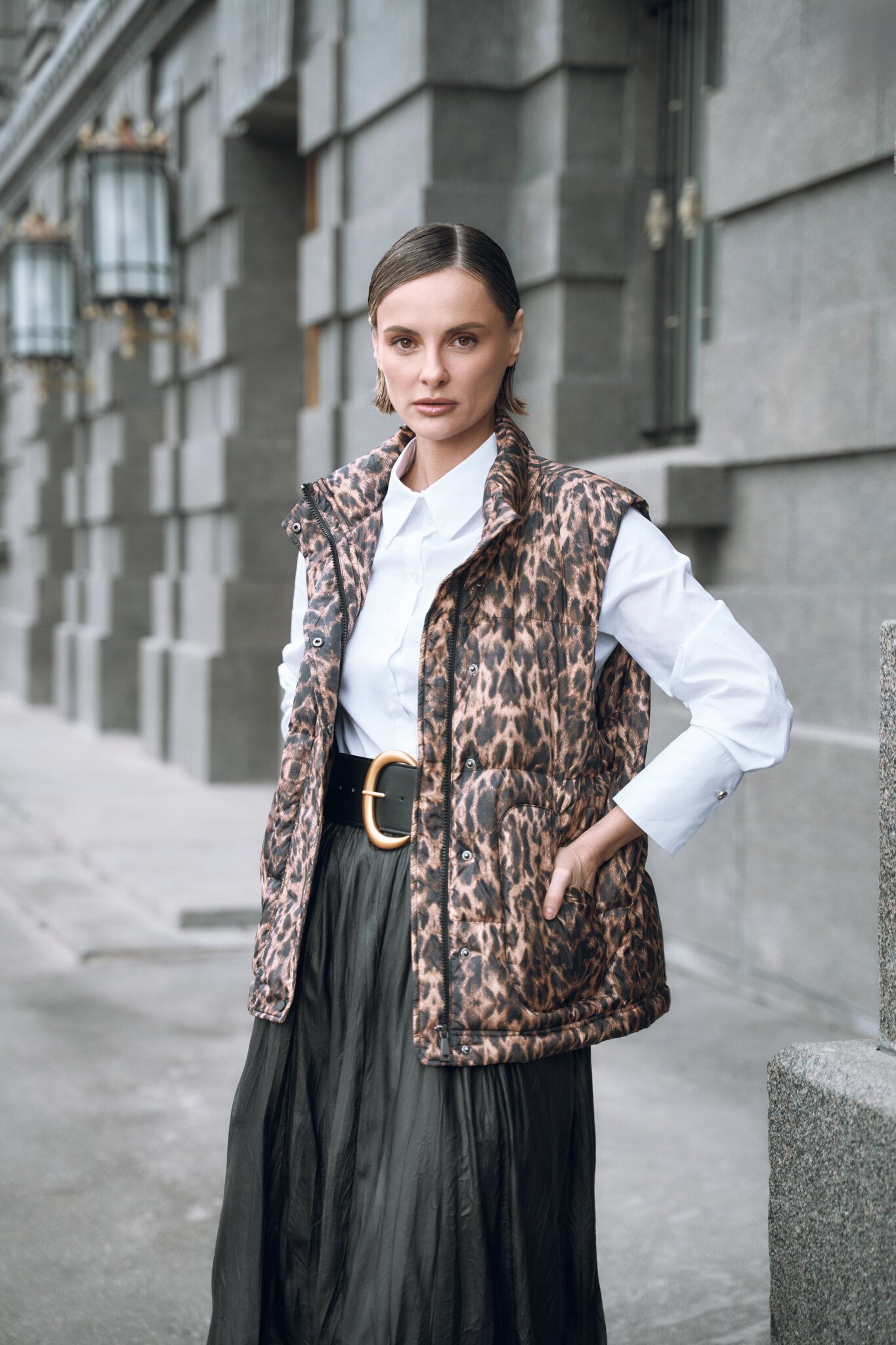 Утепленный жилет с ярким анималистичным принтом. Прямой силуэт. Воротник стойка. Застежка на молнию и планку с кнопками. Боковые карманы с листочками. Резинка-утяжник по низу. В качестве утеплителя натуральный пух .