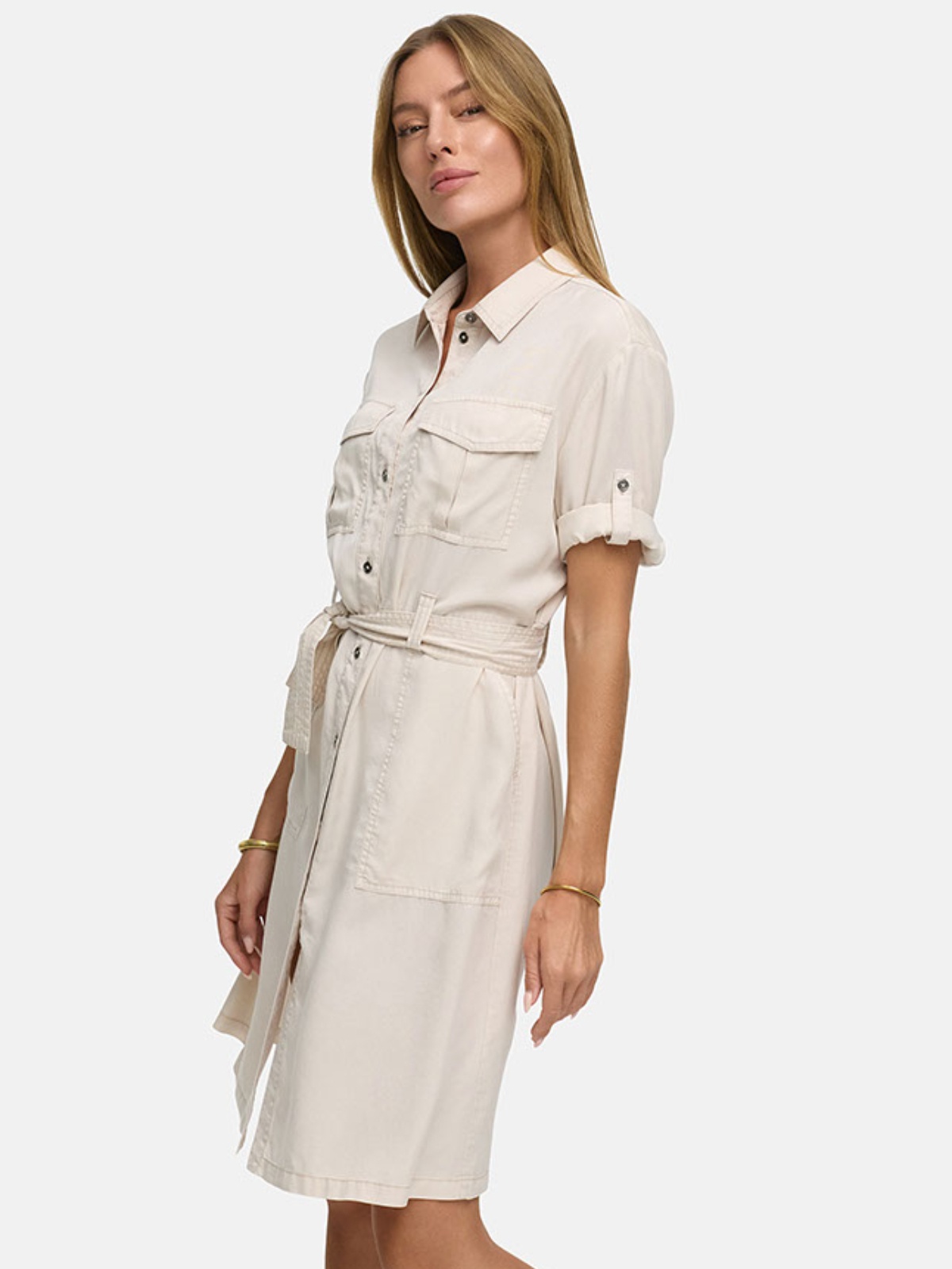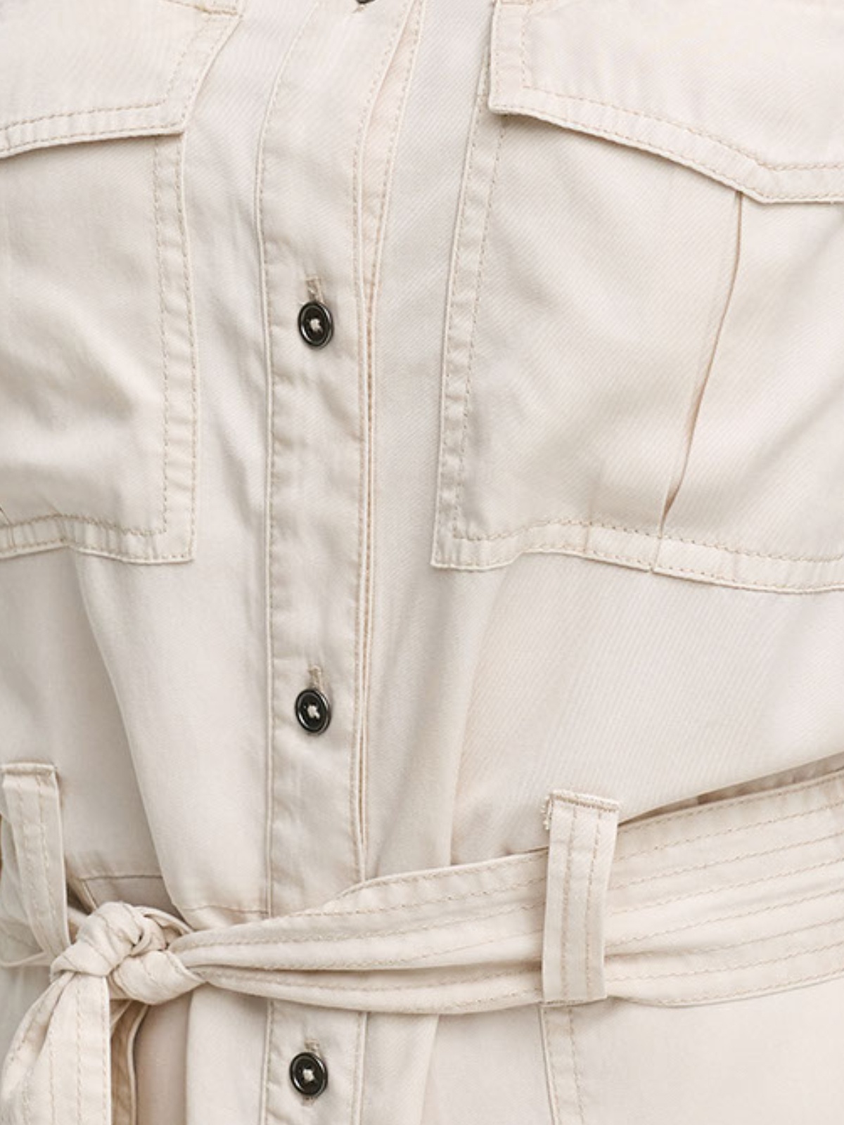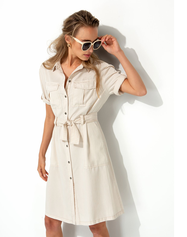 Стильный вид платья создается за счет сочетания двух нагрудных и двух боковых карманов, а также практичного пояса. Рукава легко закатываются, создавая непринужденный образ в стиле сафари.