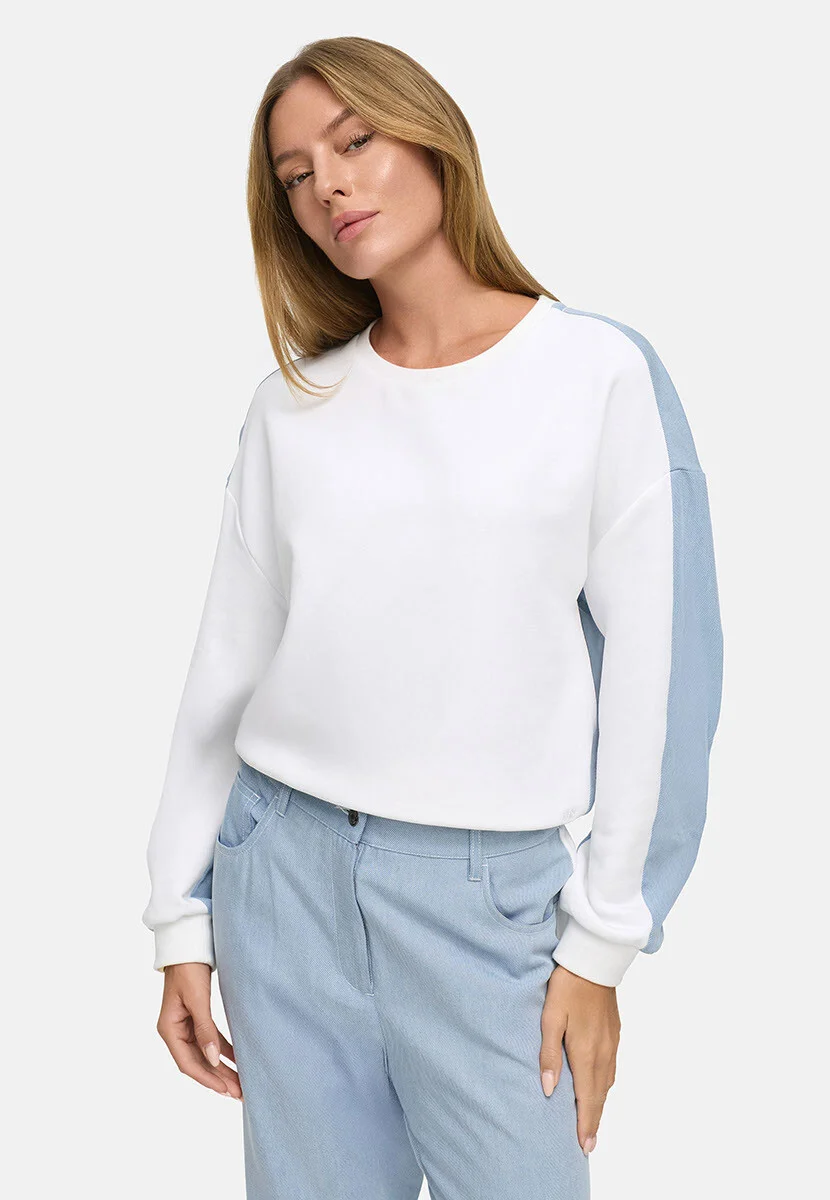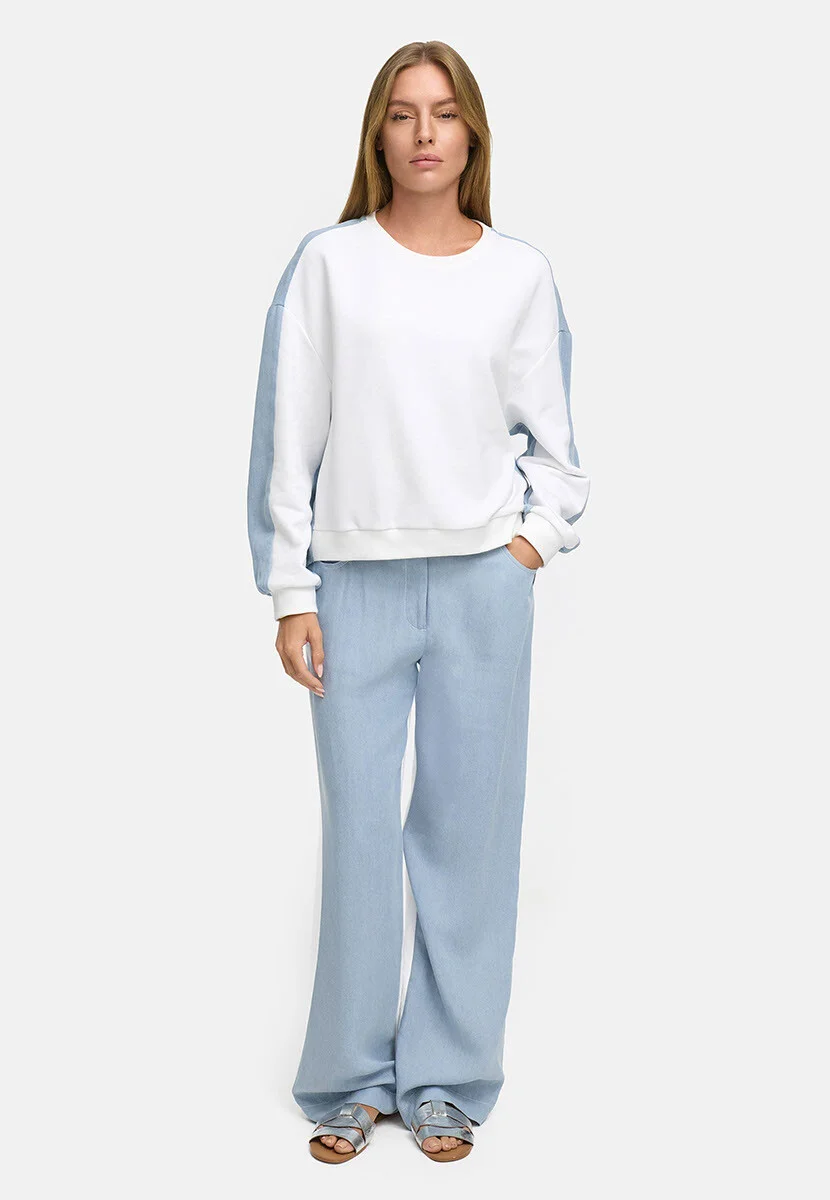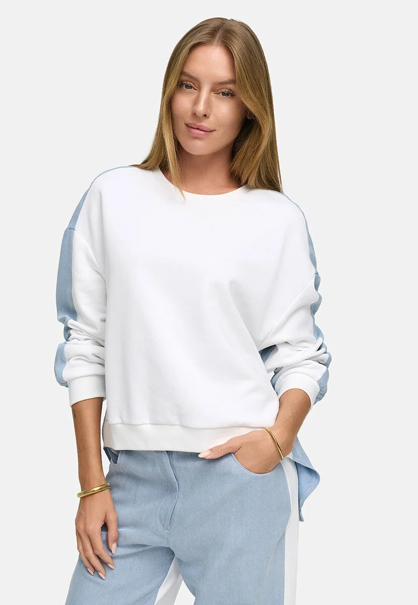 Это потрясающая толстовка, белая спереди и джинсовая сзади. Она идеально подойдет, если вы ищете что-то для многослойной одежды, что можно сочетать со многими вещами. Толстовка имеет длинные рукава, двухцветную расцветку — белую и джинсовую, круглый вырез горловины, короткую спереди и длинную сзади, а также стандартный крой.