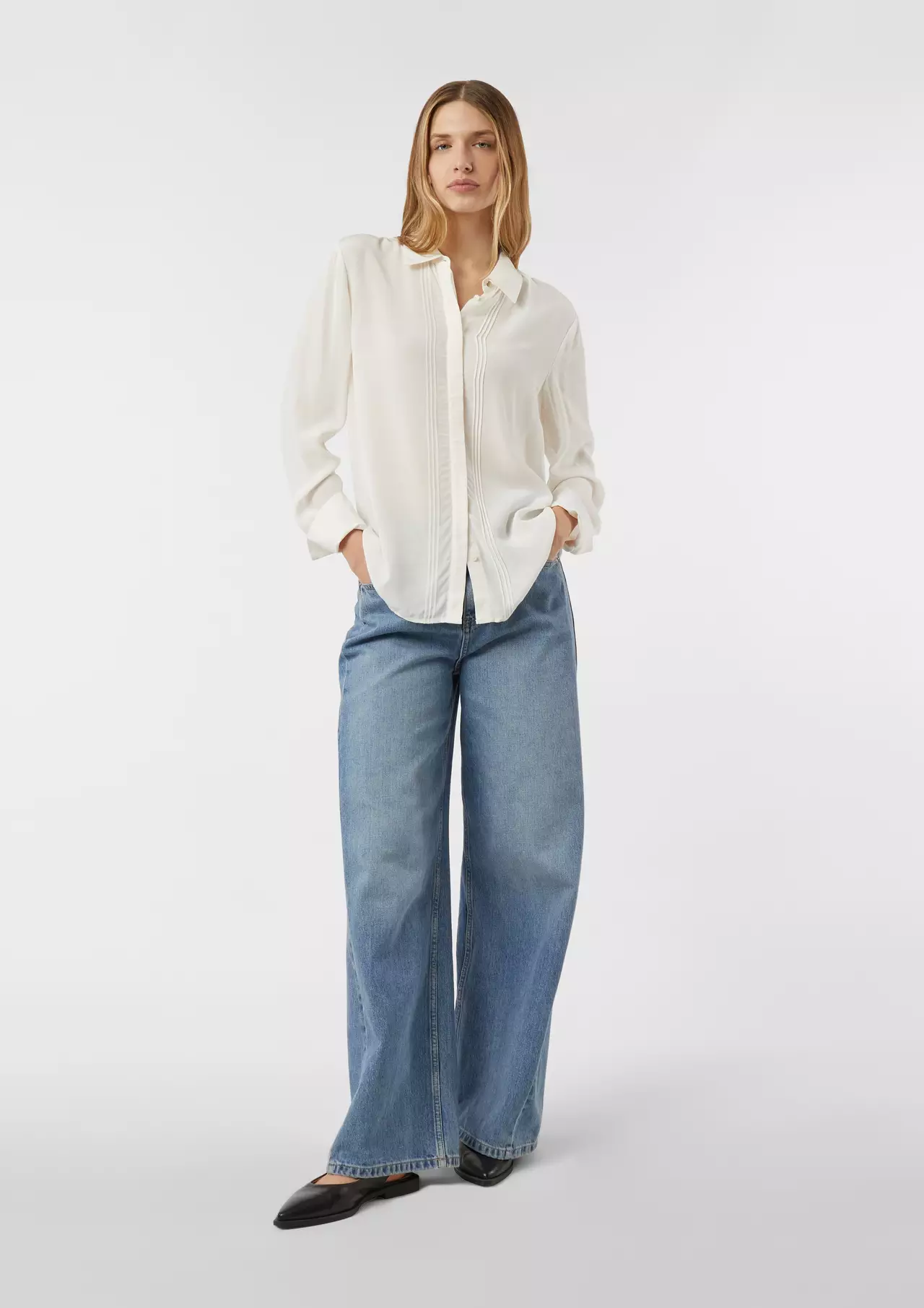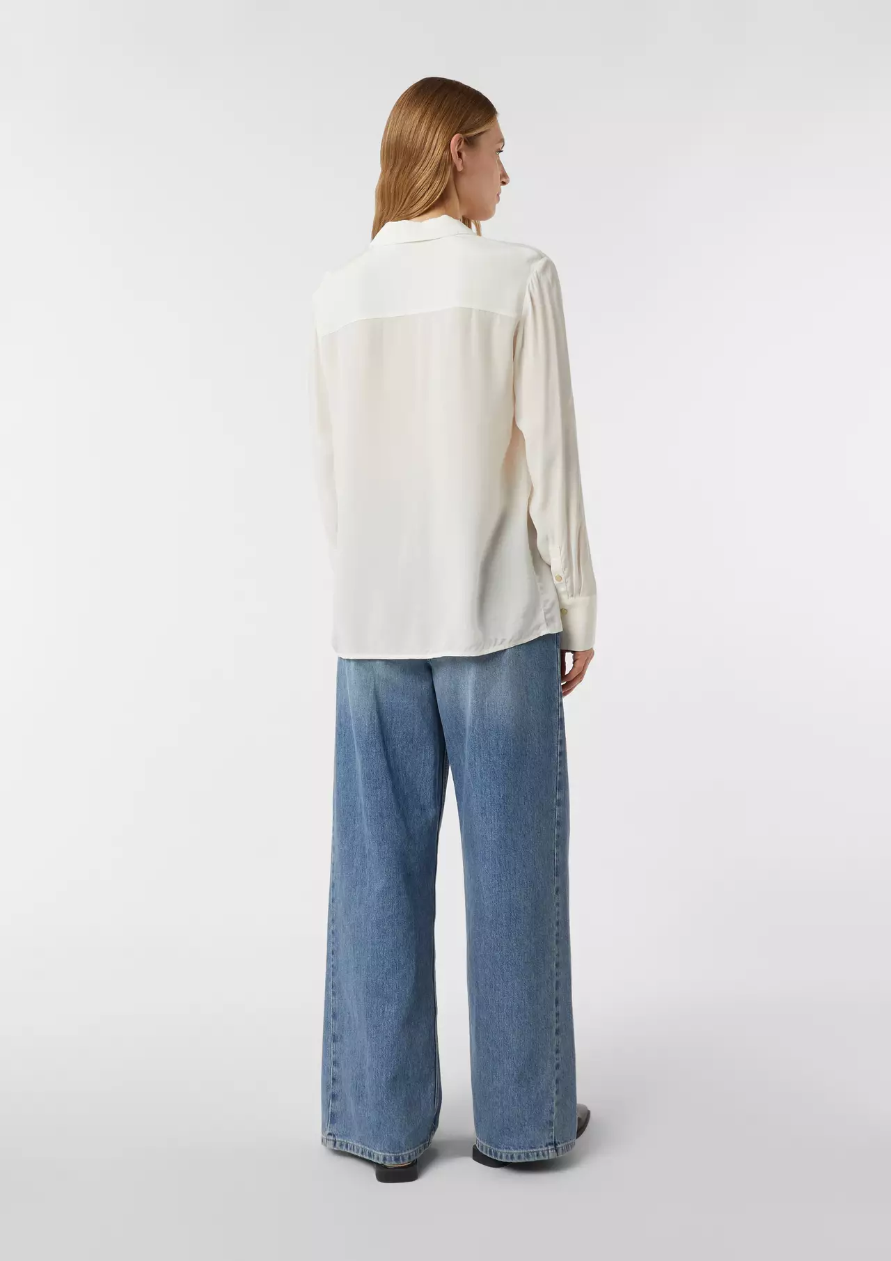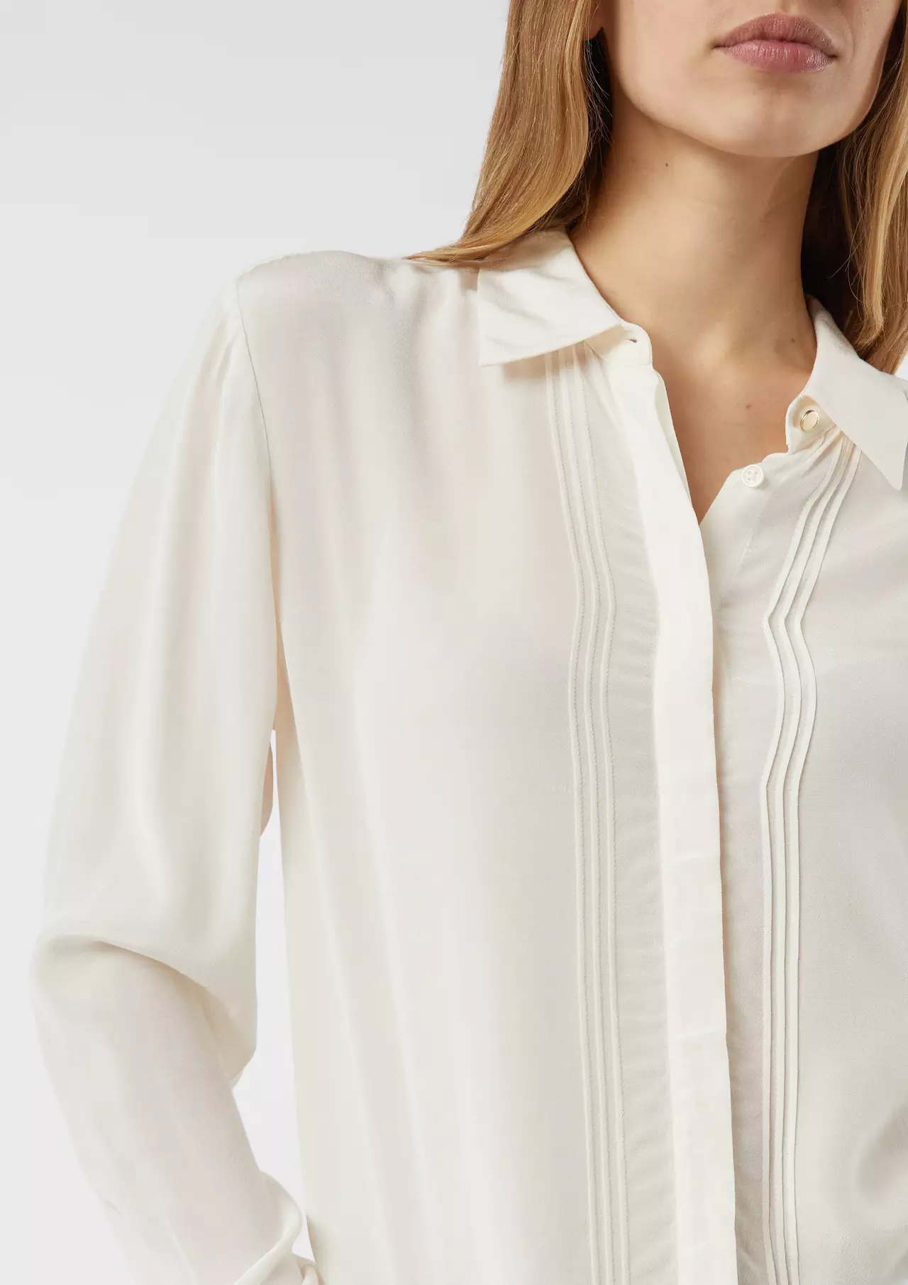 Эта блузка из полупрозрачного вискозного крепа сочетает в себе утонченную элегантность и непринужденный стиль. Классический воротник-стойка и потайная планка на пуговицах создают изысканный силуэт, а аккуратные защипы добавляют изысканных текстурных деталей. Эта модель без подкладки идеально подходит для того, чтобы носить ее под приталенным блейзером или отдельно в теплые дни. Сочетайте ее с классическими брюками для официальных мероприятий или с джинсами для непринужденного образа выходного дня.