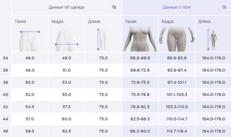 Размерная сетка: