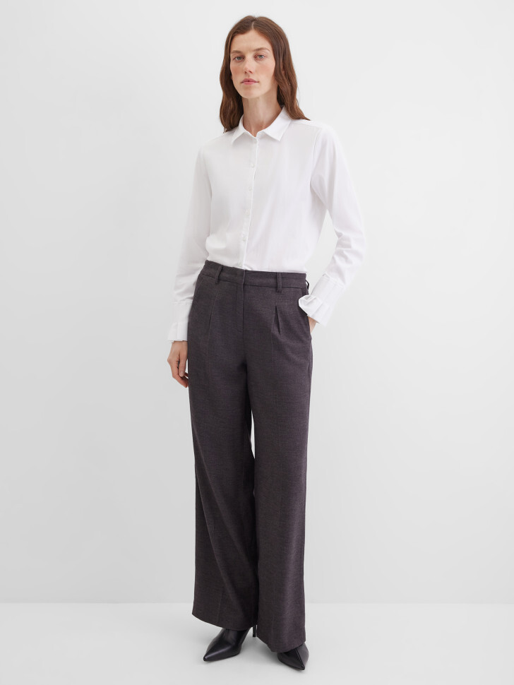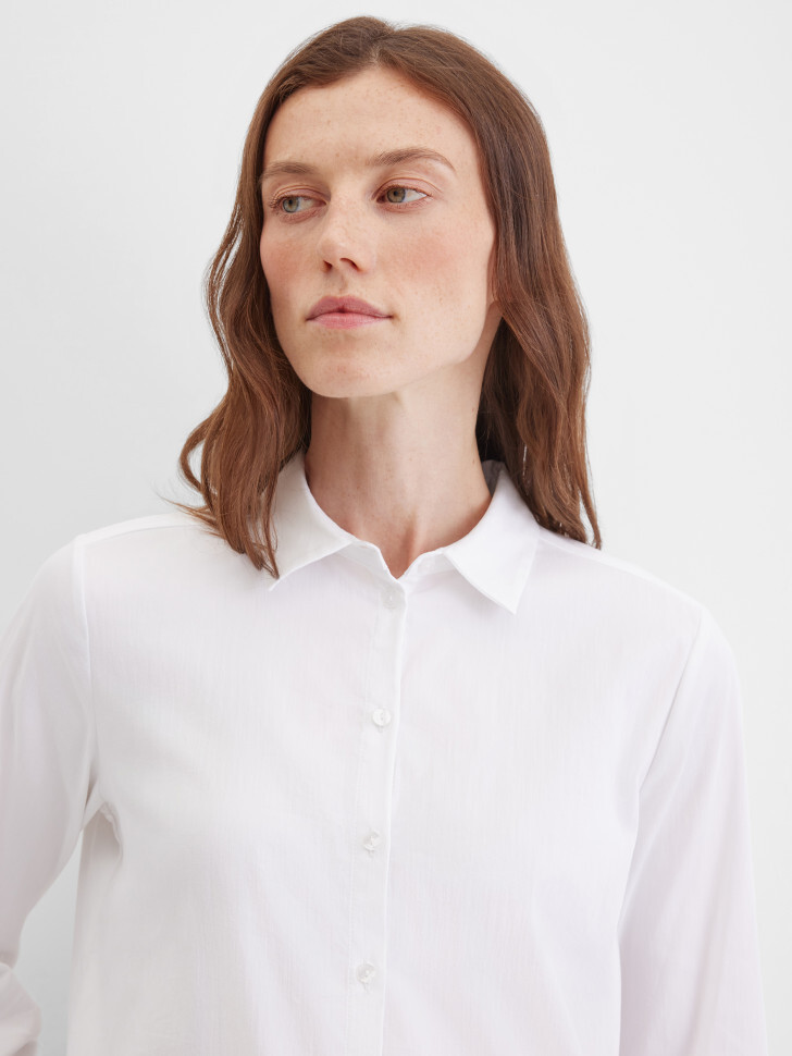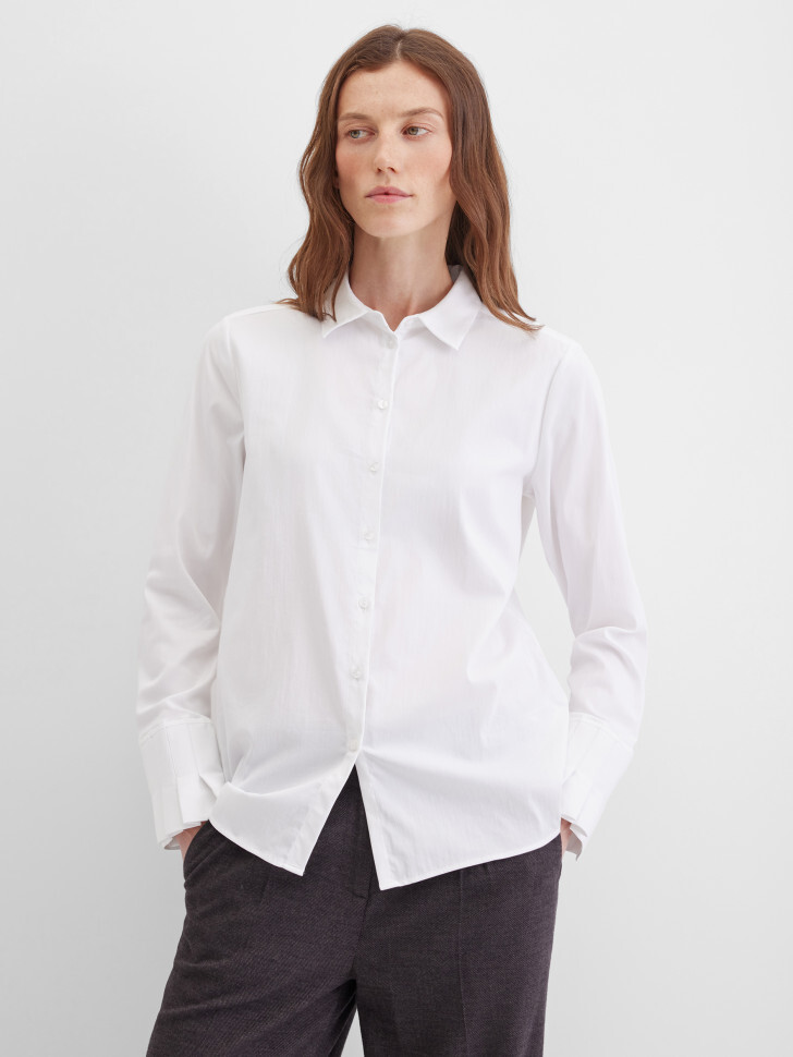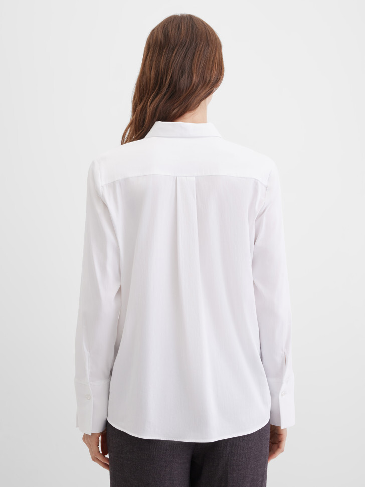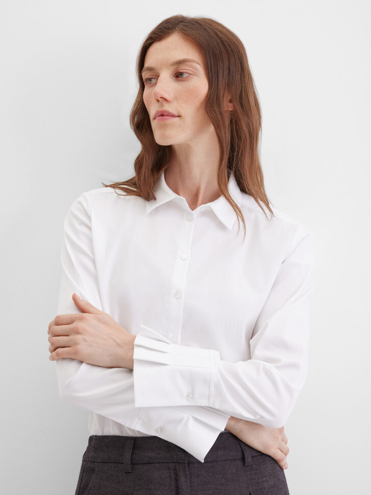 Универсальная стильная блузка-рубашка прямого кроя из мягкого смесового хлопка, приятного к телу и удобного в носке. Модель застегивается на аккуратные пуговицы и дополнена длинными втачными рукавами с манжетами на пуговицах. Особым акцентом служит изящная отделка плиссе на манжетах, которая придает женственность и оригинальность привычному классическому силуэту. Отложной воротник добавляет строгости и делового шарма, а кокетка сзади с мягким защипом обеспечивает свободную посадку и комфорт в движении.