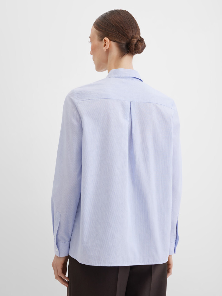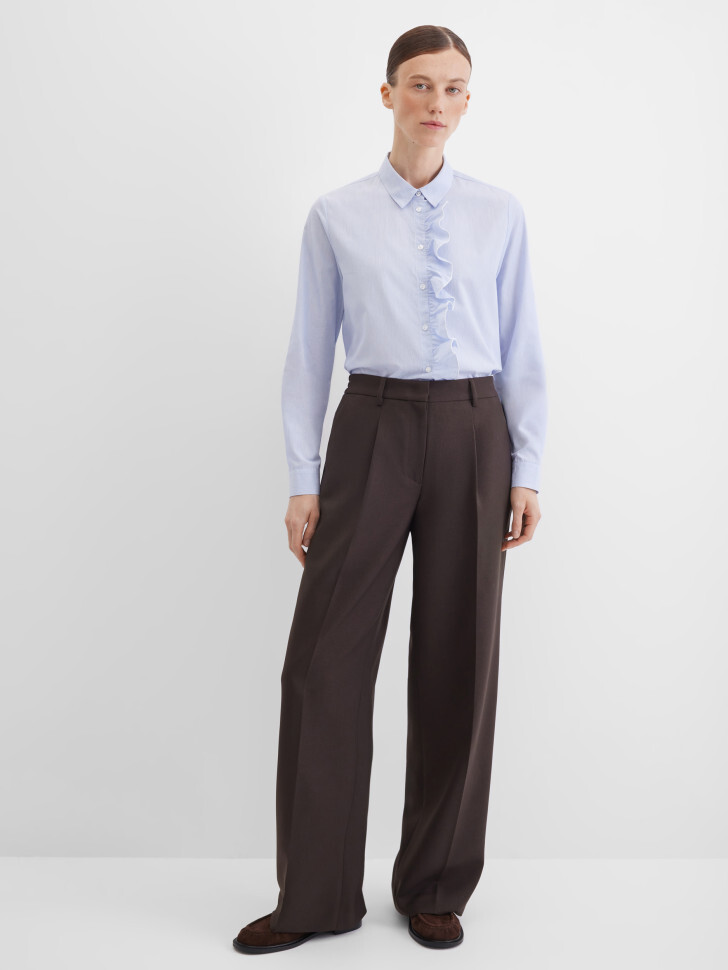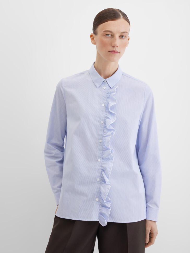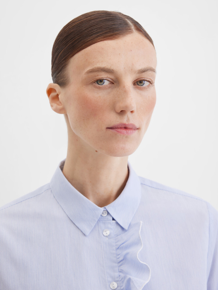 Нежная блузка-рубашка прямого кроя из натурального хлопка в мелкую полоску. Легкая и воздухопроницаемая ткань делает модель особенно комфортной для ежедневной носки. Блузка застегивается на пуговицы и дополнена рюшами вдоль планки, создающими романтичный акцент. Длинные рукава с манжетами на пуговицах и отложной воротник придают изделию классический вид, а защип на кокетке сзади делает посадку более точной и удобной.