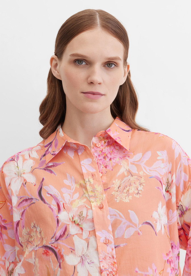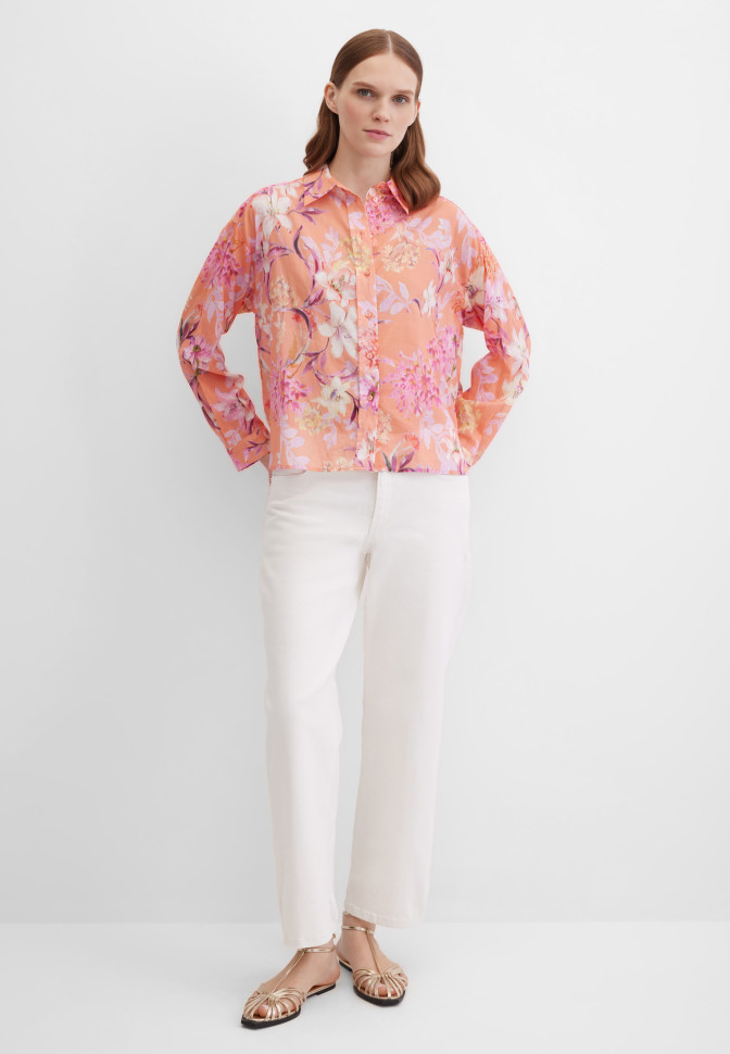 Длина по спинке – 66 см. Свободная блузка оверсайз кроя выполнена из тонкого хлопка с нежным цветочным принтом, создающим лёгкий романтичный образ. Натуральный материал дарит комфорт, лёгкость и дышащий эффект. Модель на пуговицах с отложным воротником и спущенными рукавами, защип по линии кокетки на спинке добавляет плавный комфортный объём силуэту. Удлинённая асимметричная спинка и закруглённый низ визуально стройнят и придают образу динамику. Прекрасный вариант для повседневных луков в стиле casual и бохо.