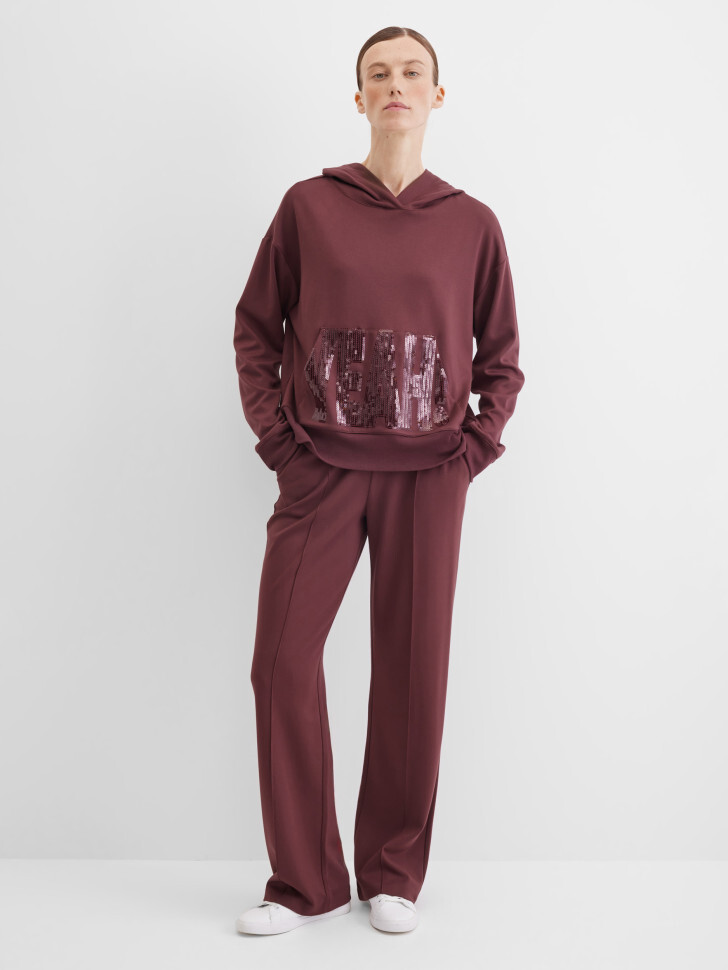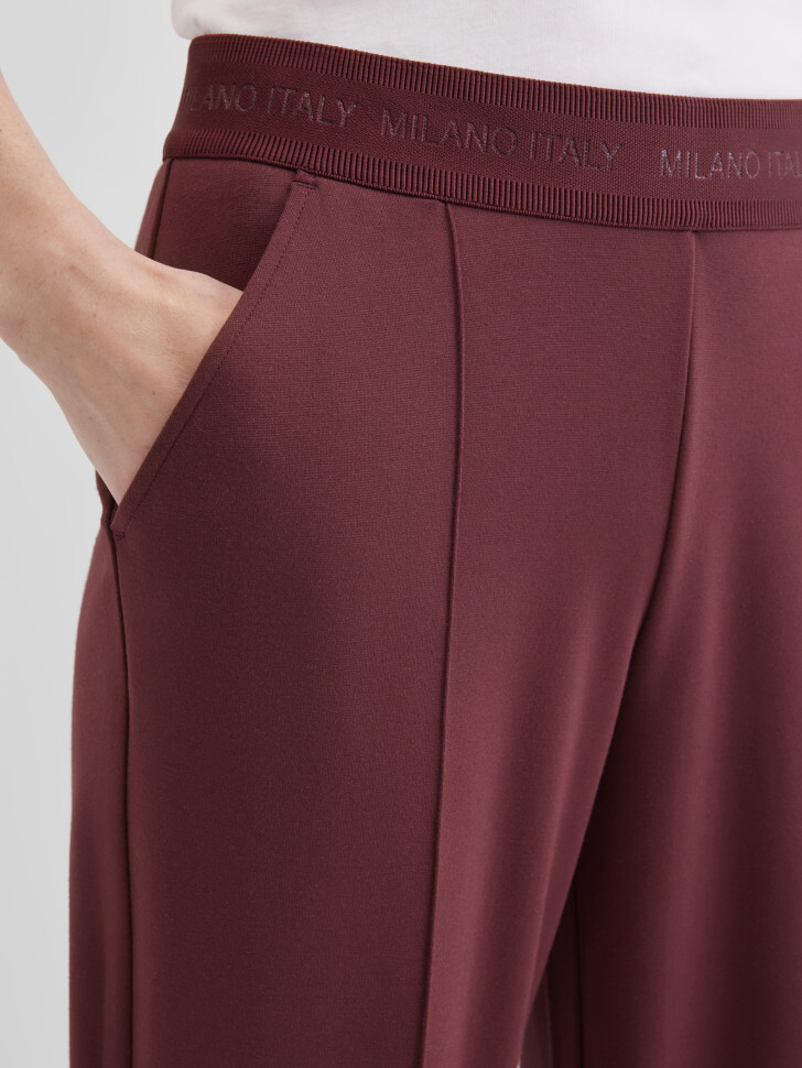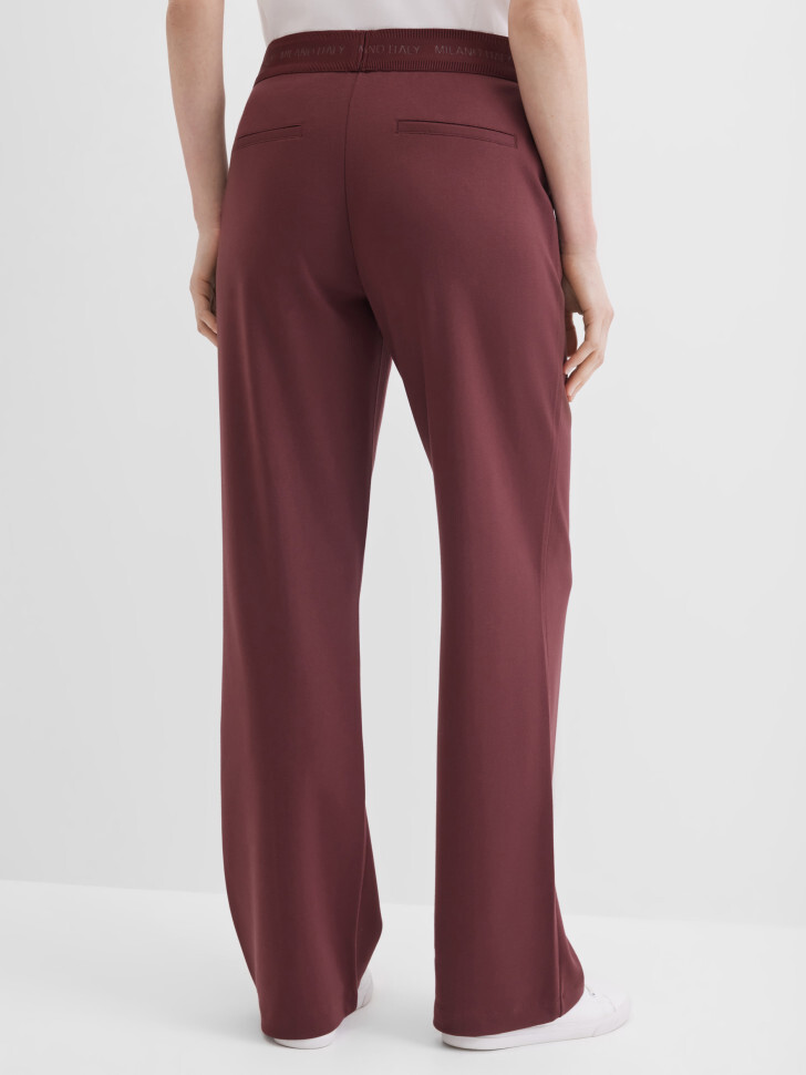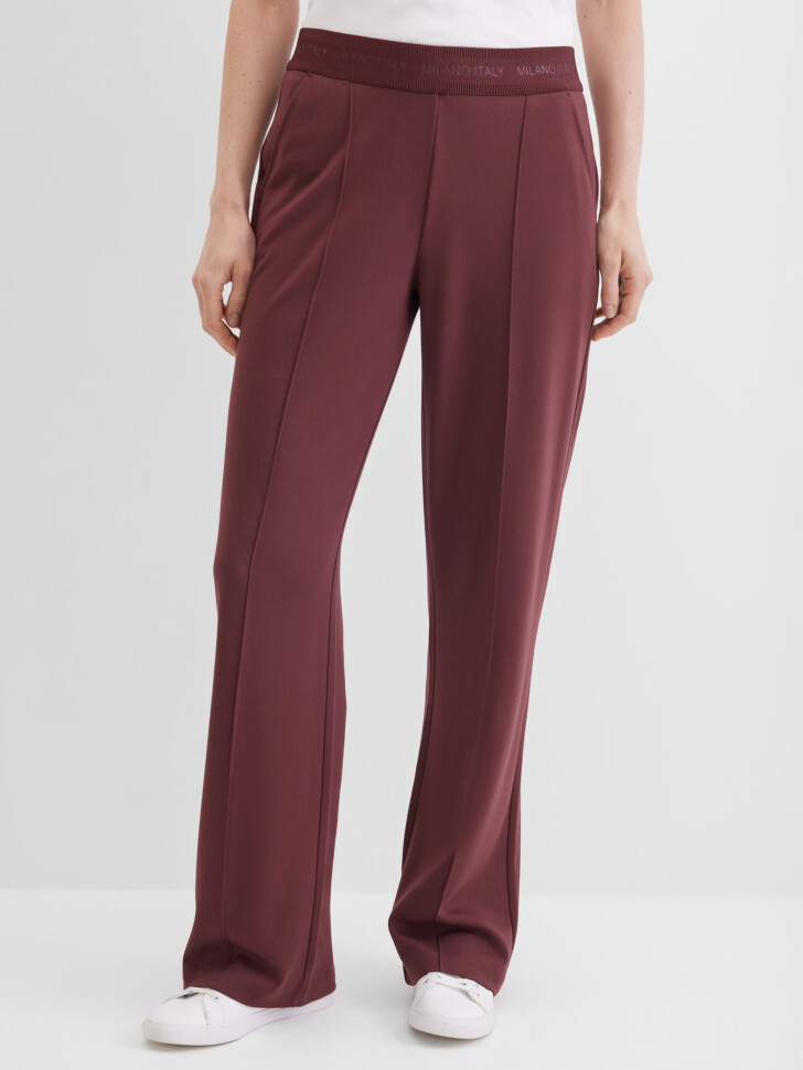 Прямые трикотажные брюки полуприлегающего кроя из мягкой смесовой вискозы. Эластичная брендированная резинка на талии обеспечивает удобную посадку без застёжек и одновременно является стильным акцентом. Отрезные карманы спереди добавляют практичности, ложные сзади дополняют аккуратный силуэт. Застроченные стрелки визуально удлиняют фигуру и делают трикотажные брюки более элегантными .
